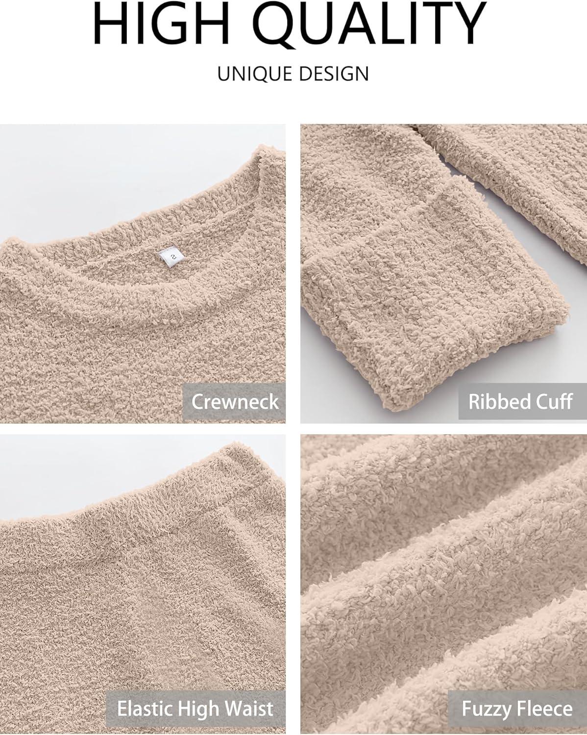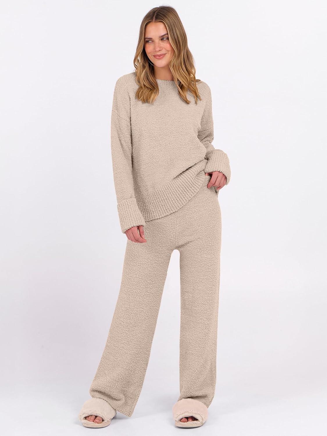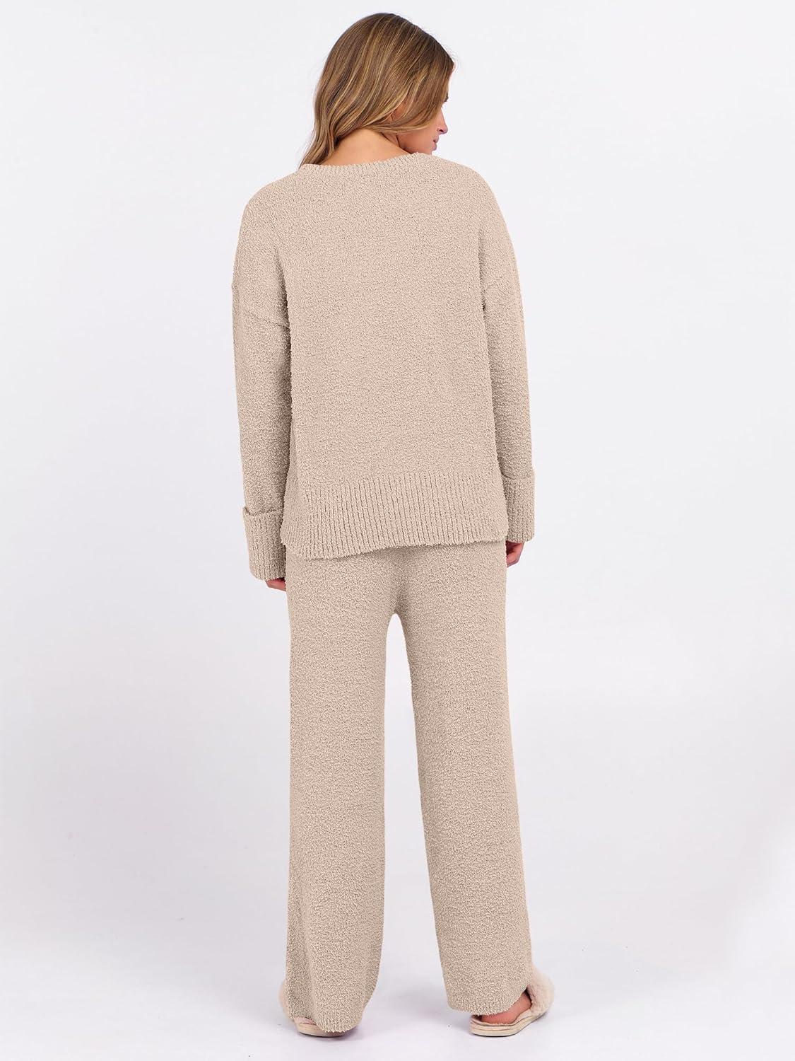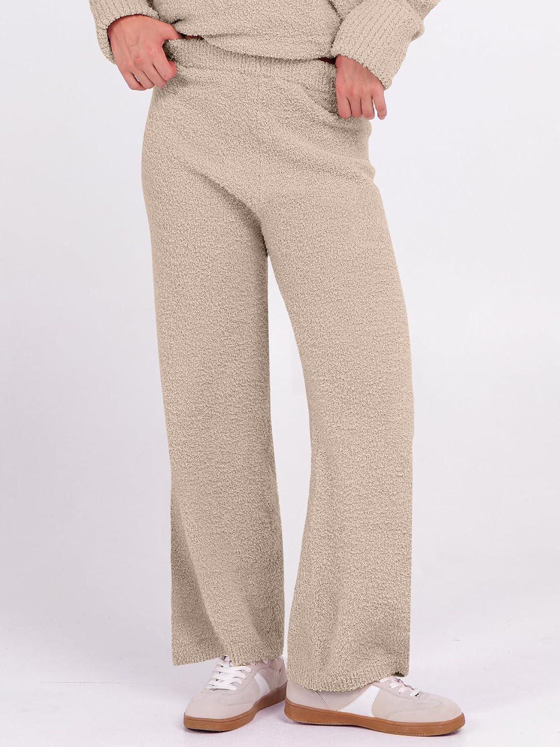 ANRABESS 2 Piece Sets for Women Fall Fuzzy Fleece Pajama Sweater Knit Top Wide Leg Pants Loungewear 2025 Winter Cozy Outfits(Light Khaki)