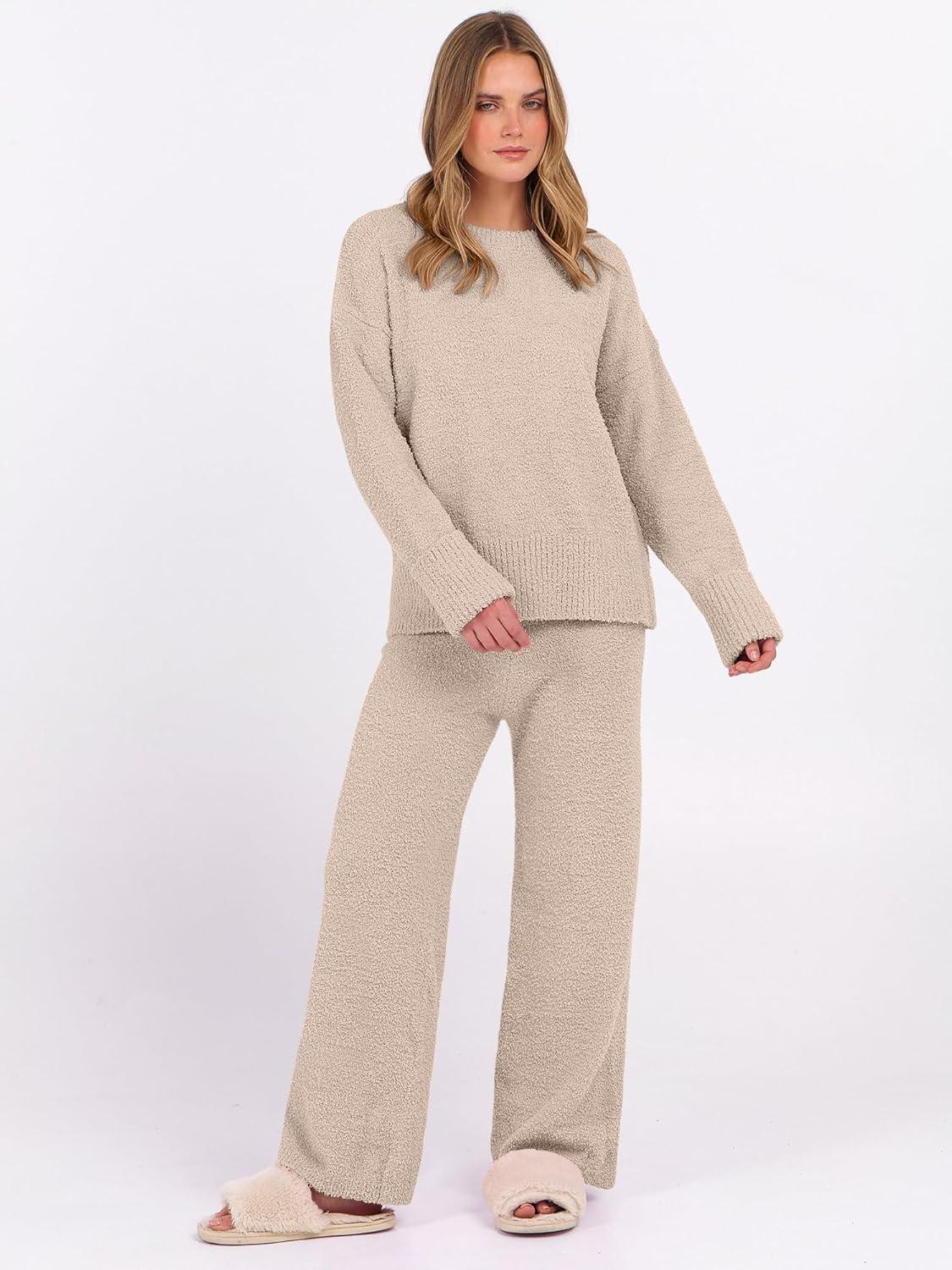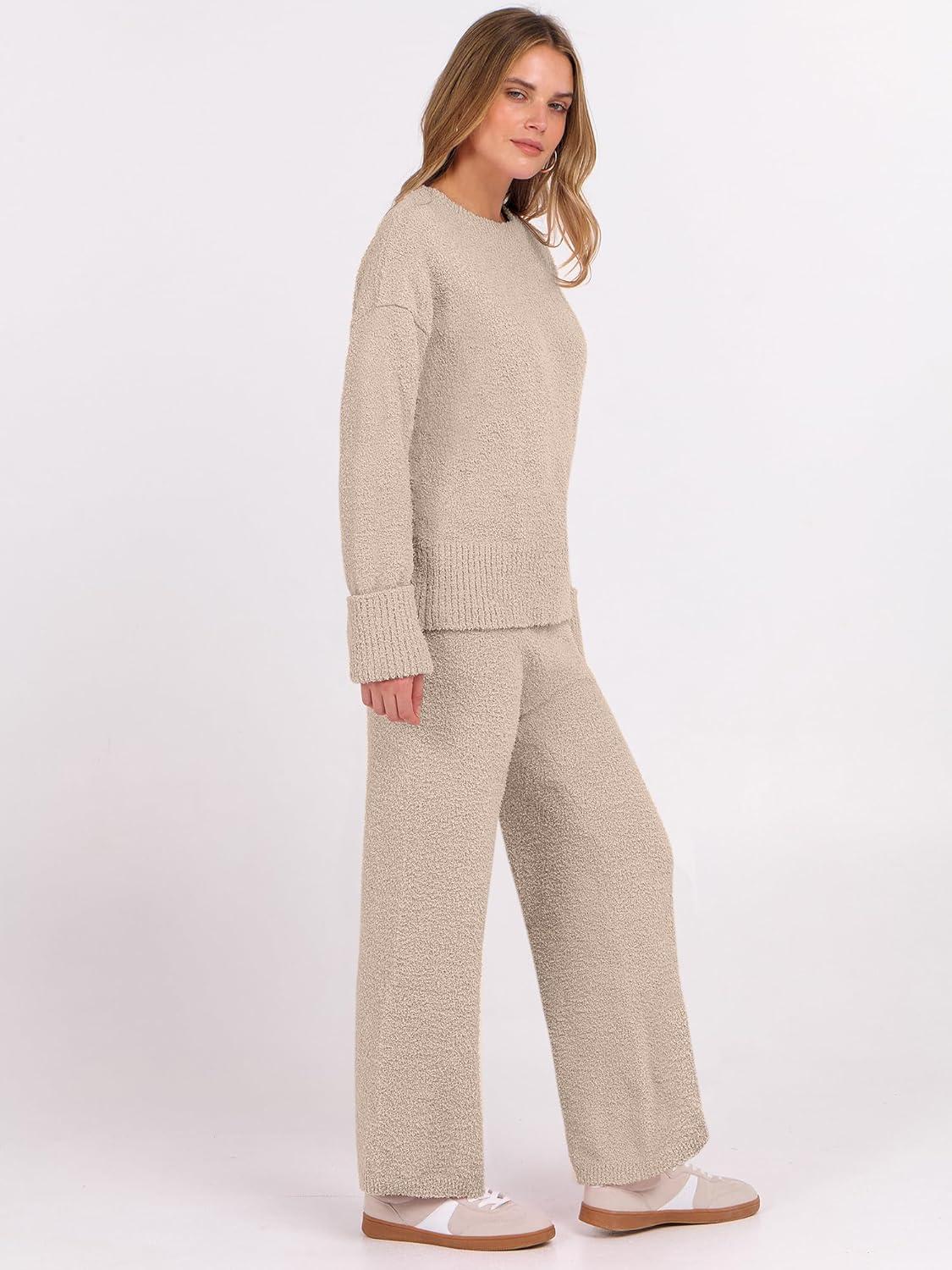 imageANRABESS 2 Piece Sets for Women Fall Fuzzy Fleece Pajama Sweater Knit Top Wide Leg Pants Loungewear 2025 Winter Cozy OutfitsLight Khaki
