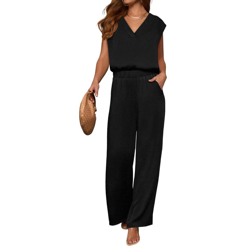 imageANRABESS 2 Piece Sets for Women Lounge Outfits Summer V Neck Cap Sleeve Top Wide Leg Pants Vacation Beach Travel SetBlack