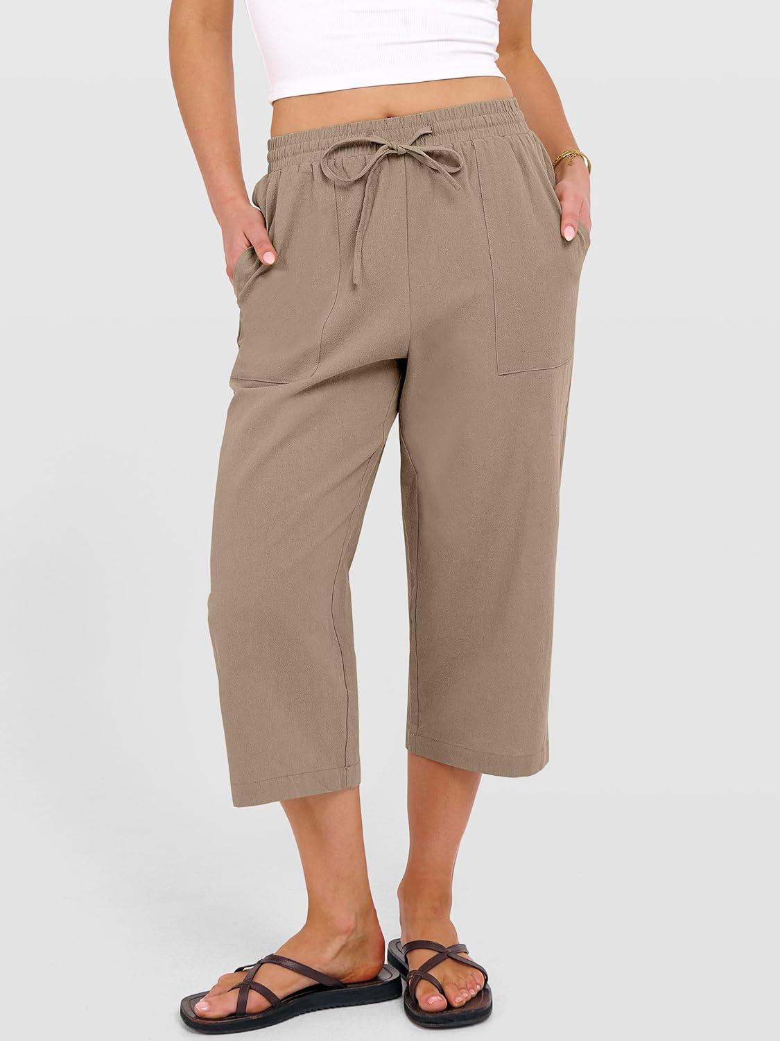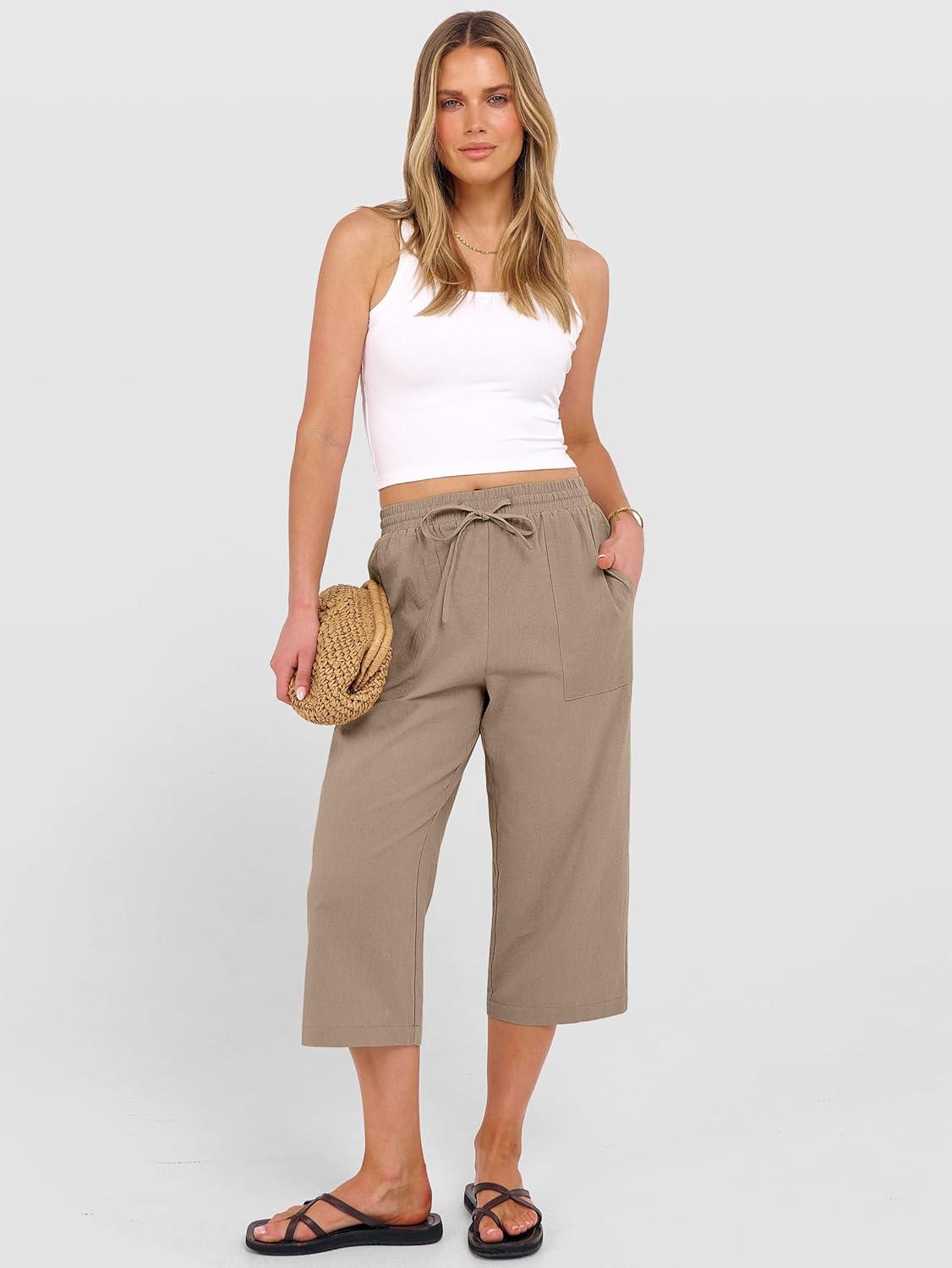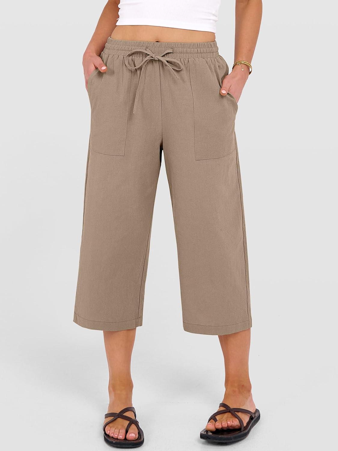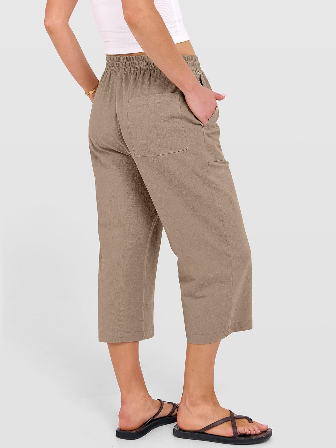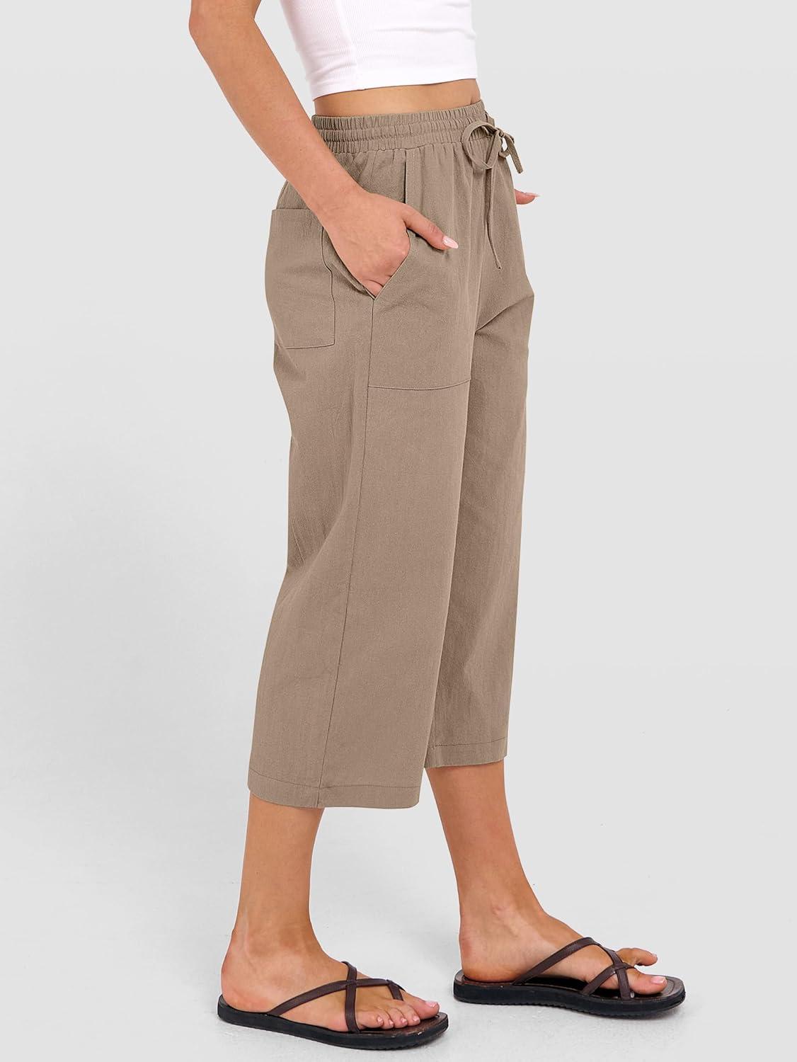 ANRABESS Capris Pants for Women Summer Casual Loose Drawstring Elastic High Waist Straight 2026 Lounge Beach Cropped Trousers(Khaki)