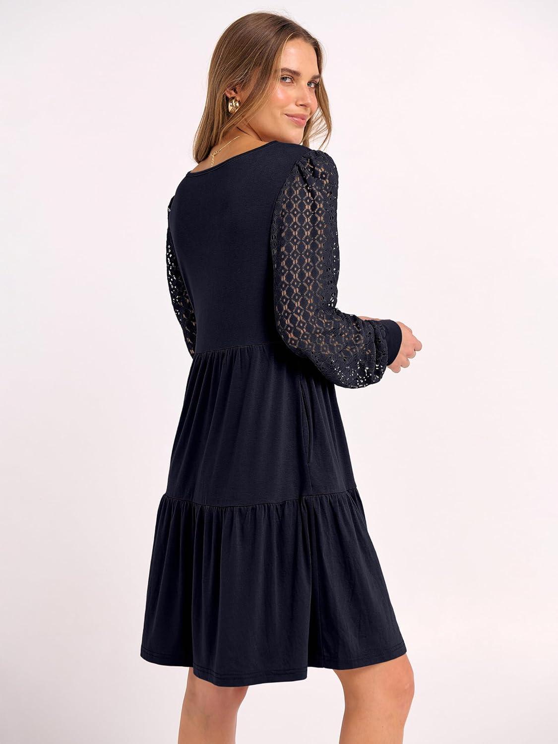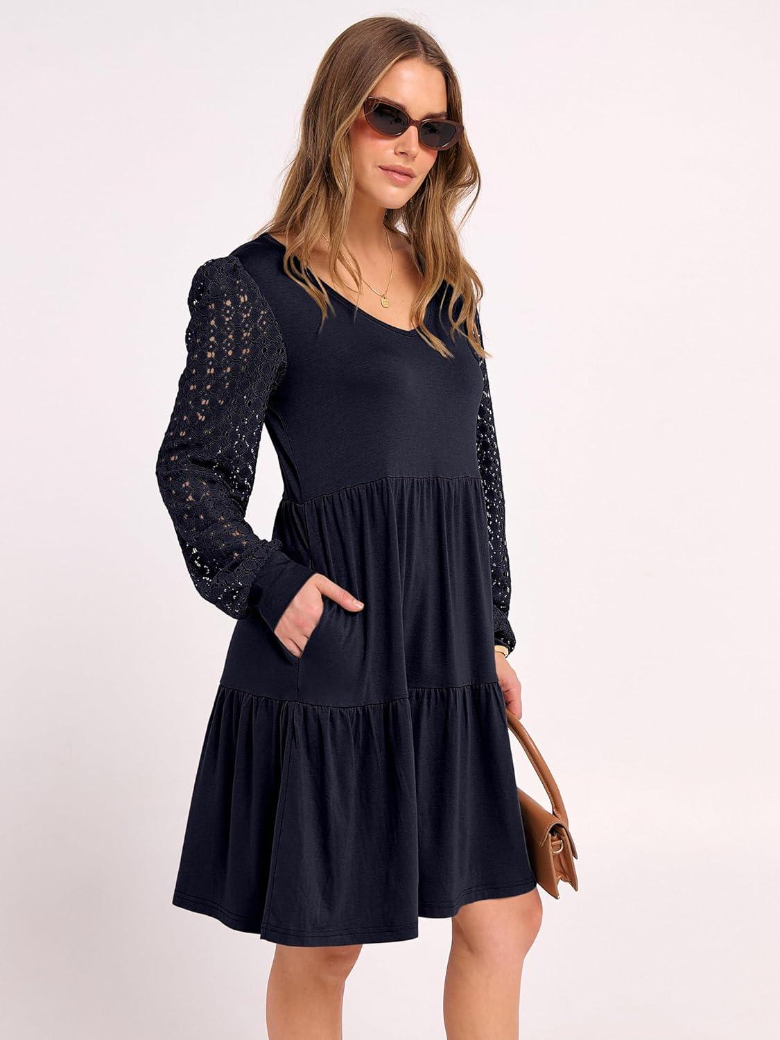 ANRABESS Dresses for Women Casual Lace Long Sleeve V Neck Tiered Swing Flowy Loose A-line Mini Short 2025 Fall Vacation Dress(Navy Blue)