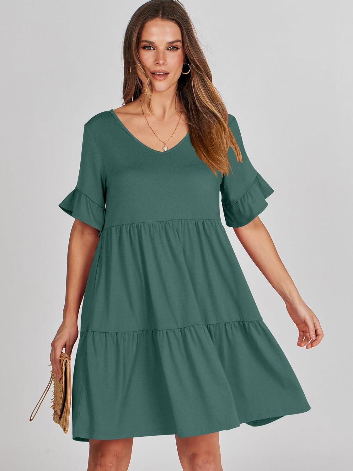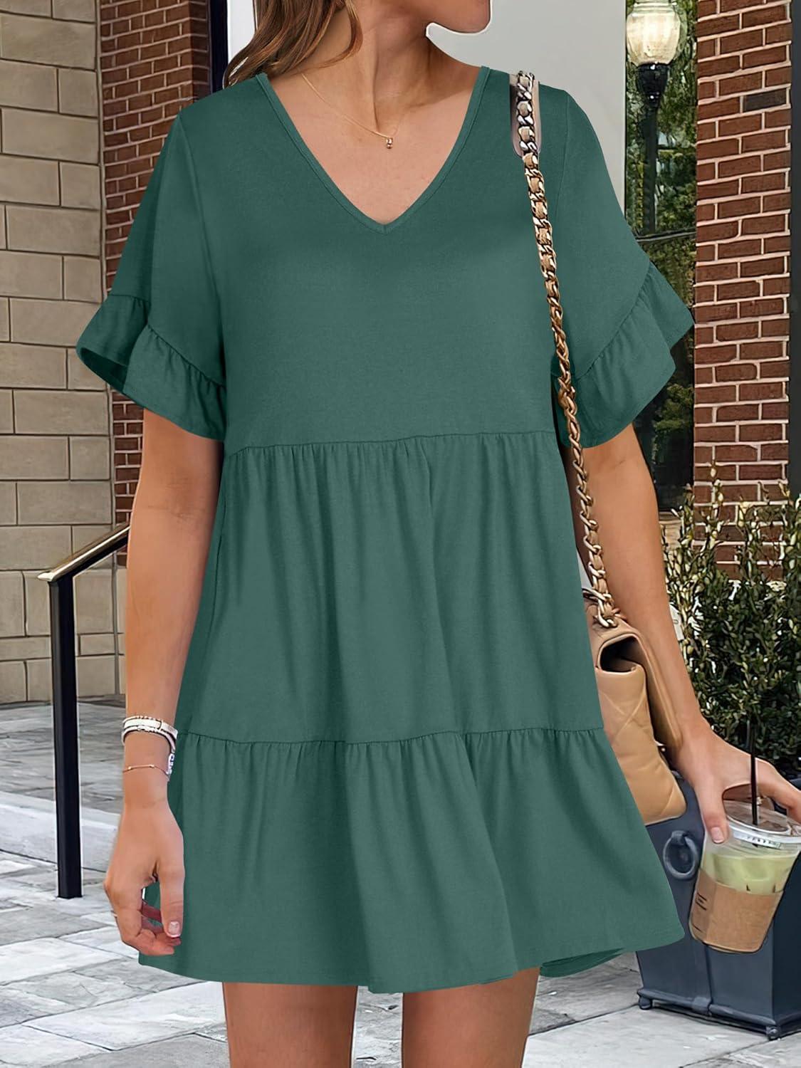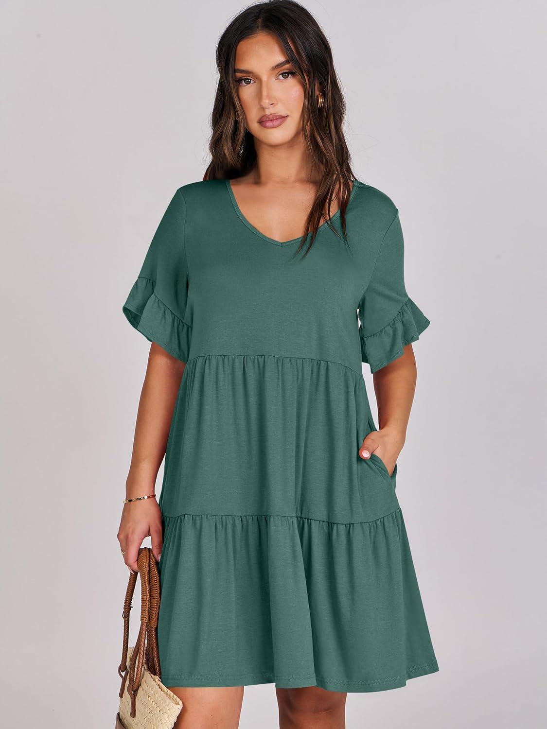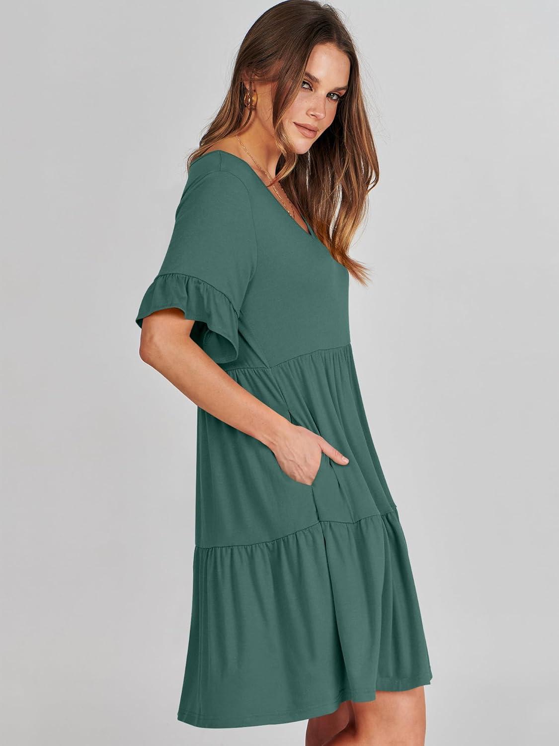 ANRABESS Dresses for Women Summer 2025 V Neck Ruffle Sleeve A Line Tiered Flowy Casual Trendy Mini Beach Dress with Pockets(Green)