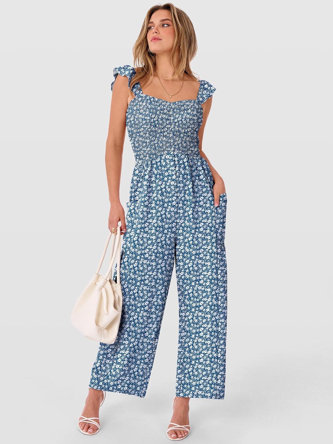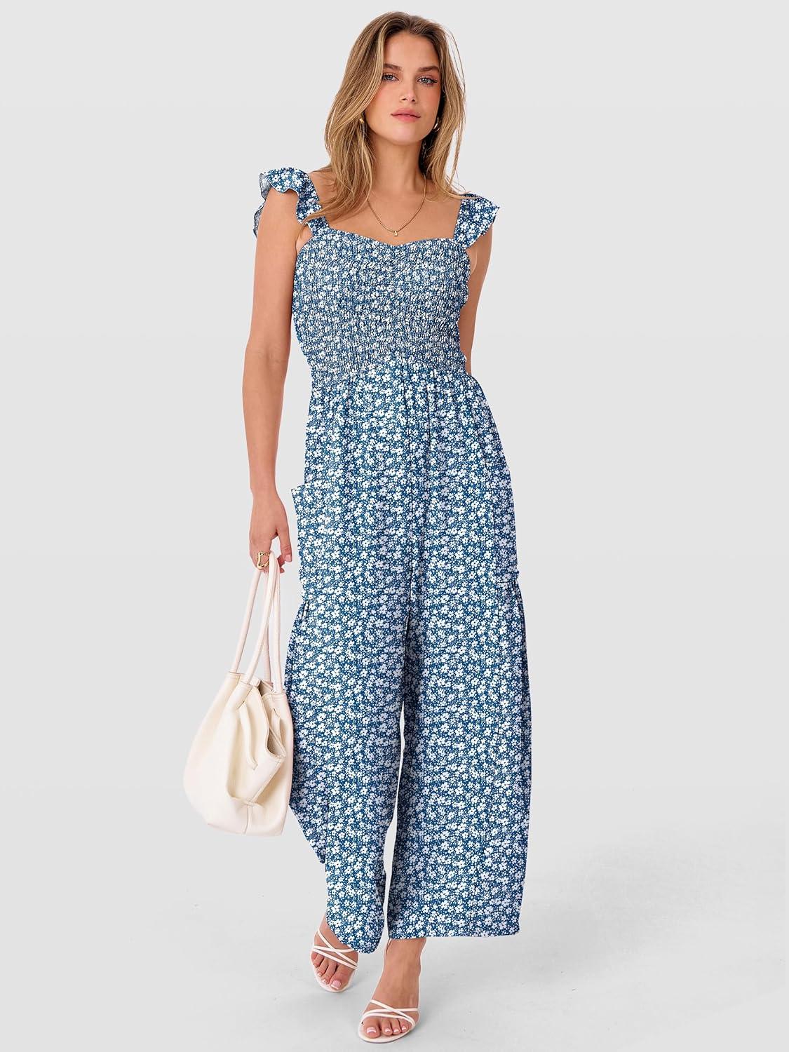 ANRABESS Jumpsuits for Women Dressy One Piece Summer Outfits Wide Leg Sleeveless Smocked Romper Jumpers Casual Beach Overalls(Blue White Floral)