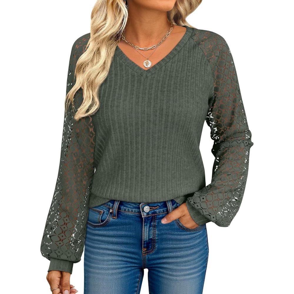 imageANRABESS Lace Long Sleeve Tops for Women 2025 Fall Business Casual V Neck Shirts Work Office Trendy Blouses Fashion OutfitsDeep Green