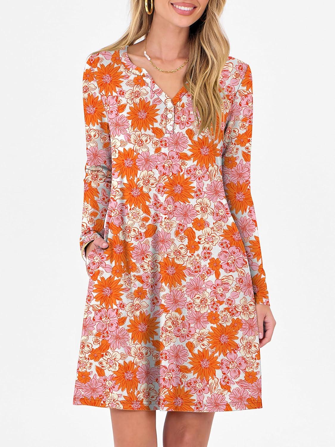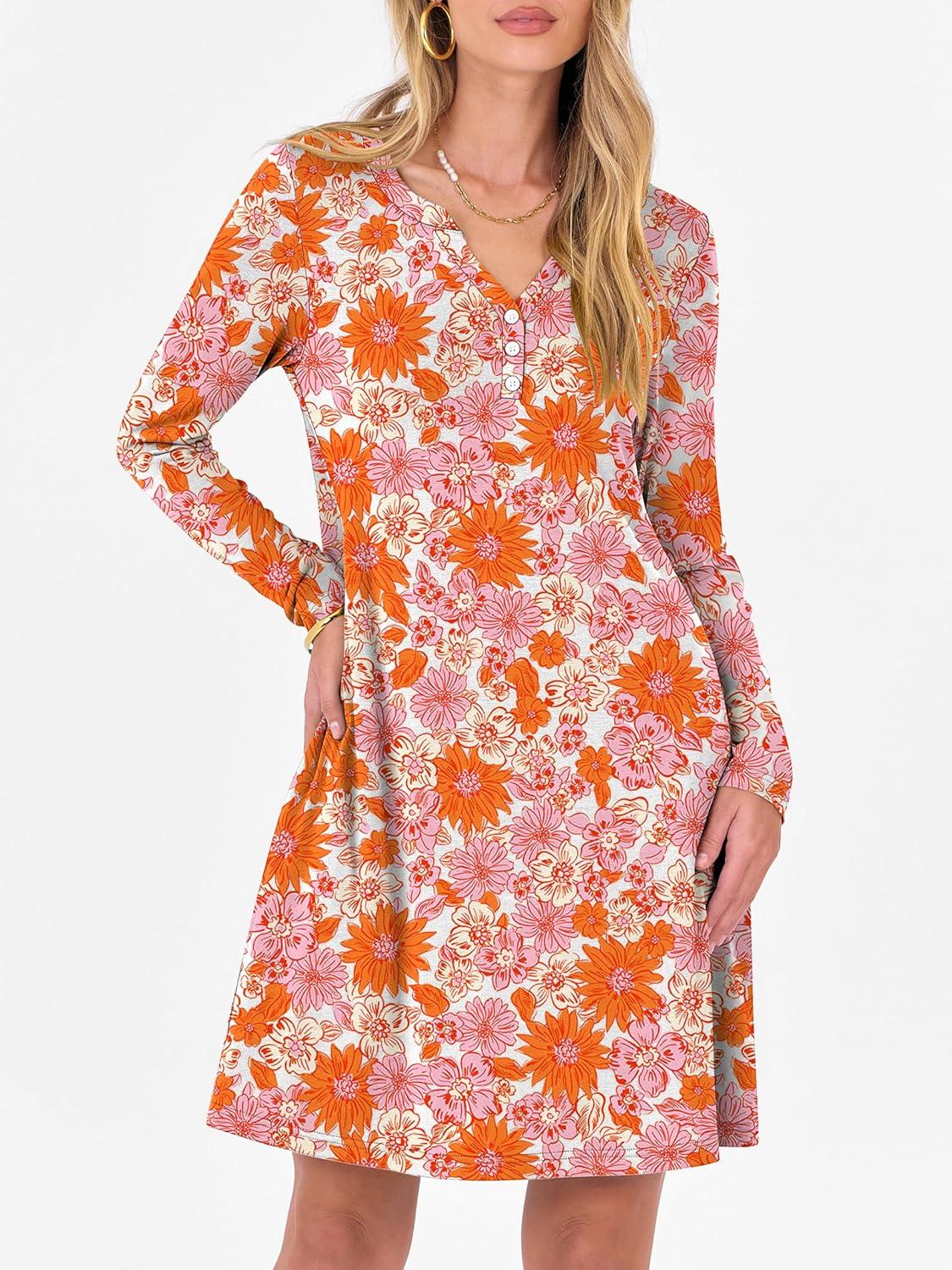 ANRABESS Long Sleeve Dresses for Women 2025 fall Casual Flowy Swing V Neck Boho Floral Mini travel Vacation Dress with Pocket