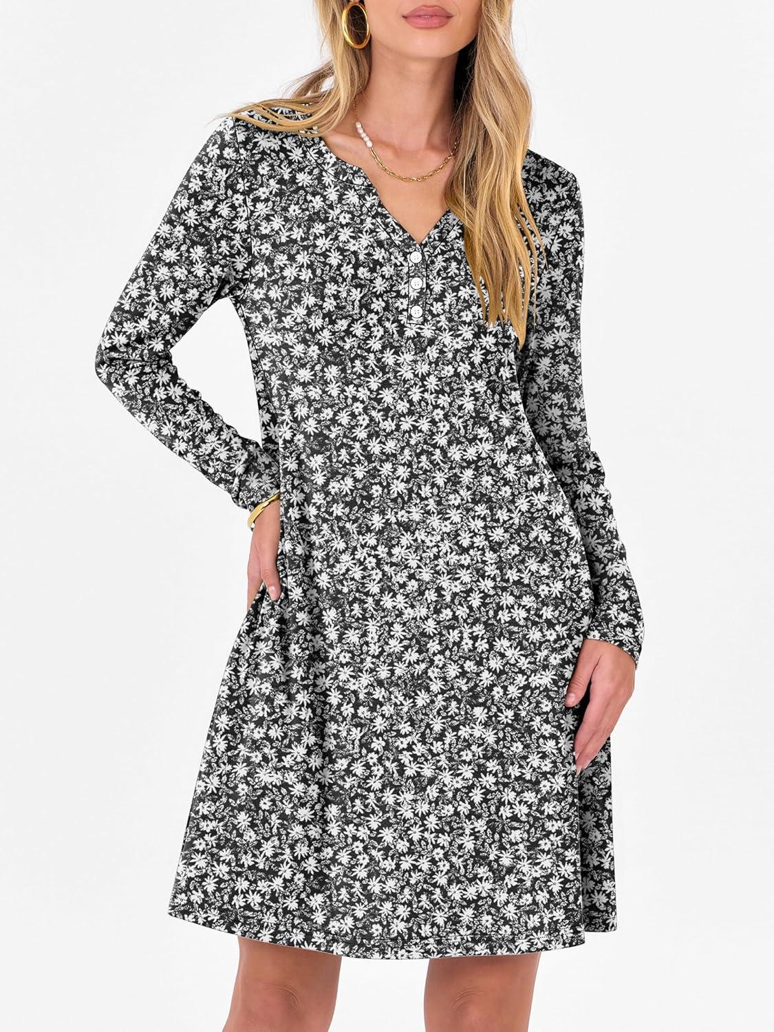 ANRABESS Long Sleeve Dresses for Women 2025 fall Casual Flowy Swing V Neck Boho Floral Mini travel Vacation Dress with Pocket