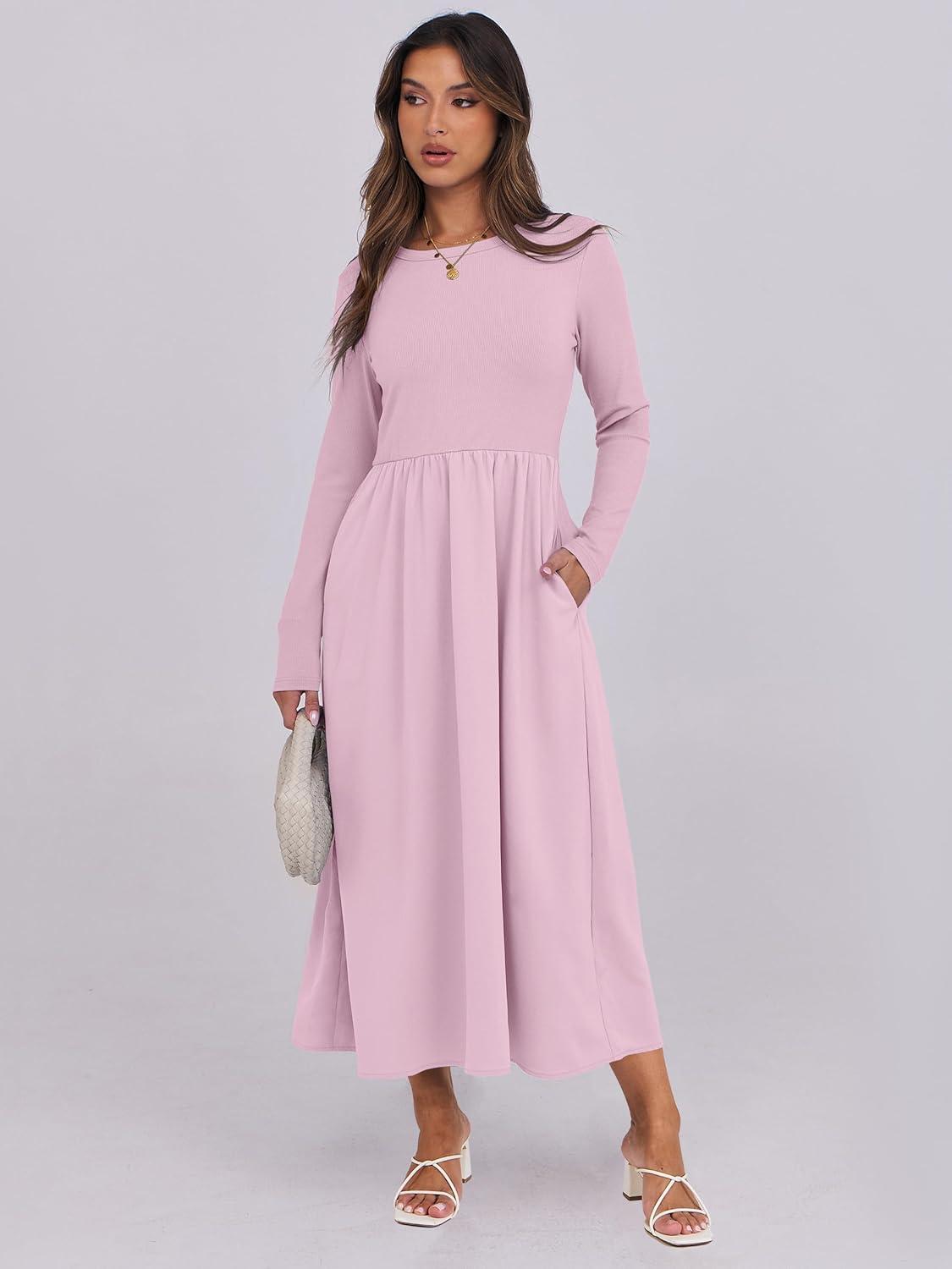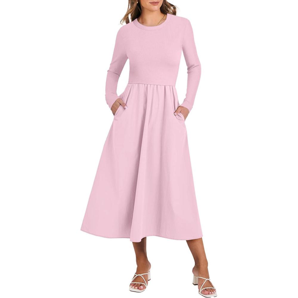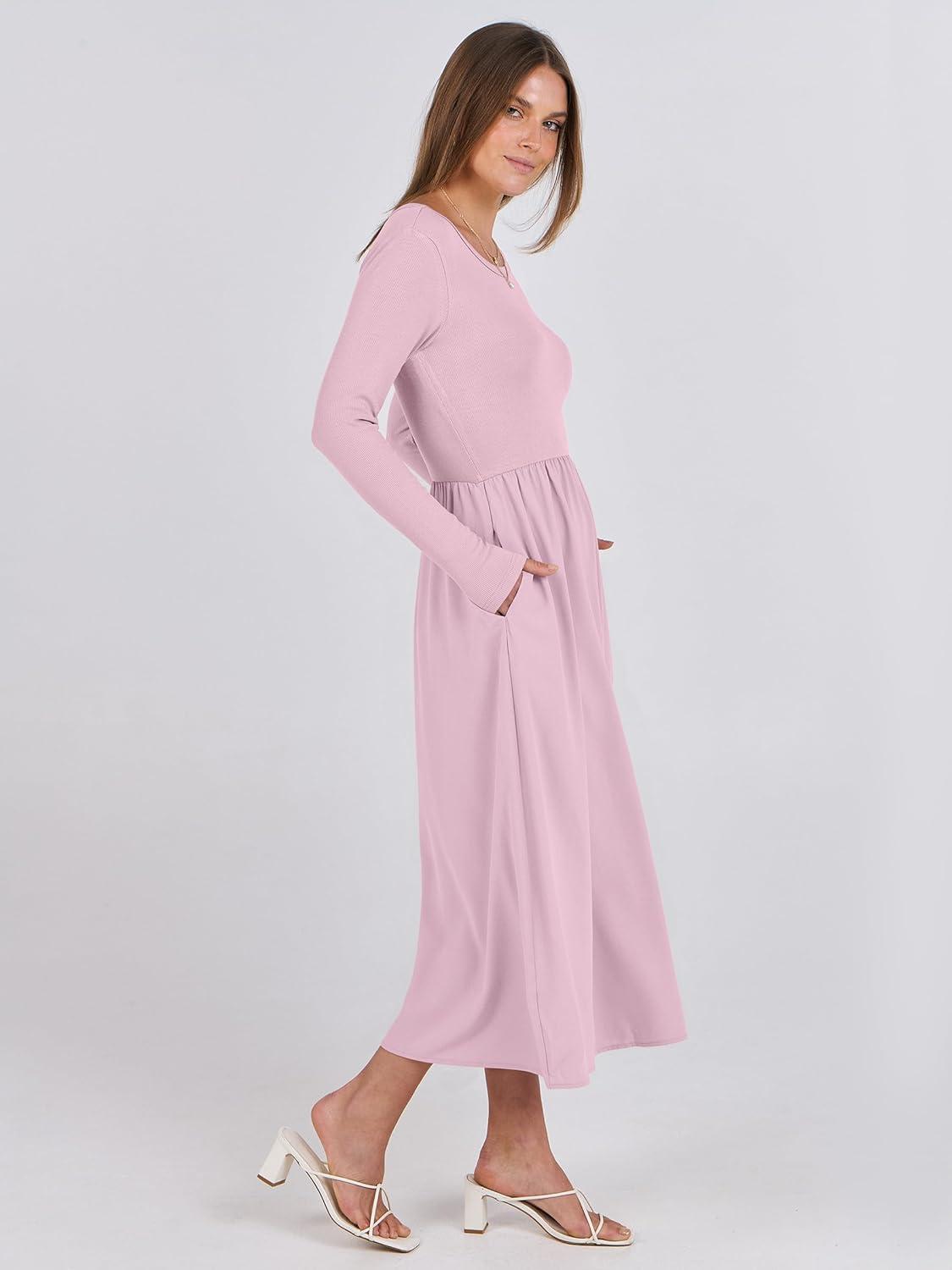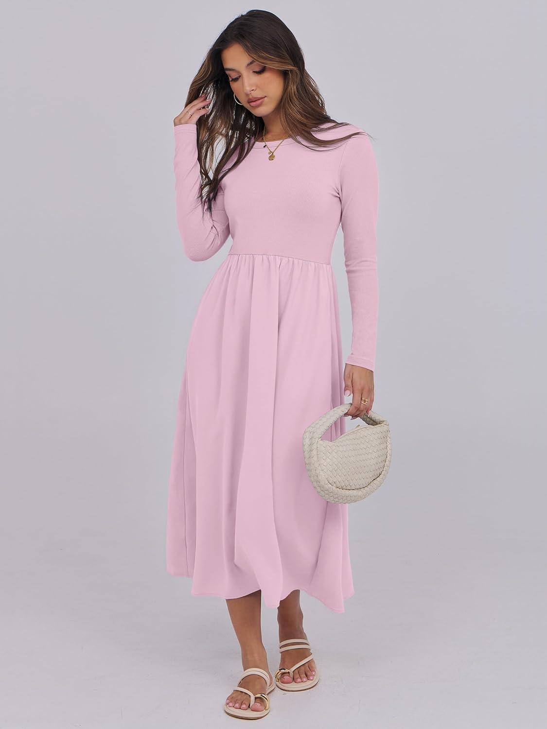 ANRABESS Long Sleeve Midi Dresses for Women 2025 Fall Fashion Casual Rib Knit Patchwork Tight Top Modest Flowy Dress Pocket(Pink)