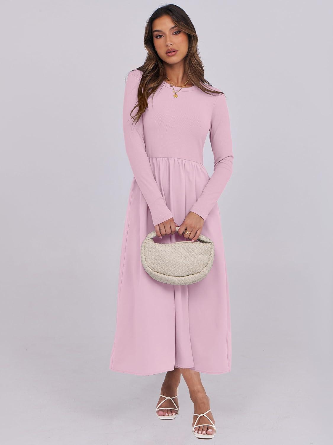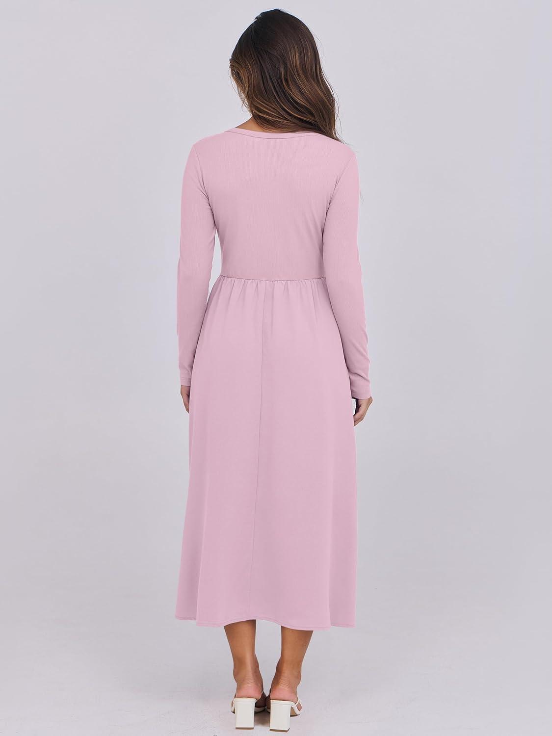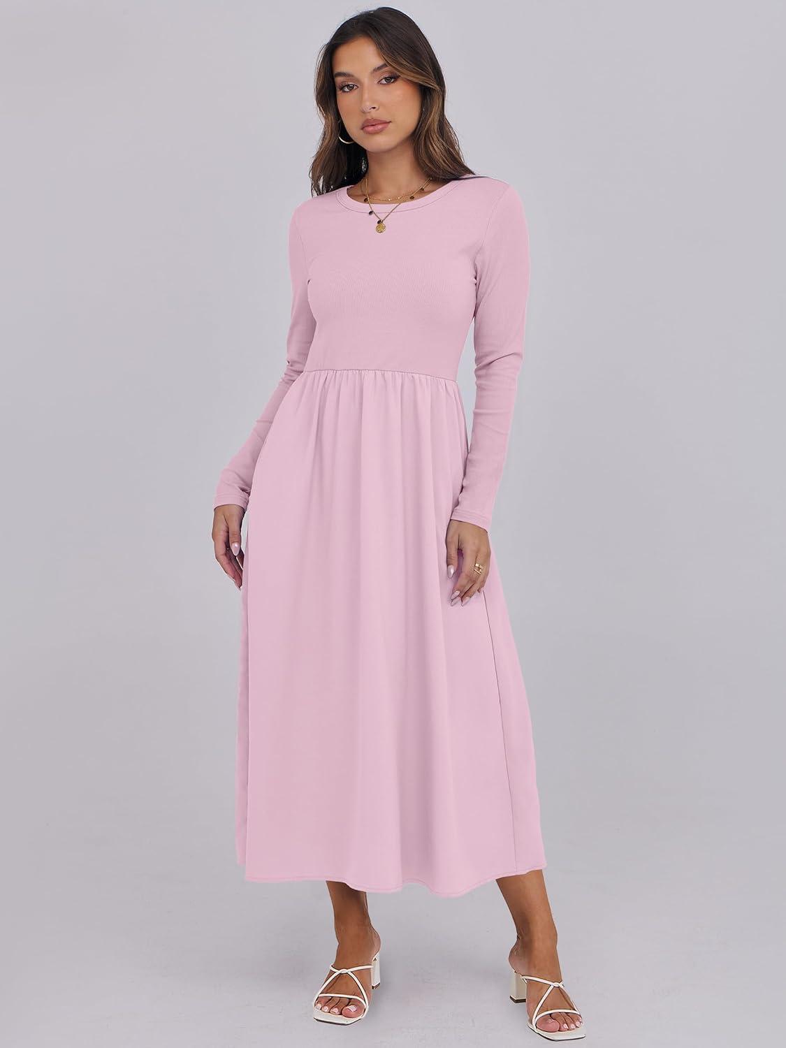 ANRABESS Long Sleeve Midi Dresses for Women 2025 Fall Fashion Casual Rib Knit Patchwork Tight Top Modest Flowy Dress Pocket(Pink)
