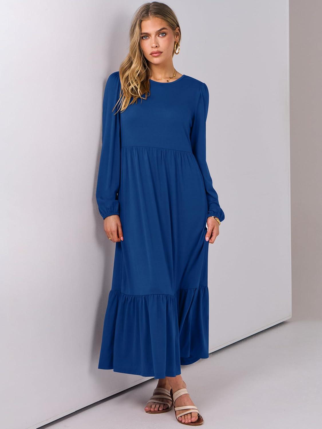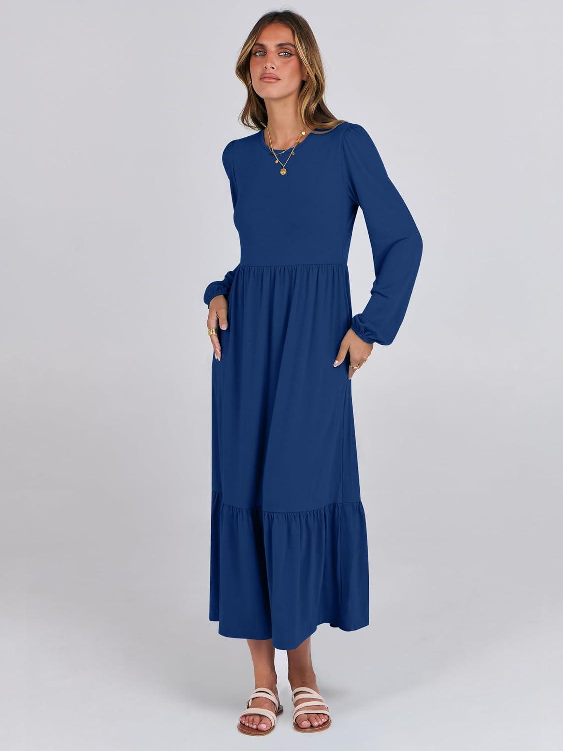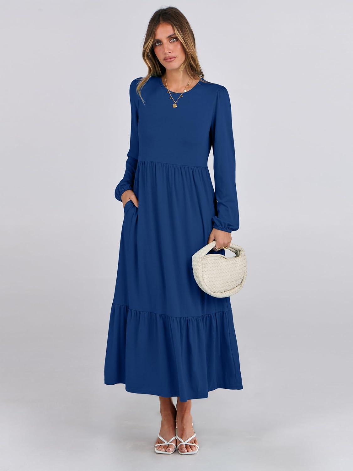 ANRABESS Long Sleeve Midi Dresses for Women Casual 2025 Fall Crewneck A Line Tiered Flowy Loose Trendy Dresses with Pockets(Blue)