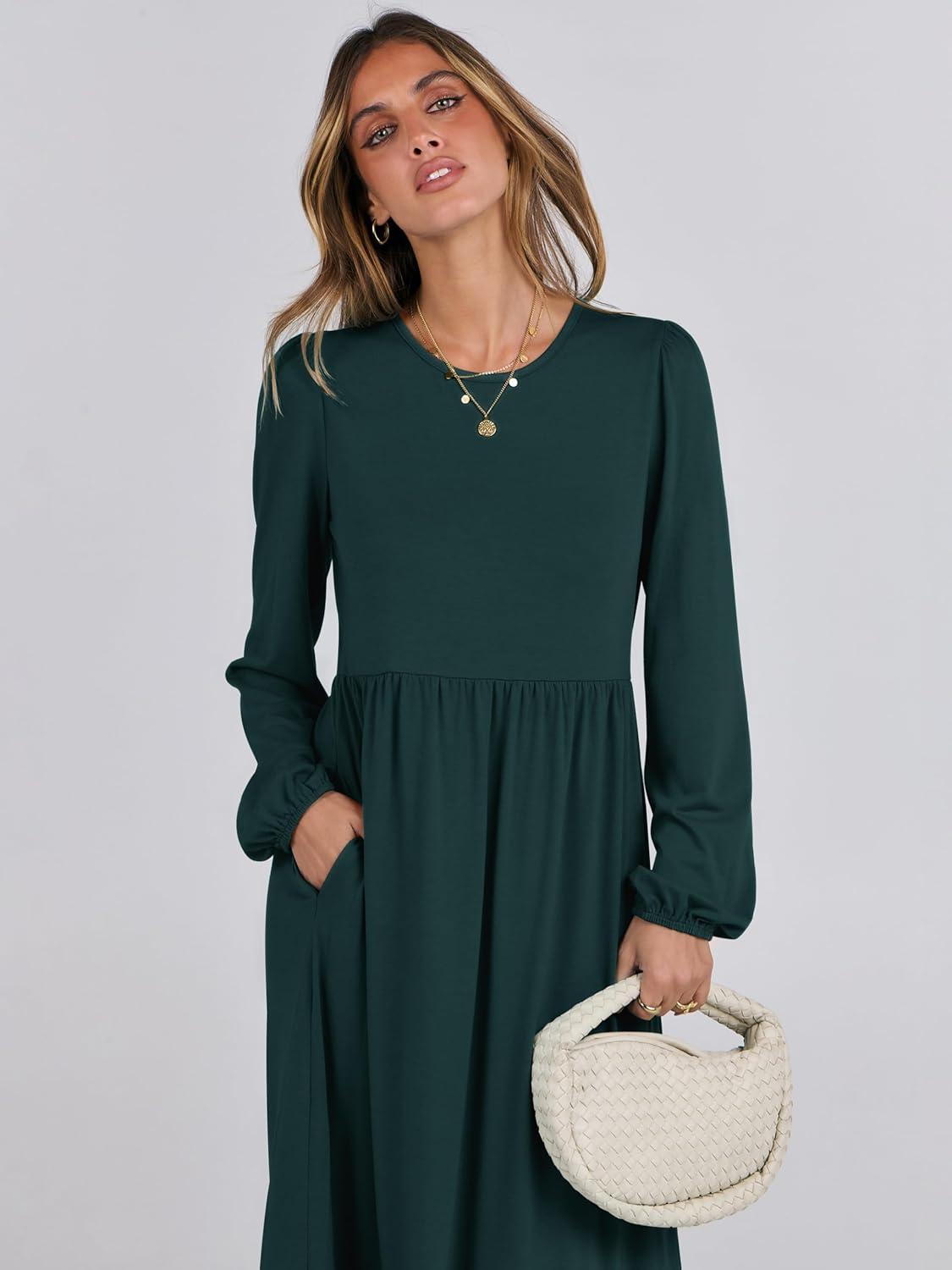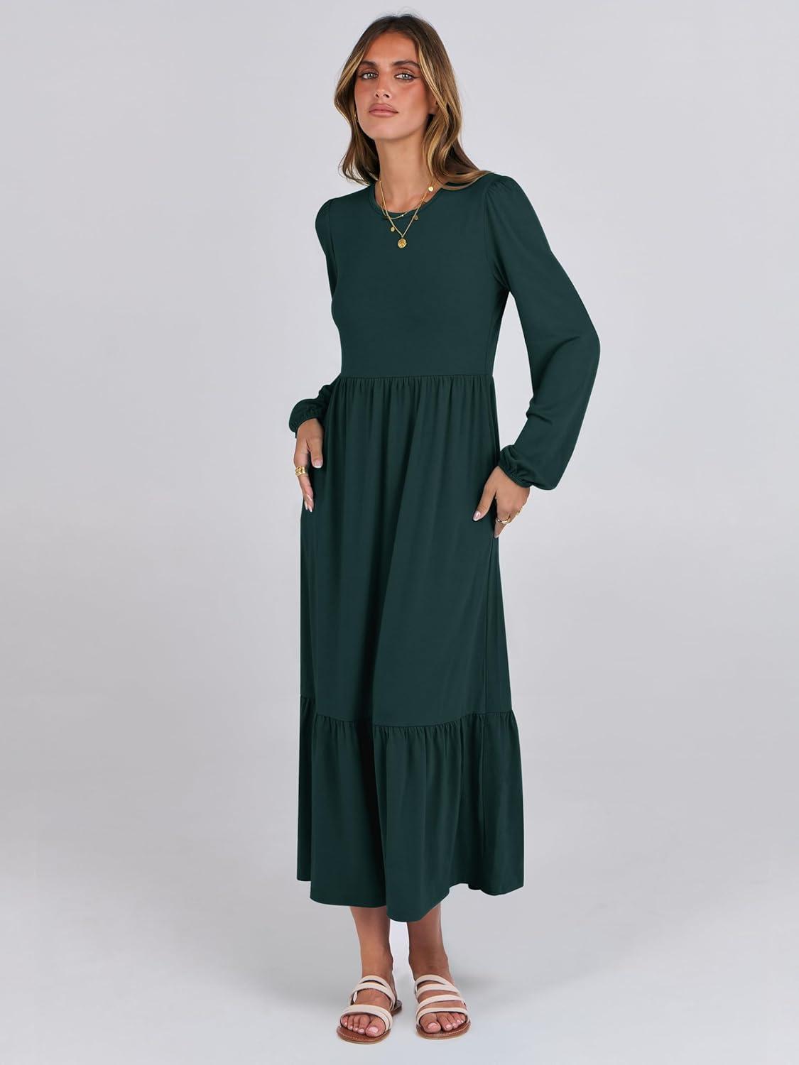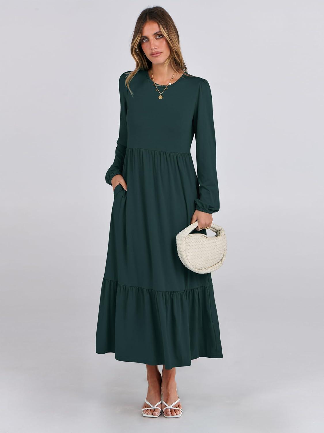 ANRABESS Long Sleeve Midi Dresses for Women Casual 2025 Fall Crewneck A Line Tiered Flowy Loose Trendy Dresses with Pockets(Dark Green)