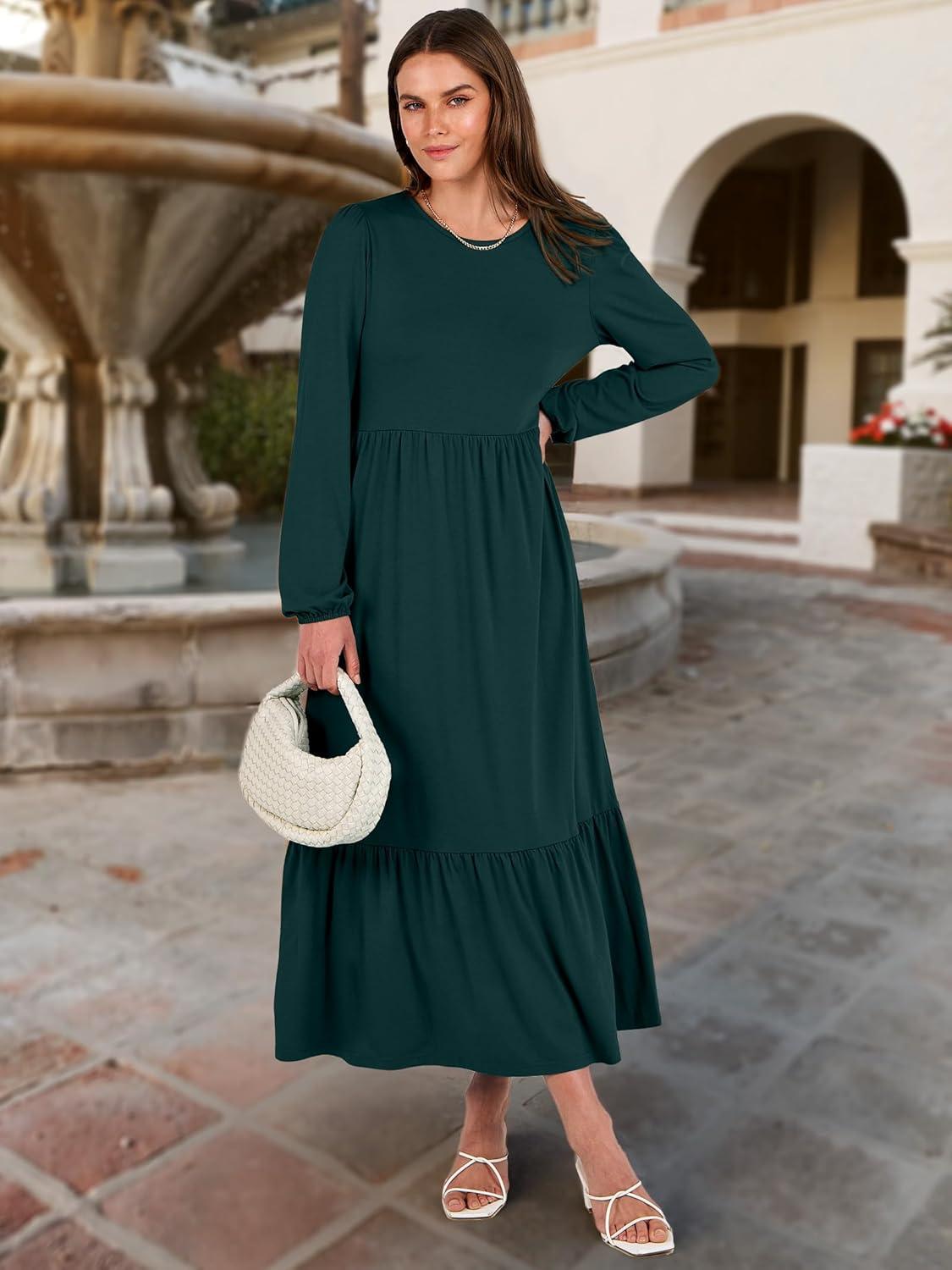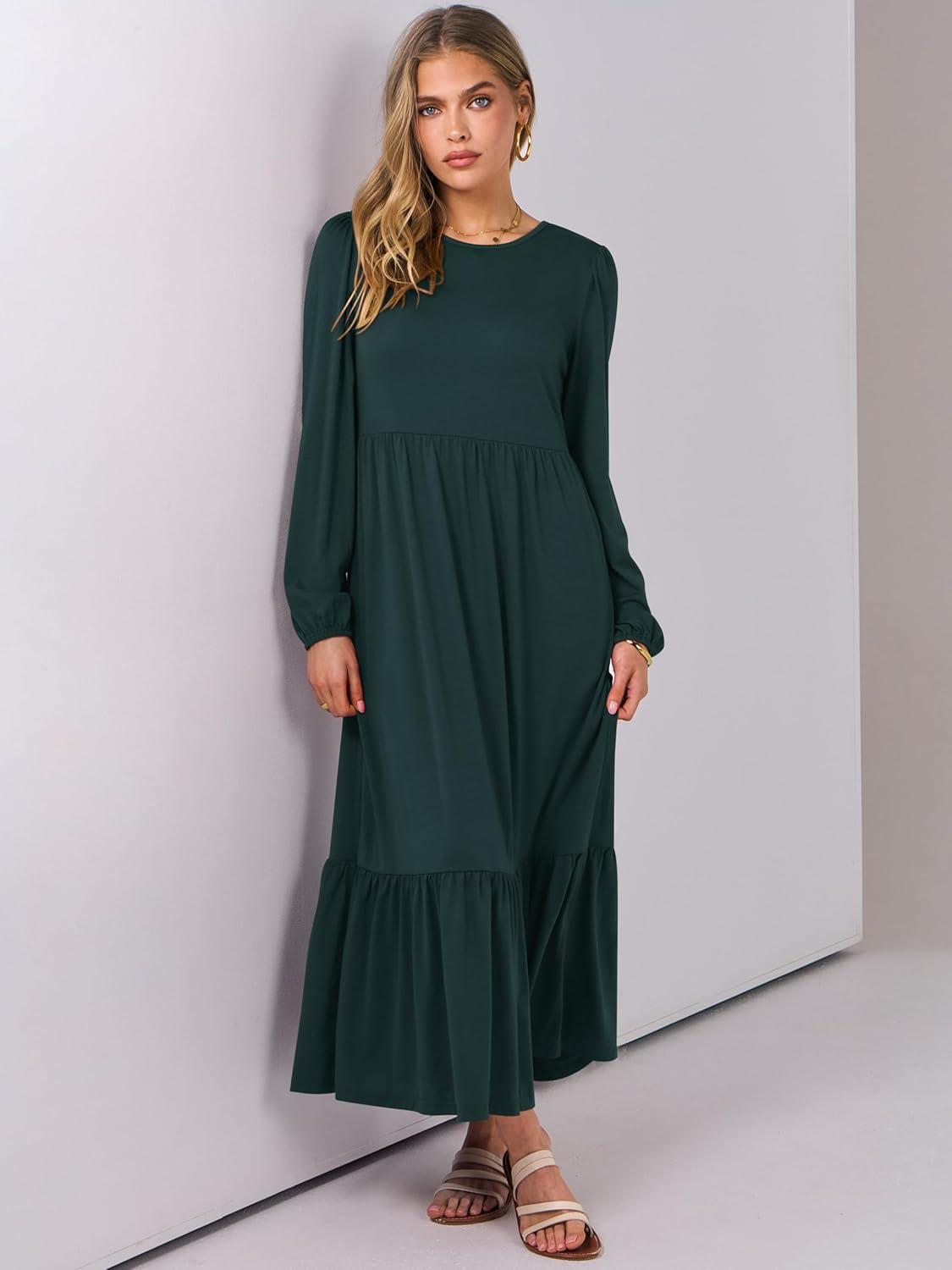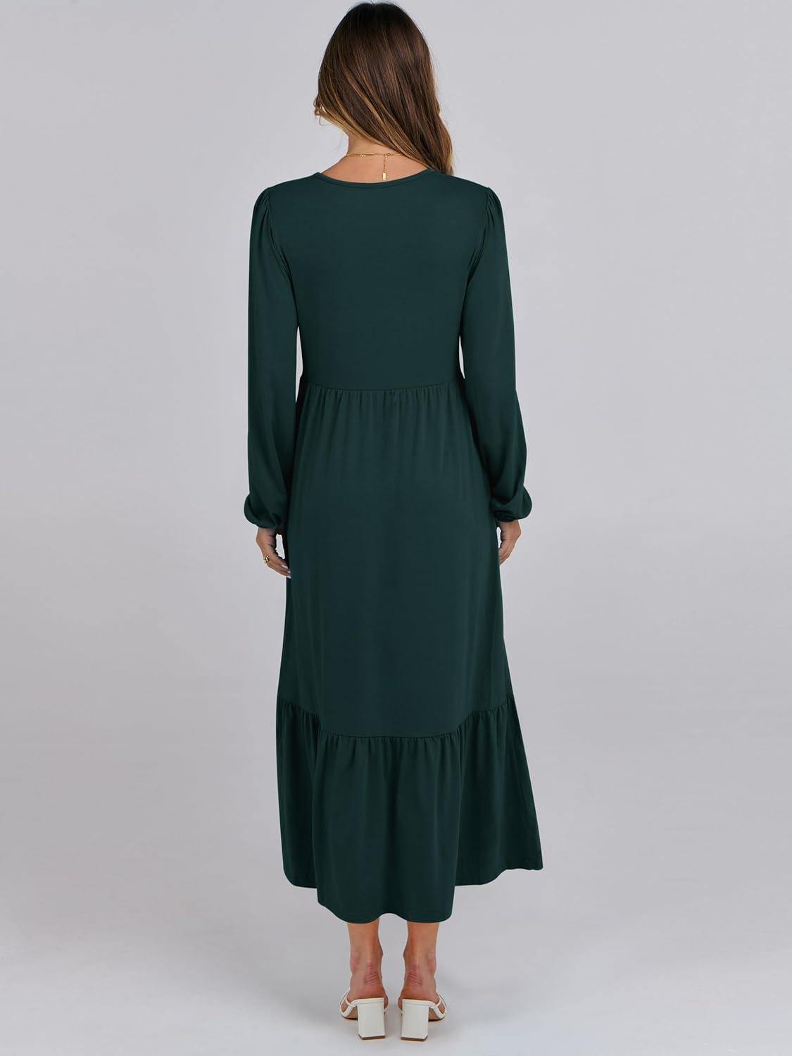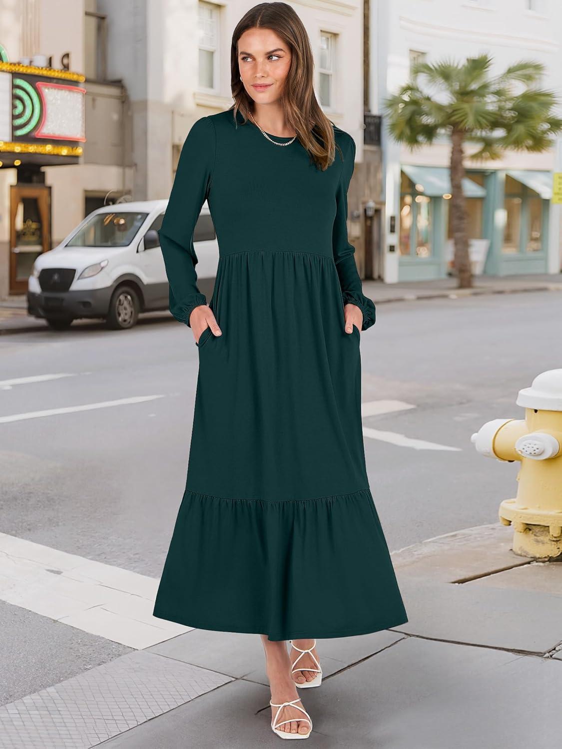 ANRABESS Long Sleeve Midi Dresses for Women Casual 2025 Fall Crewneck A Line Tiered Flowy Loose Trendy Dresses with Pockets(Dark Green)