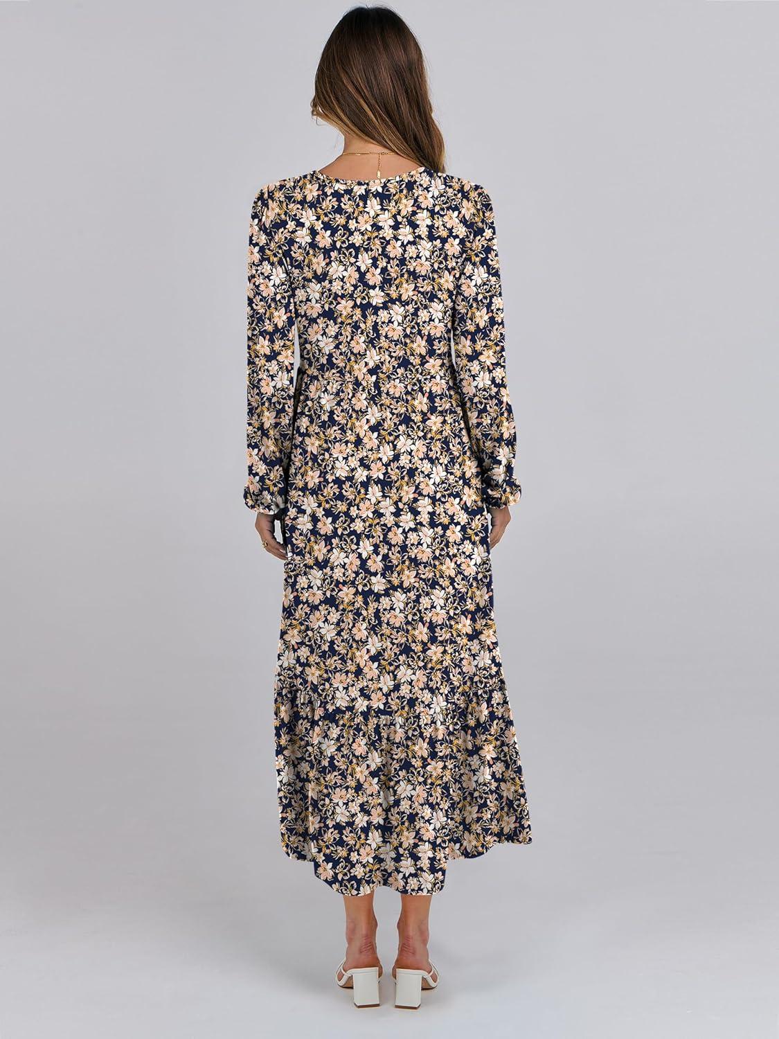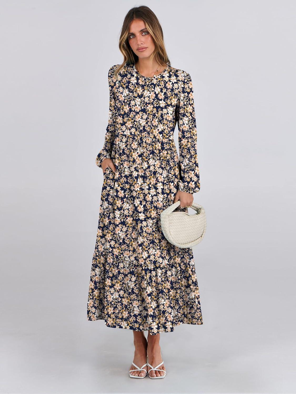 ANRABESS Long Sleeve Midi Dresses for Women Casual 2025 Fall Crewneck A Line Tiered Flowy Loose Trendy Dresses with Pockets(Floral Navy Blue Pink)