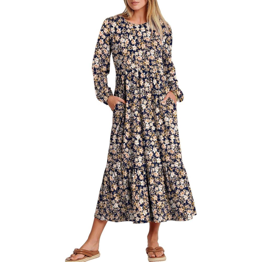 Get the ANRABESS Long Sleeve Midi Dresses for Women Casual 2025 Fall Crewneck A Line Tiered Flowy Loose Trendy Dresses with Pockets(Floral Navy Blue Pink) you’ve been eyeing at a discounted price during our seasonal sale event.
