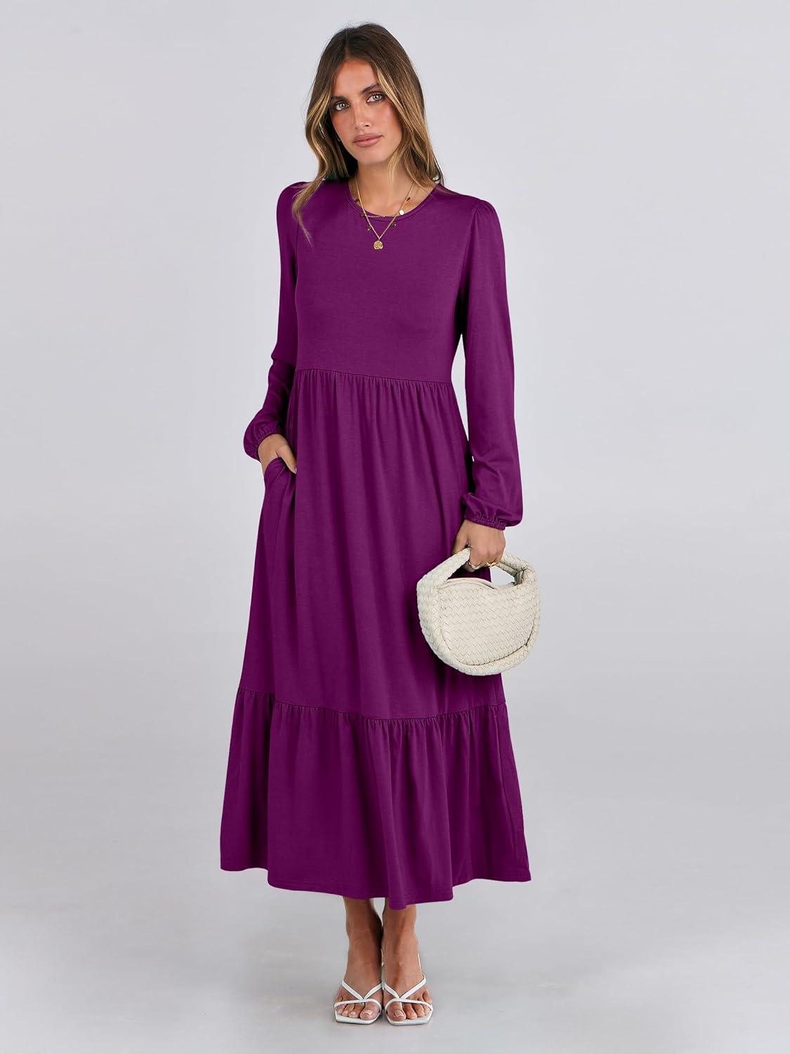 ANRABESS Long Sleeve Midi Dresses for Women Casual 2025 Fall Crewneck A Line Tiered Flowy Loose Trendy Dresses with Pockets(Purple)