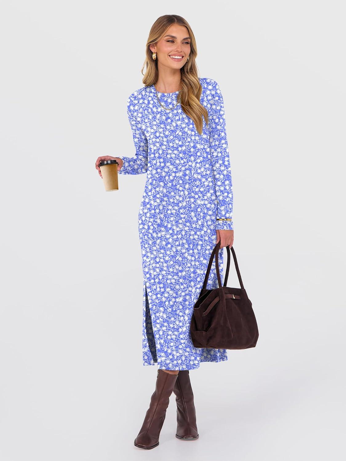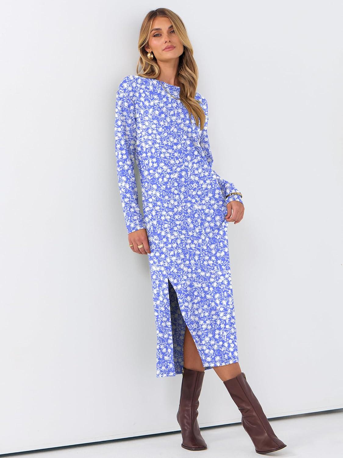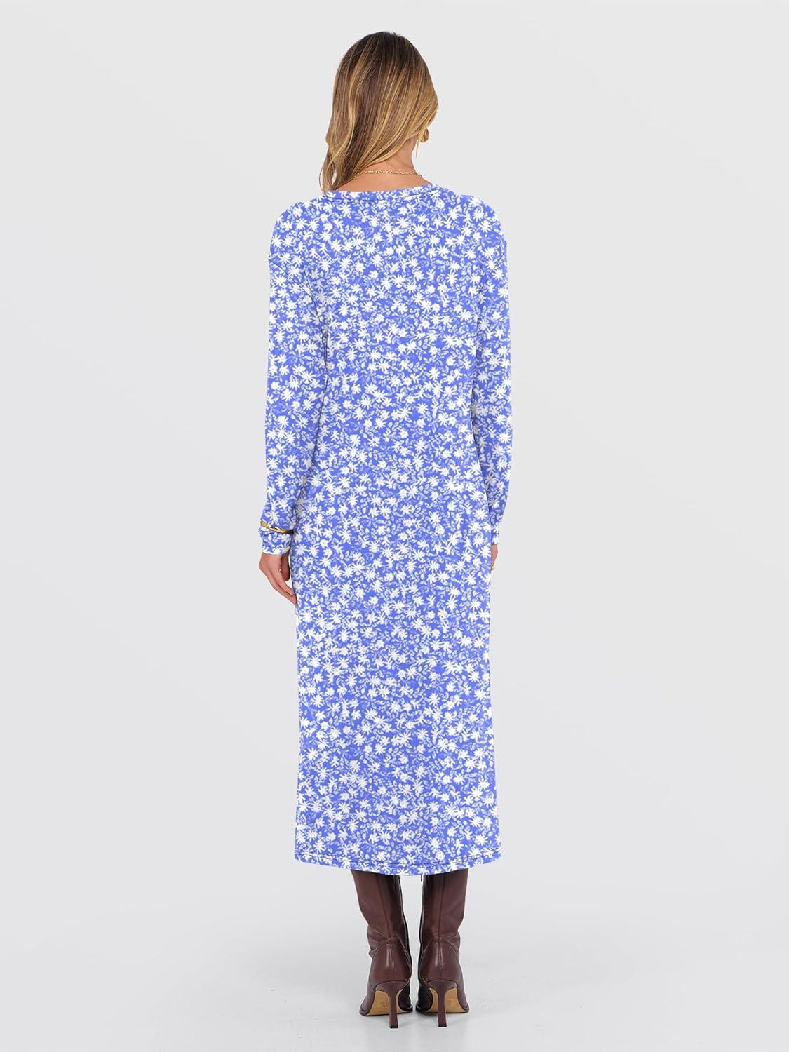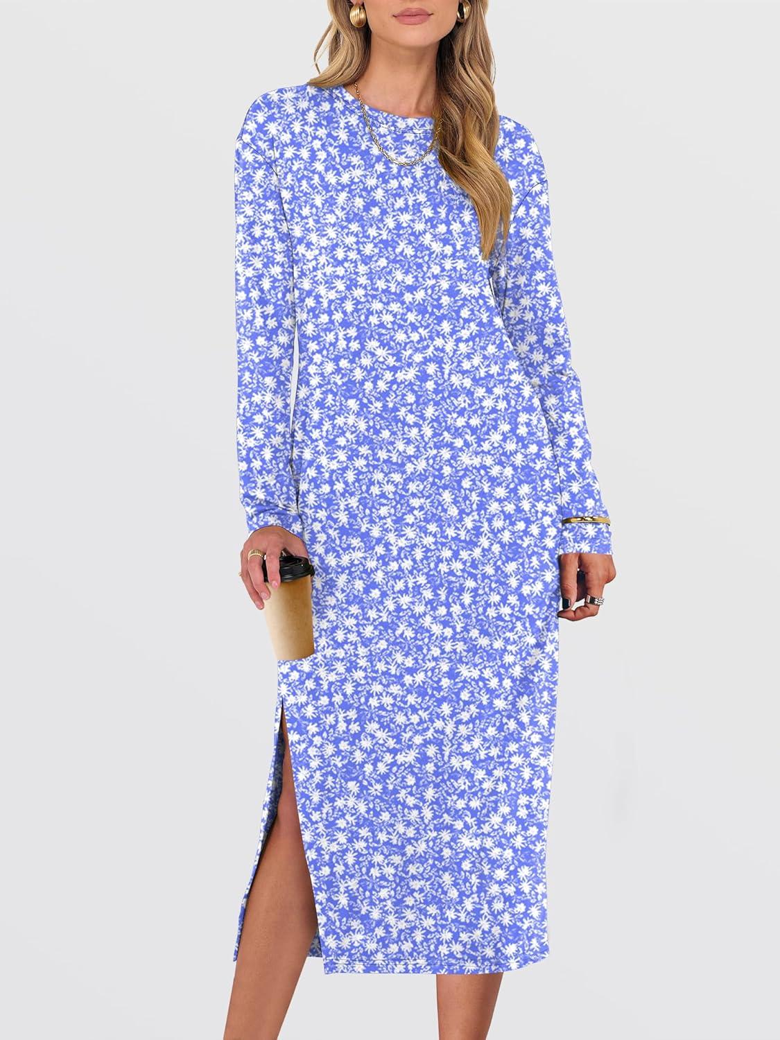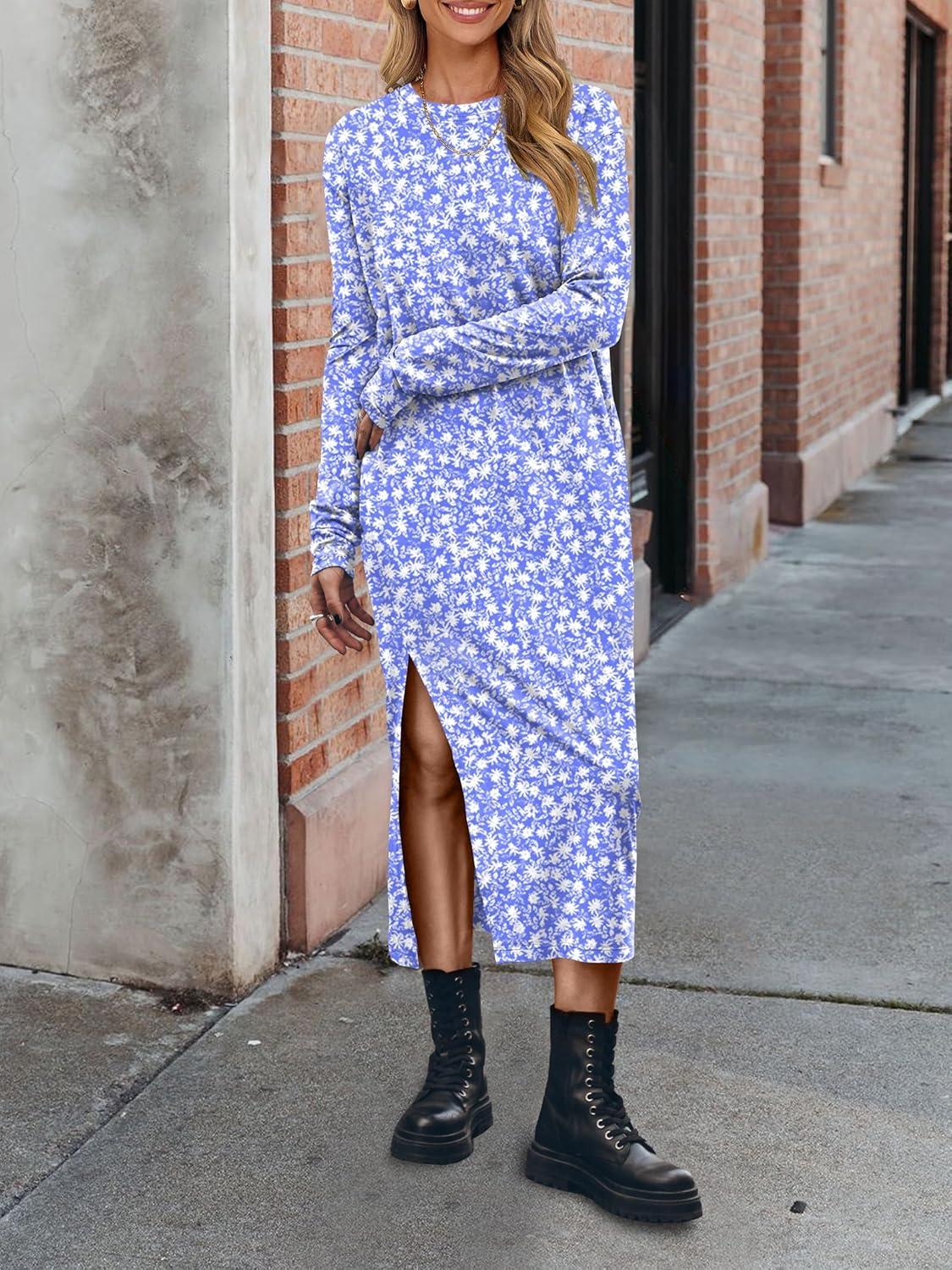 ANRABESS Long Sleeve Midi Dresses for Women Fall Fashion Casual Vacation Crewneck Loose Split Striped Long Tshirts Dress(Floral Blue White)