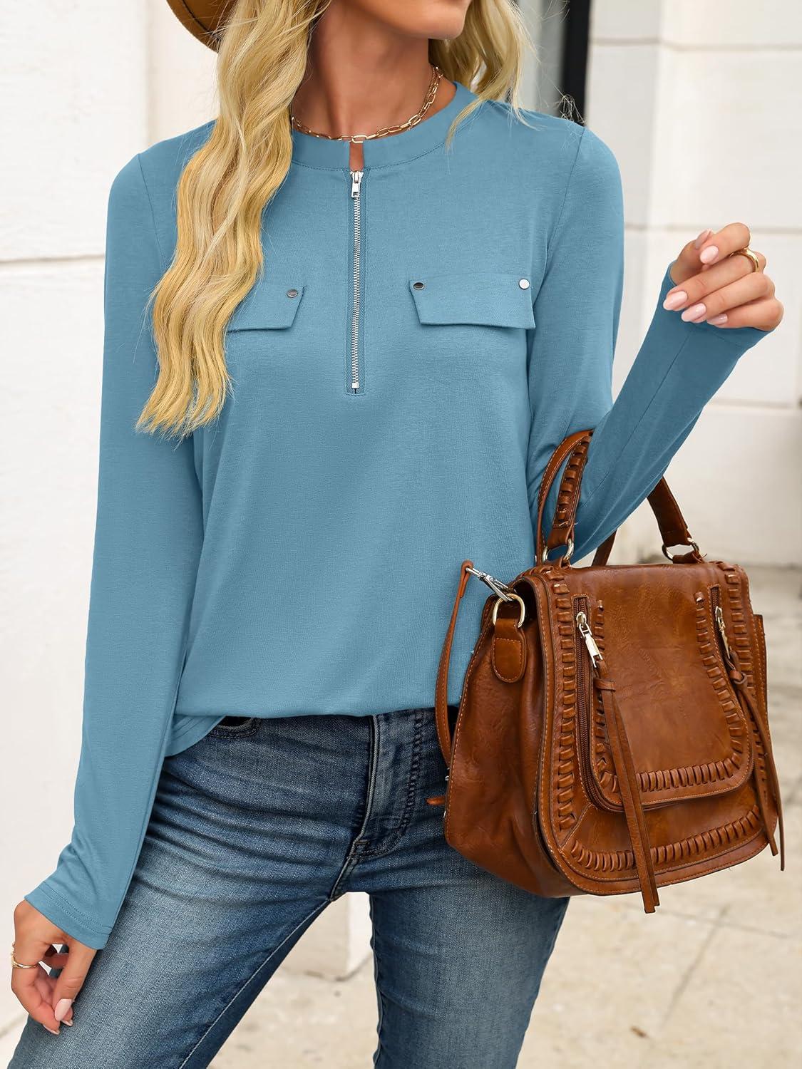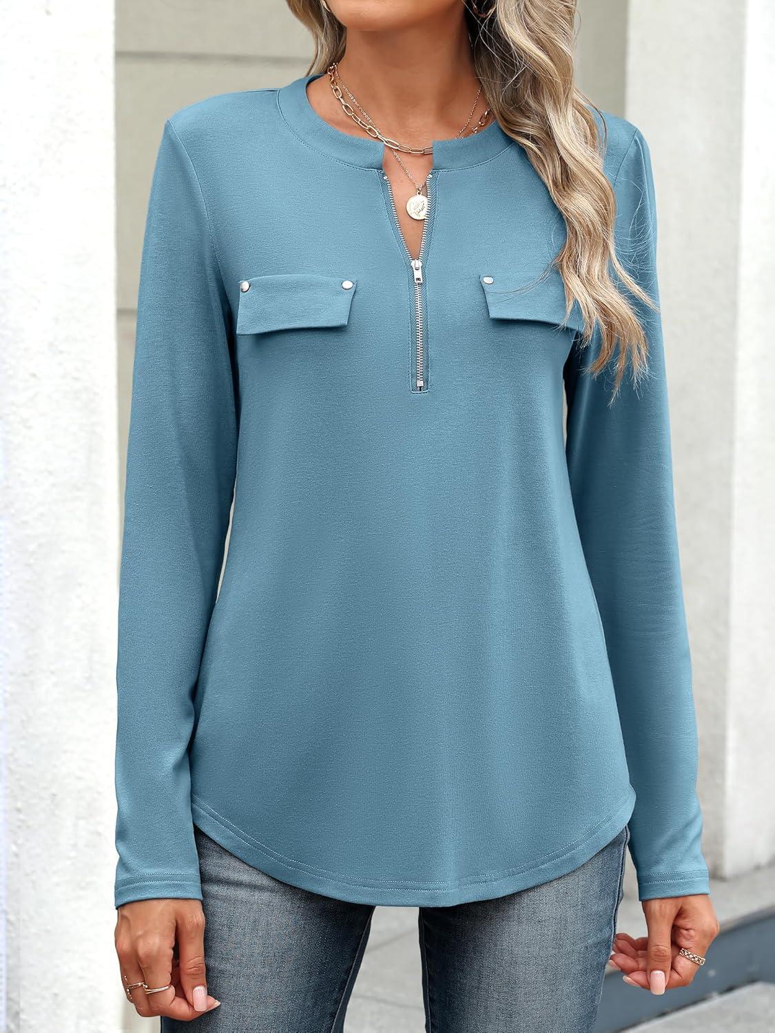 ANRABESS Long Sleeve Shirts for Women Business Dressy Casual Tops V Neck Half Zipper Blouses 2025 Fall Fashion Work Outfits(Cyan)