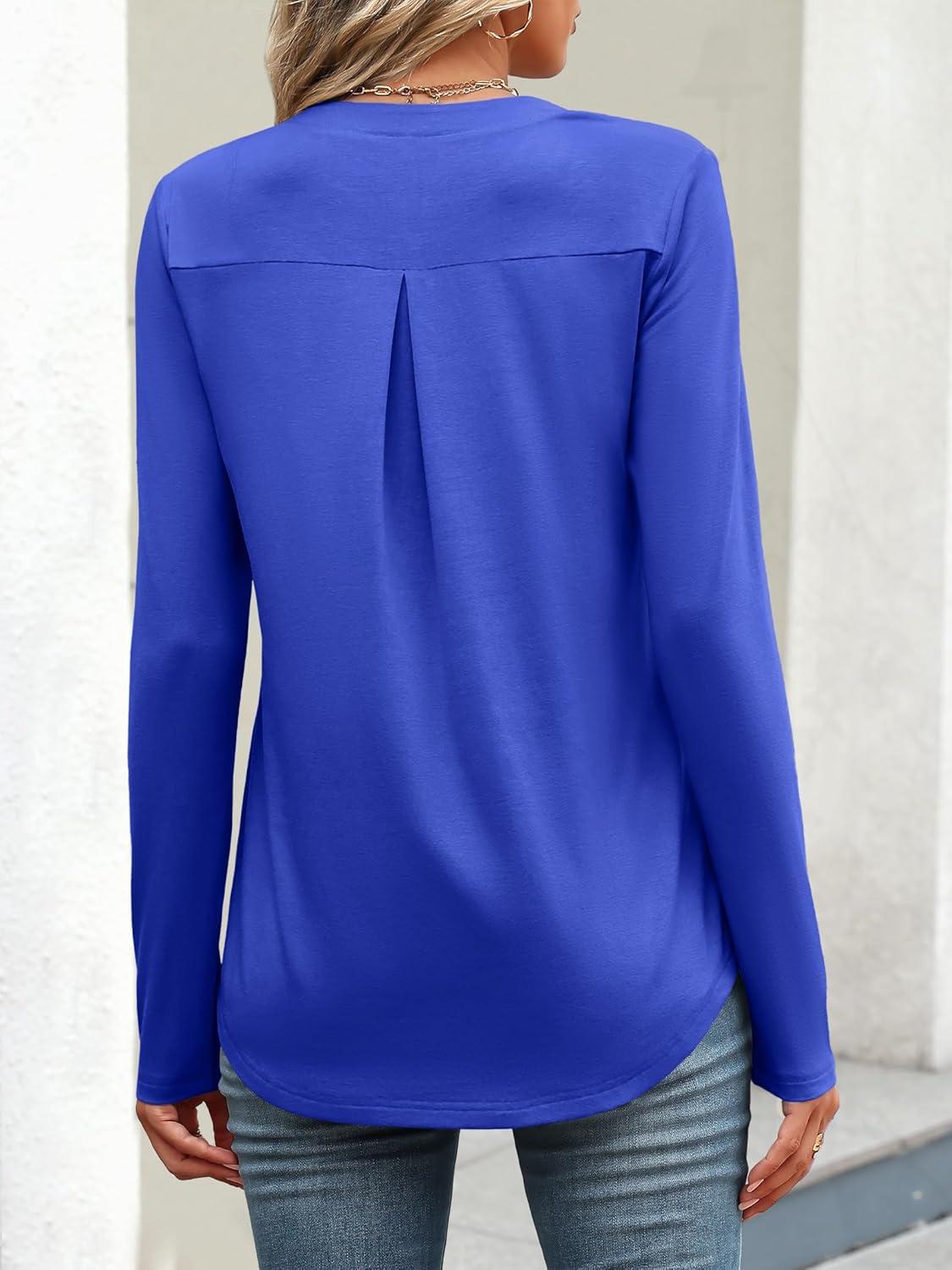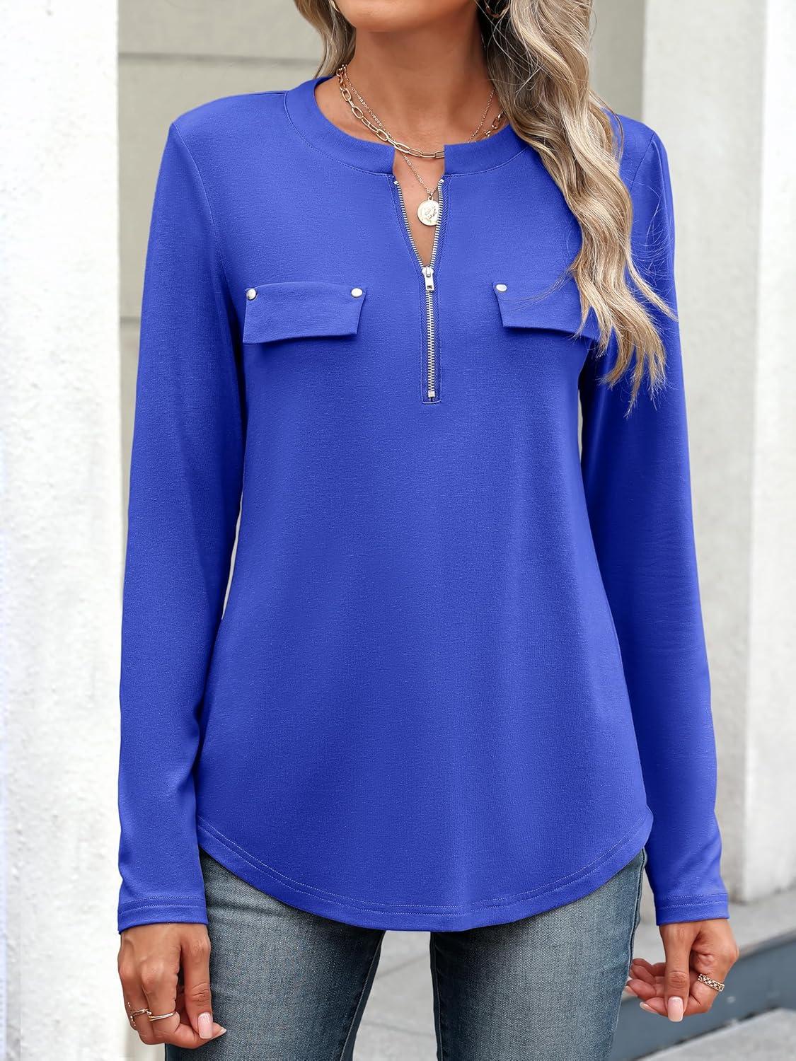 ANRABESS Long Sleeve Shirts for Women Business Dressy Casual Tops V Neck Half Zipper Blouses 2025 Fall Fashion Work Outfits(Royal Blue)