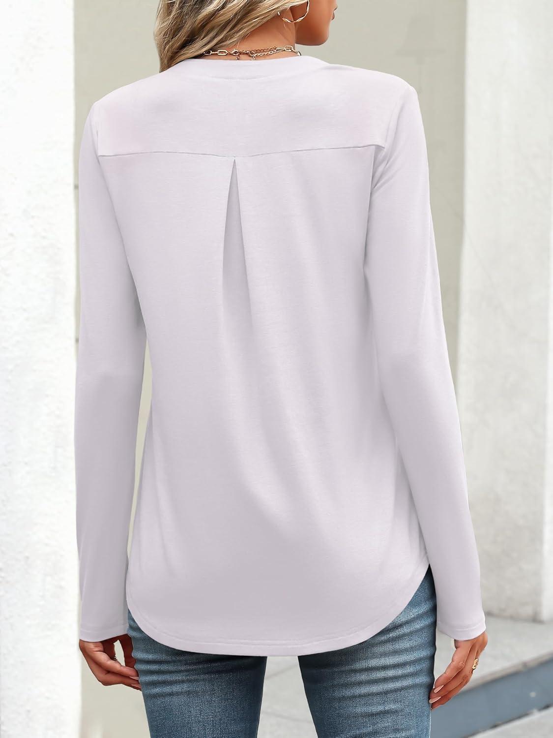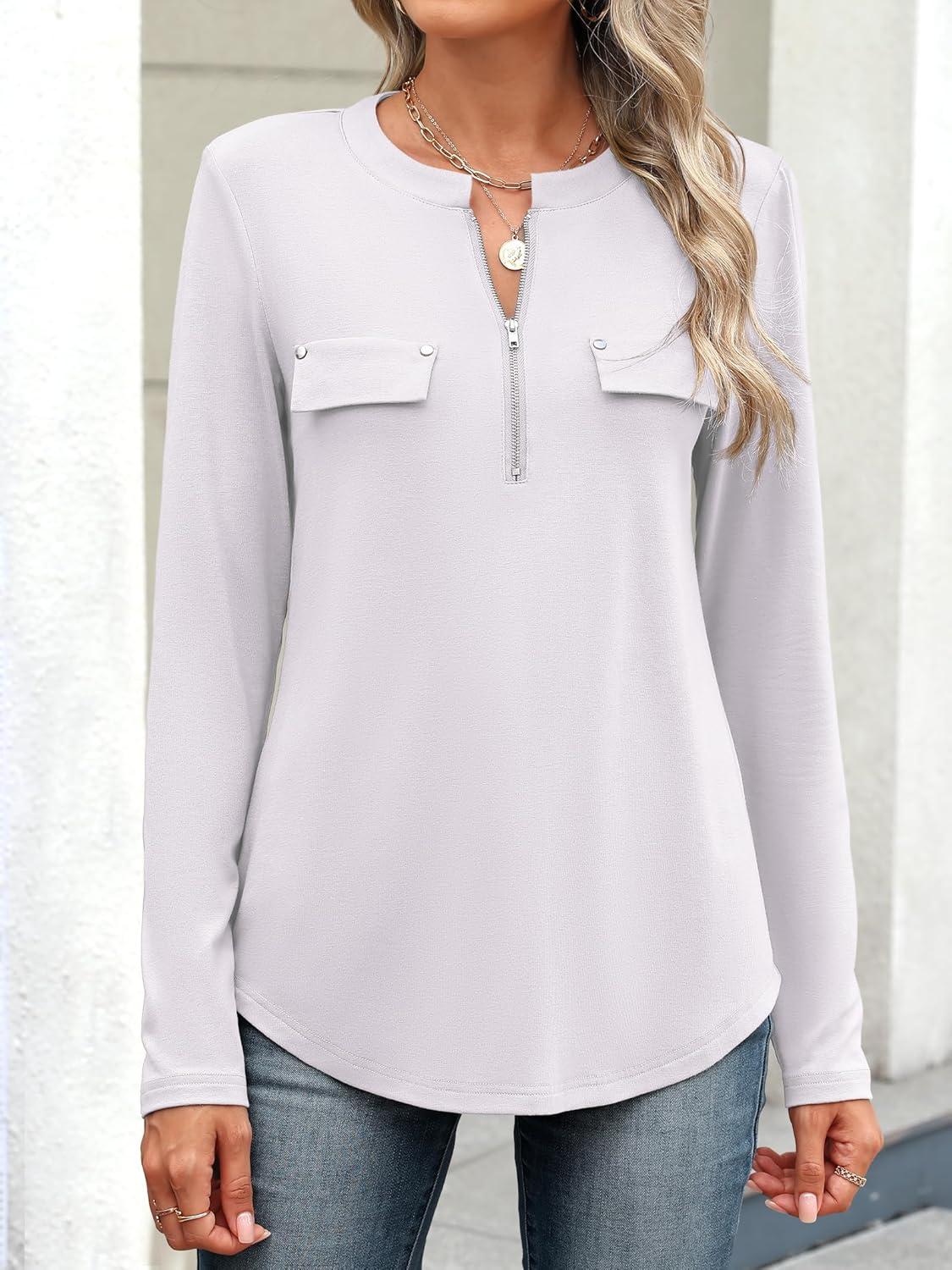ANRABESS Long Sleeve Shirts for Women Business Dressy Casual Tops V Neck Half Zipper Blouses 2025 Fall Fashion Work Outfits(White)