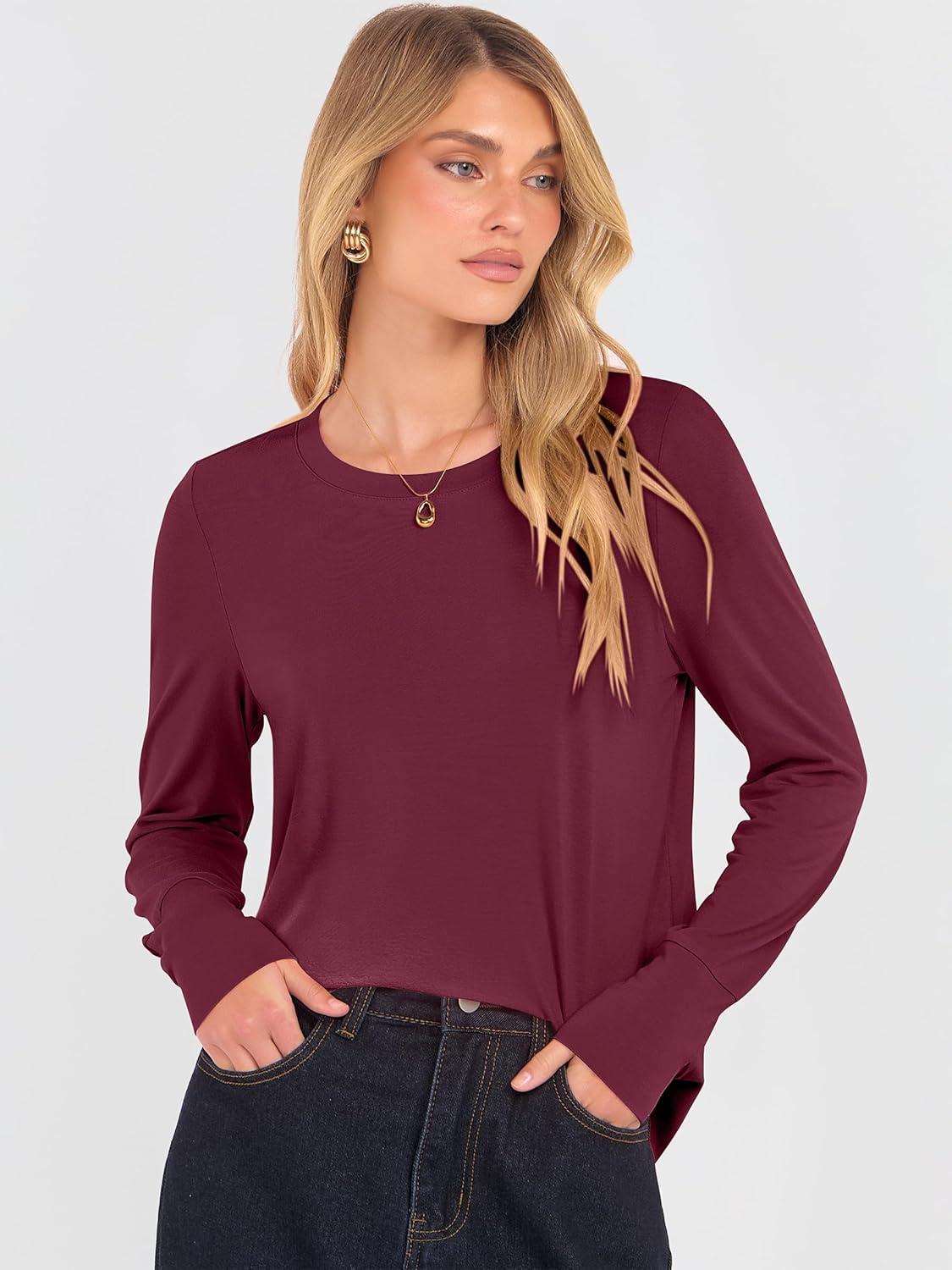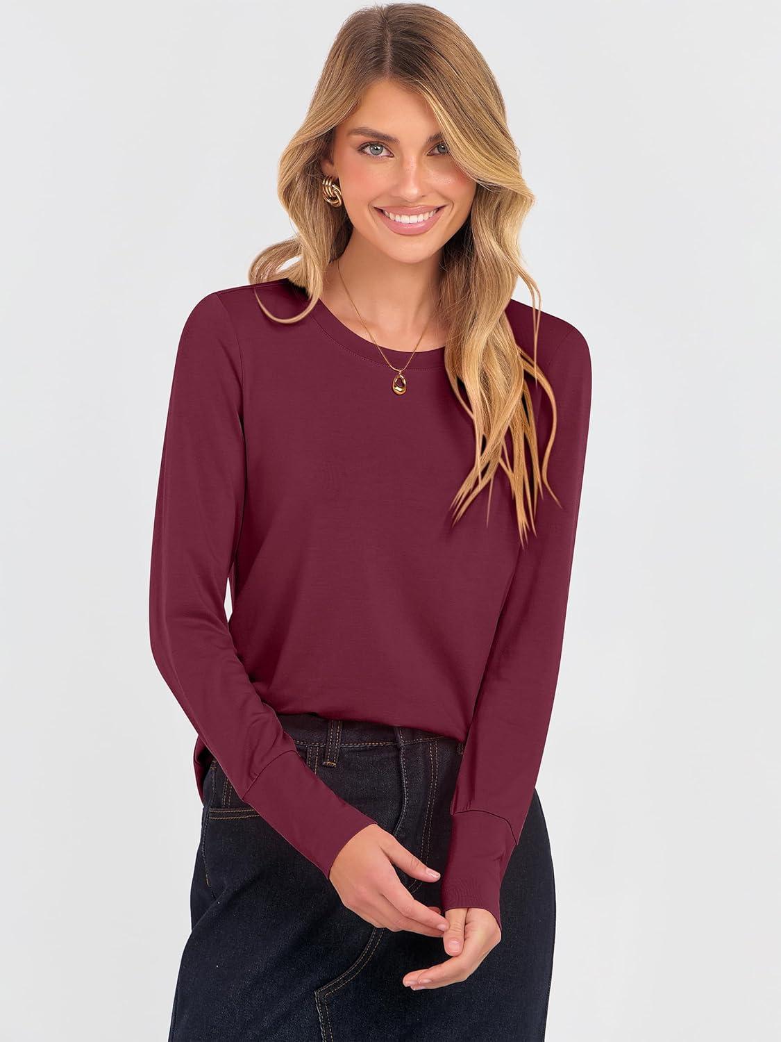 ANRABESS Long Sleeve Shirts for Women Crewneck Basic Tee Striped Tops 2025 Fall Casual Loose Fit T Shirts Fashion Outfits(Burgundy)