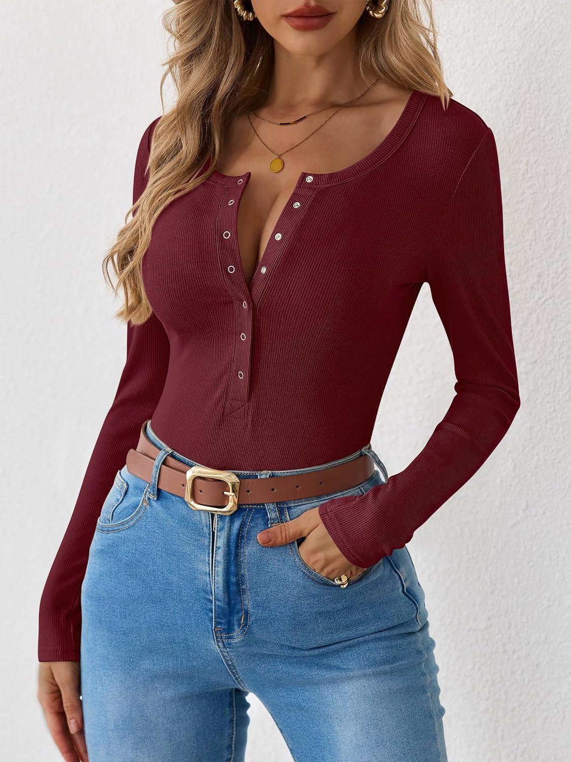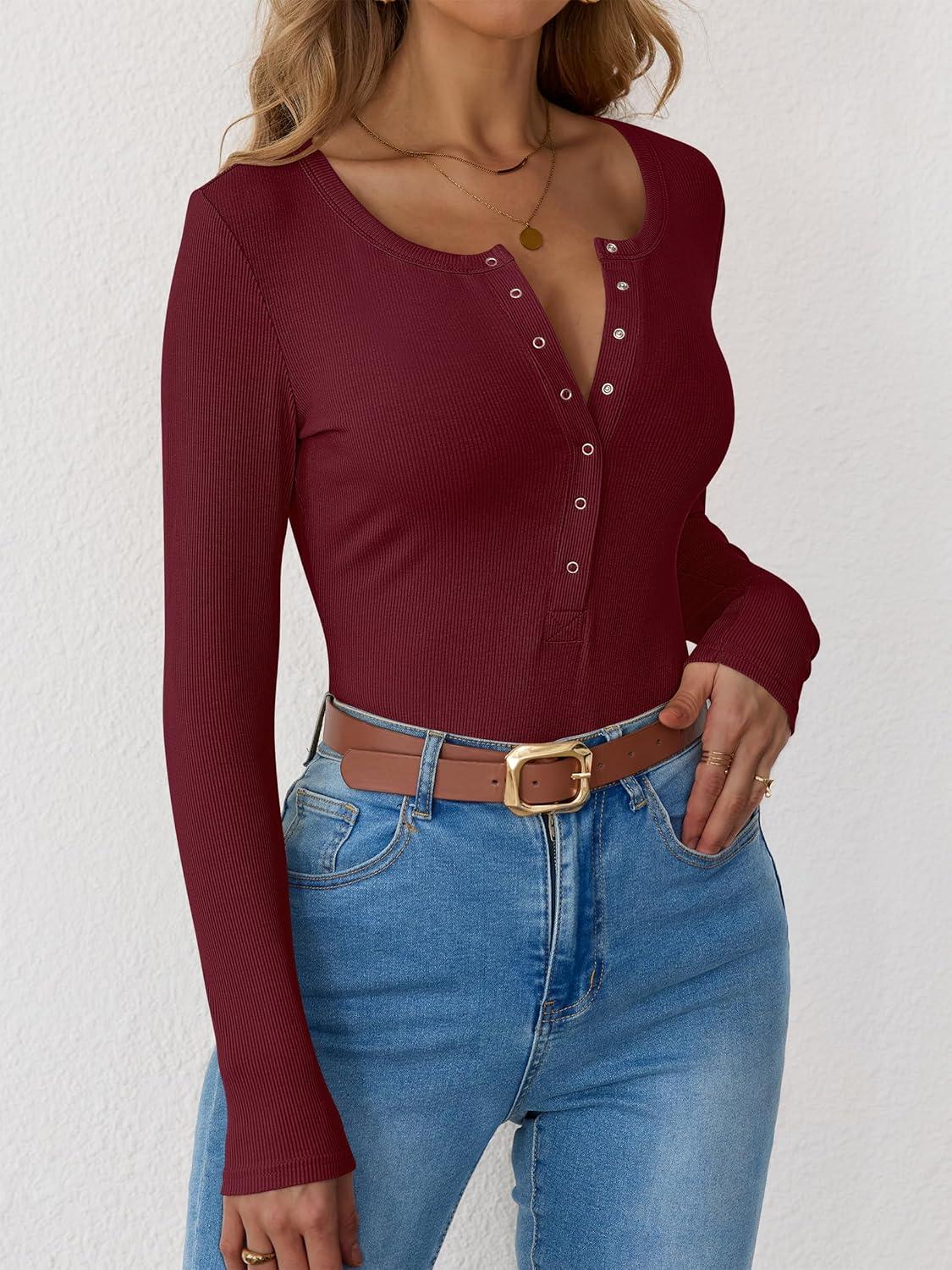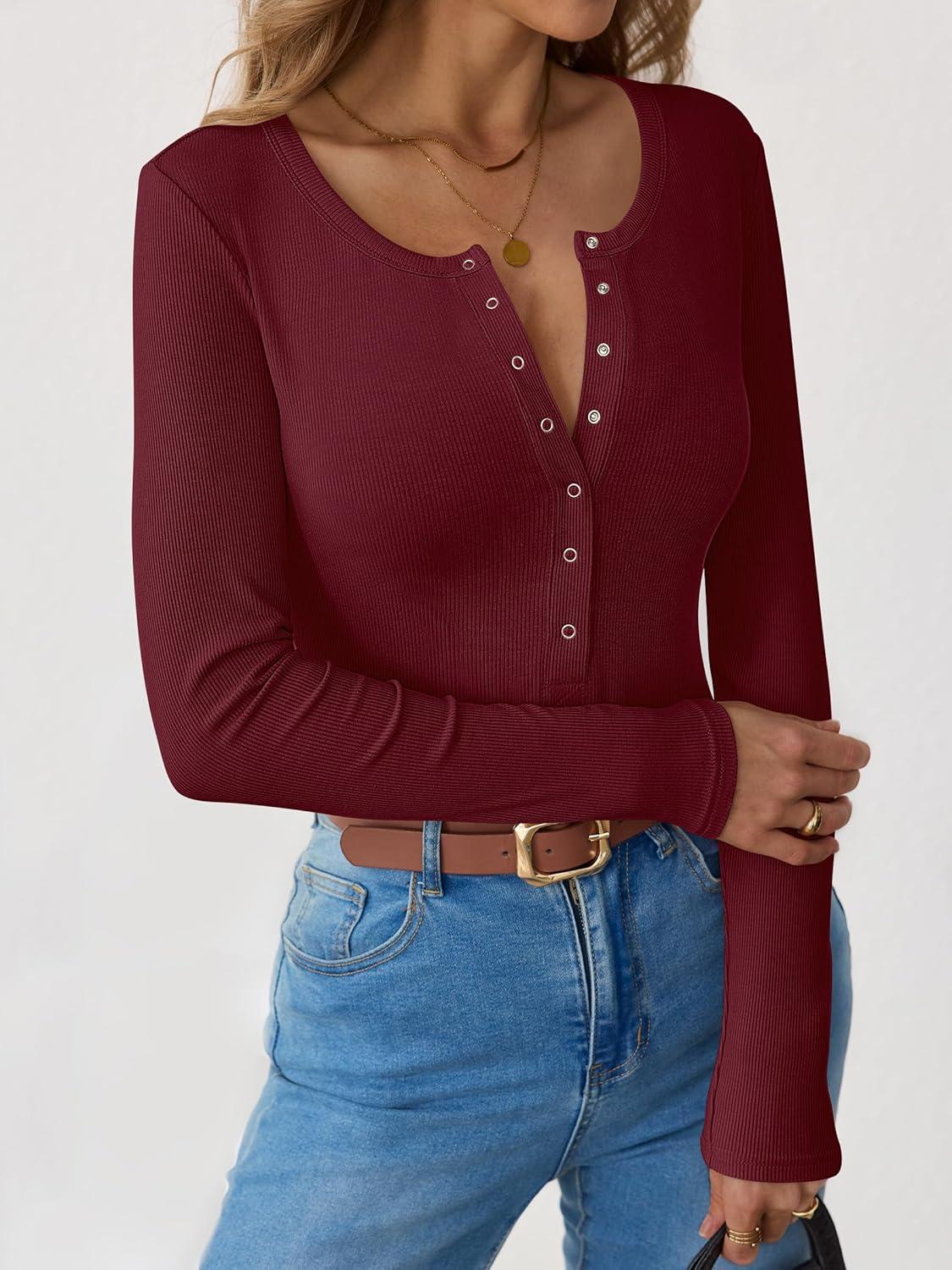 imageANRABESS Long Sleeve Shirts for Women Henley Button Down Tops Ribbed Knit Slim Fit Fall Basic Tee 2025 Casual Trendy ClothesBurgundy