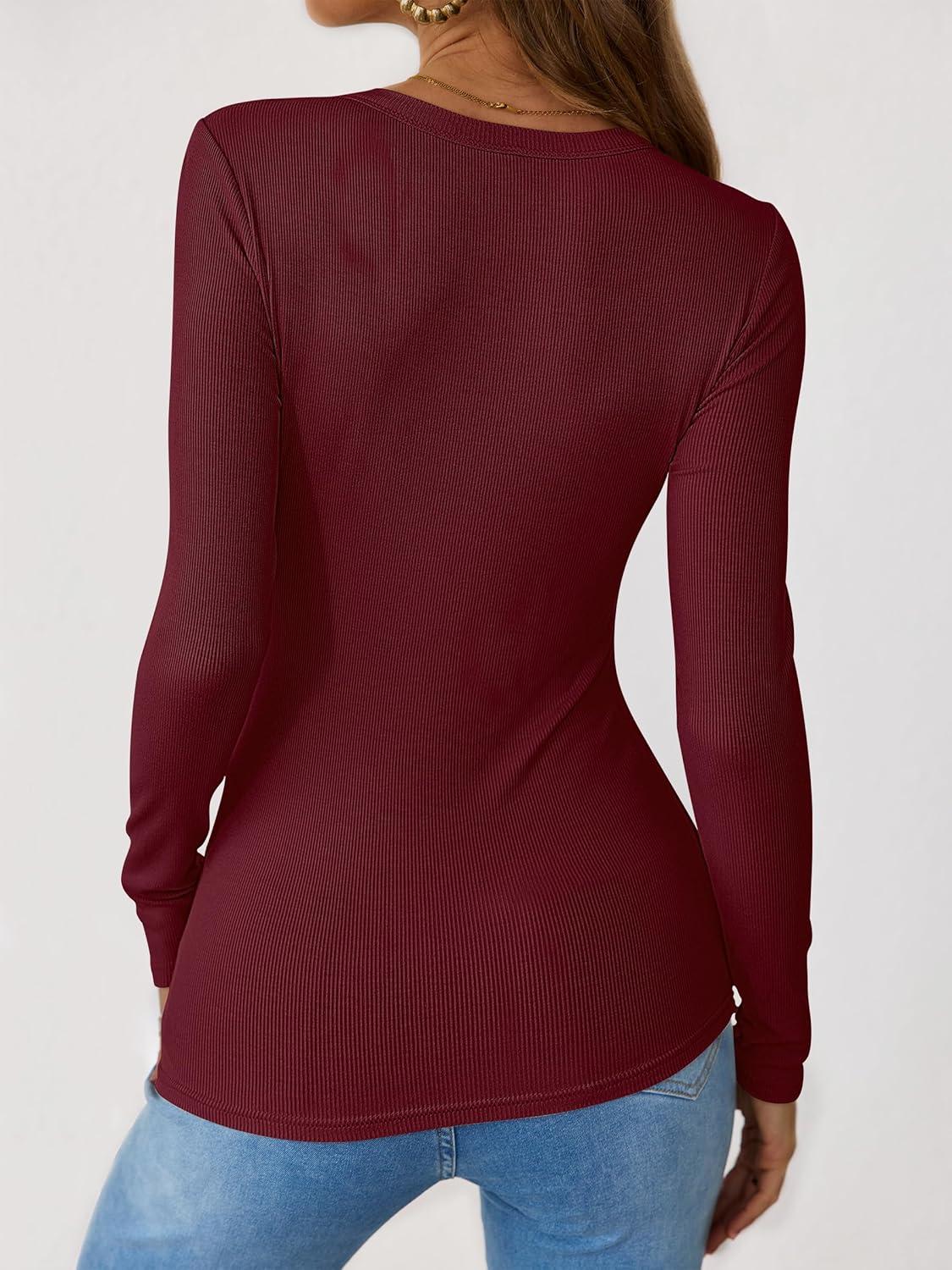 ANRABESS Long Sleeve Shirts for Women Henley Button Down Tops Ribbed Knit Slim Fit Fall Basic Tee 2025 Casual Trendy Clothes(Burgundy)