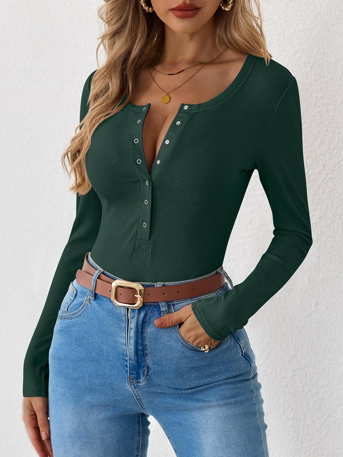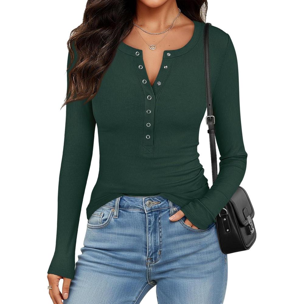 imageANRABESS Long Sleeve Shirts for Women Henley Button Down Tops Ribbed Knit Slim Fit Fall Basic Tee 2025 Casual Trendy ClothesForest Green