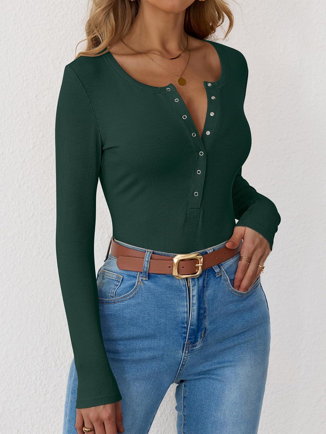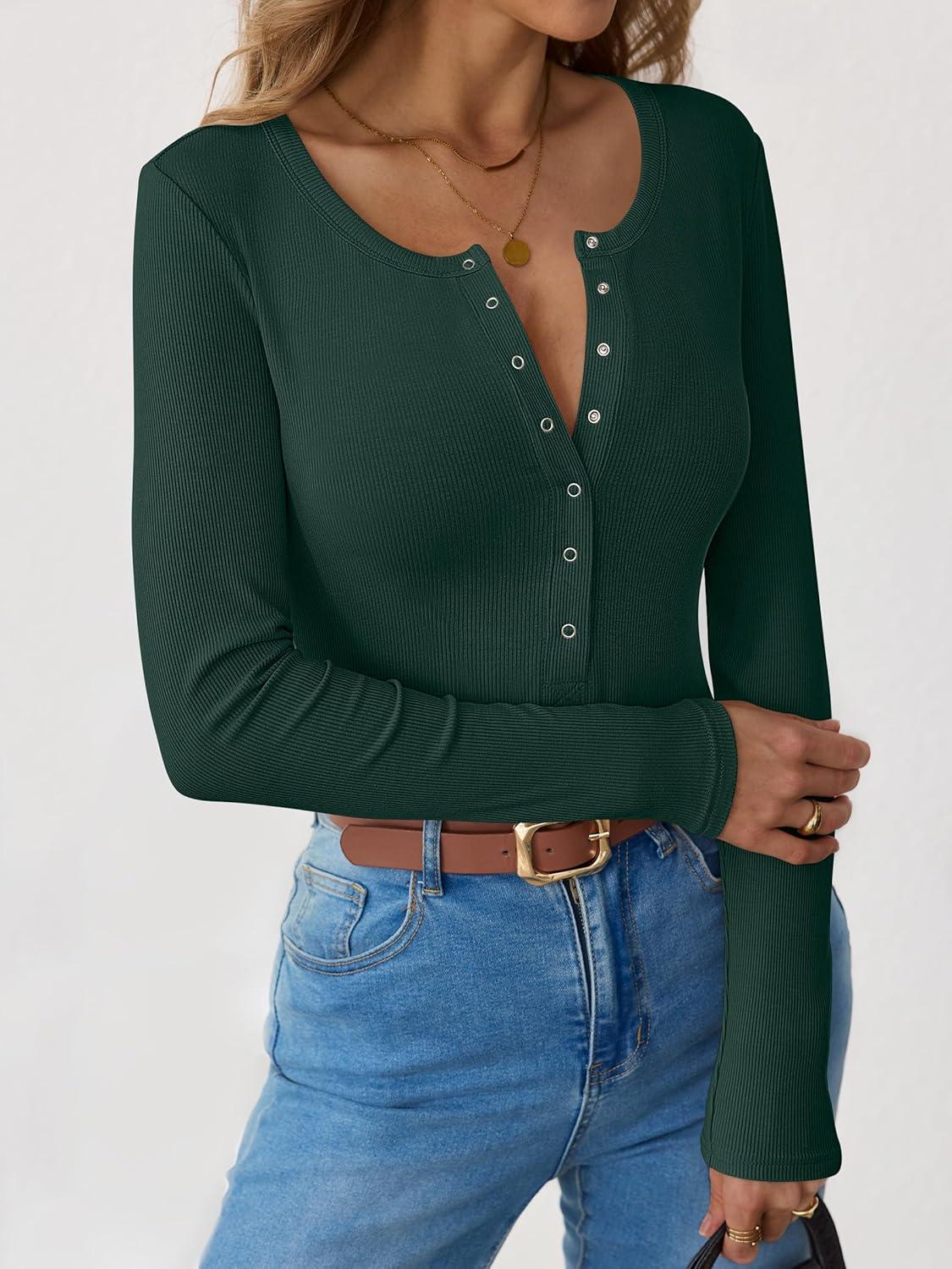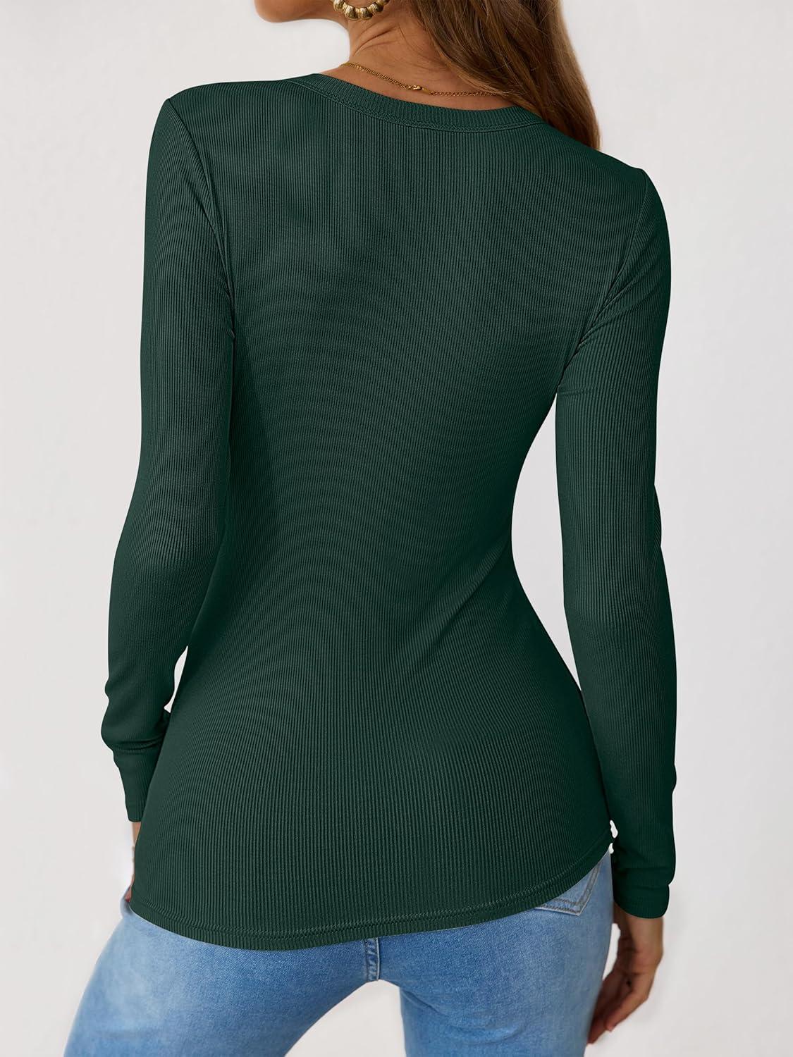 ANRABESS Long Sleeve Shirts for Women Henley Button Down Tops Ribbed Knit Slim Fit Fall Basic Tee 2025 Casual Trendy Clothes(Forest Green)