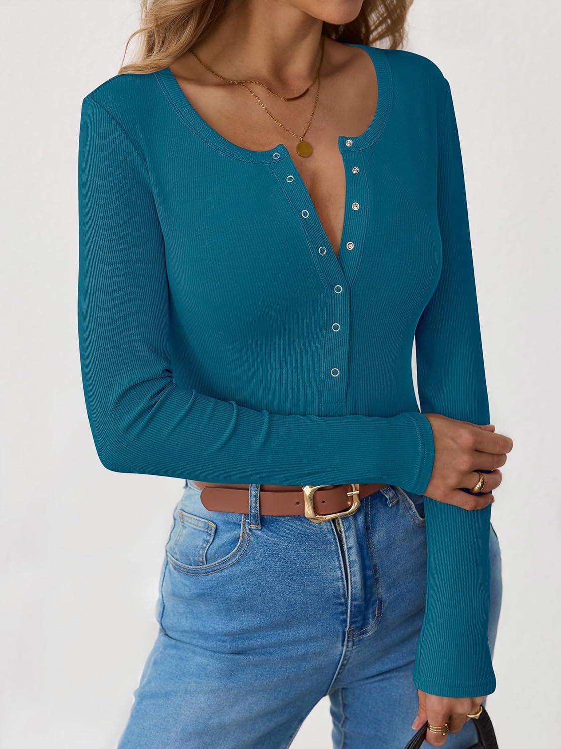 imageANRABESS Long Sleeve Shirts for Women Henley Button Down Tops Ribbed Knit Slim Fit Fall Basic Tee 2025 Casual Trendy ClothesLake Blue
