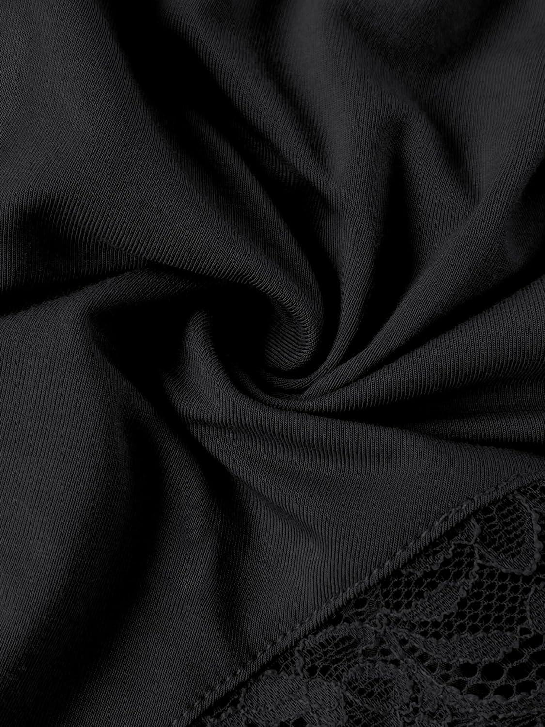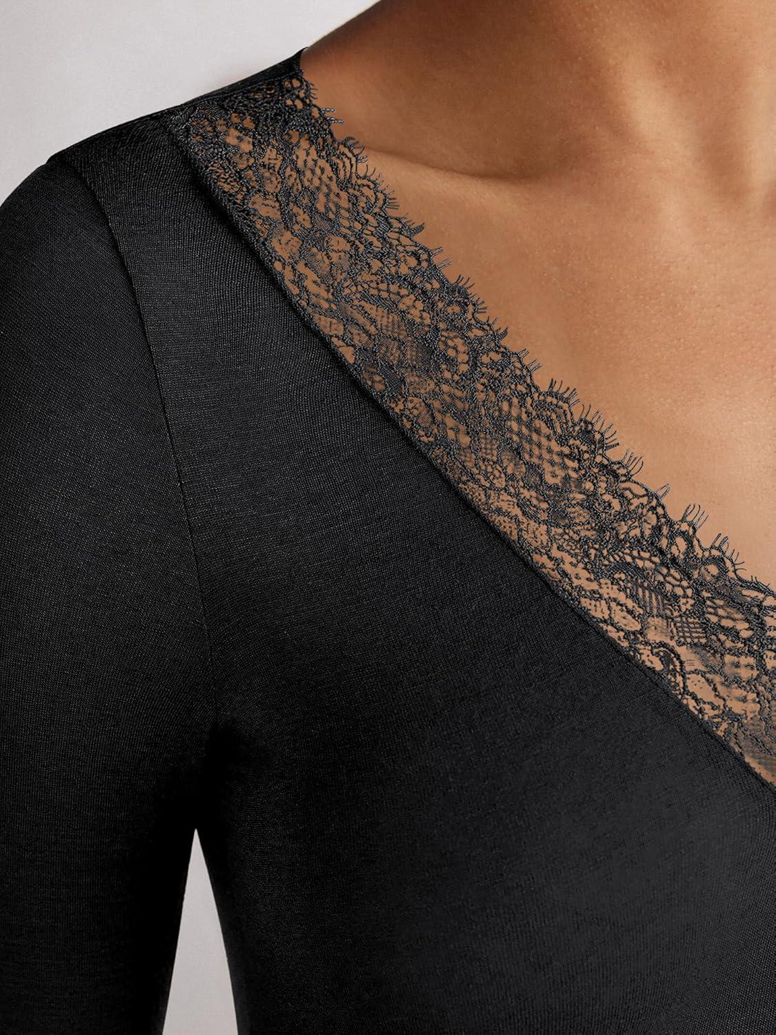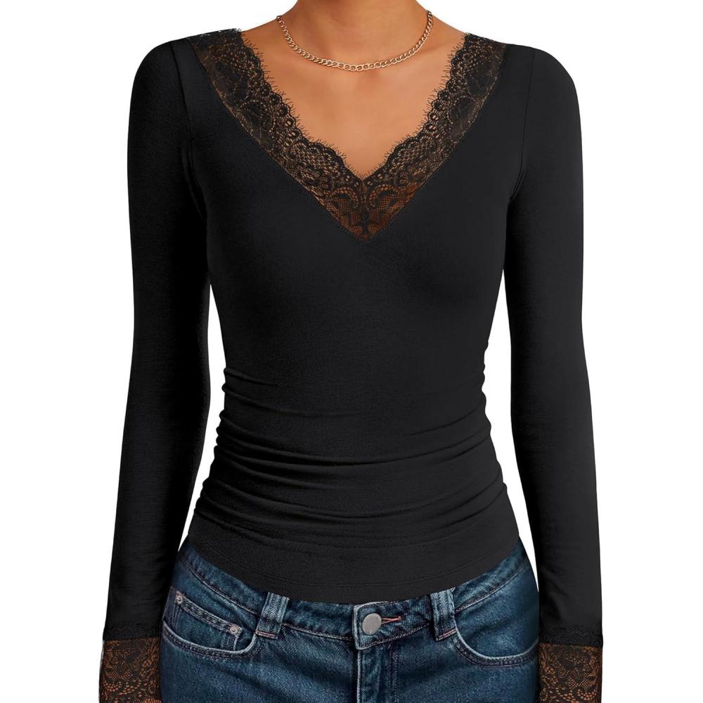 ANRABESS Long Sleeve Shirts for Women Lace V Neck Slim Fit Basic T-Shirt Dressy Casual Blouses 2025 Trendy Fall Going Out Top(Black)