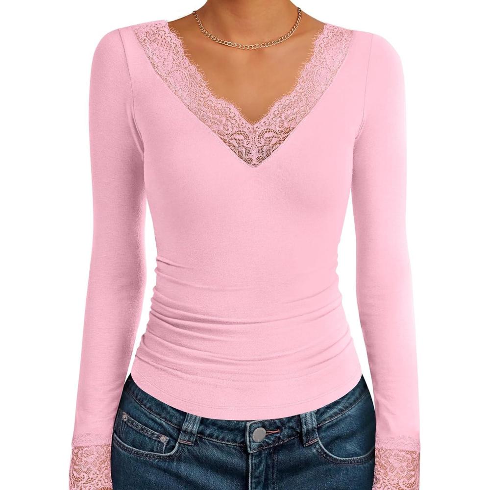 Don’t break the bank! Get the ANRABESS Long Sleeve Shirts for Women Lace V Neck Slim Fit Basic T-Shirt Dressy Casual Blouses 2025 Trendy Fall Going Out Top(Light Pink) you want at a price you can afford during our markdown sale.