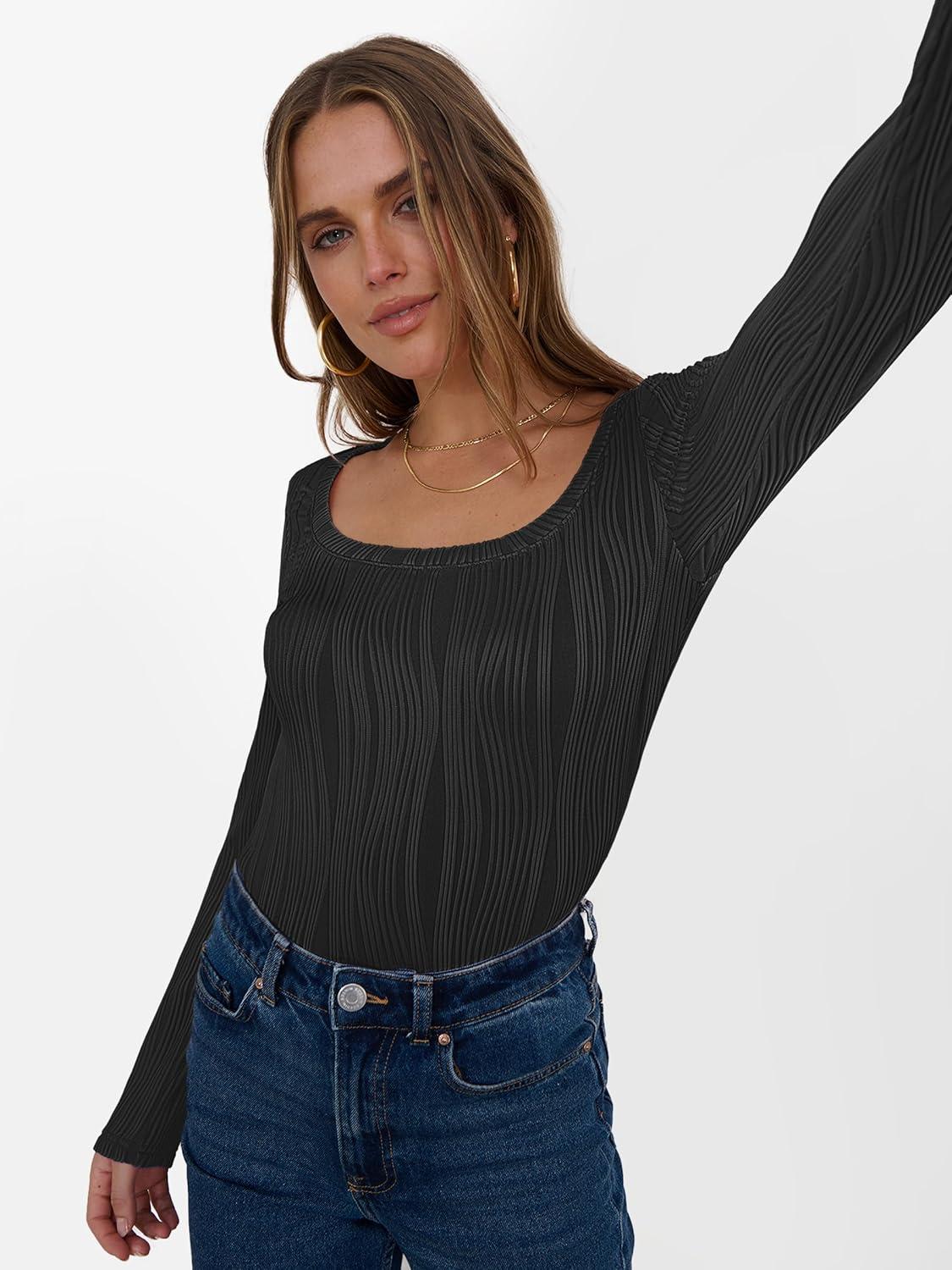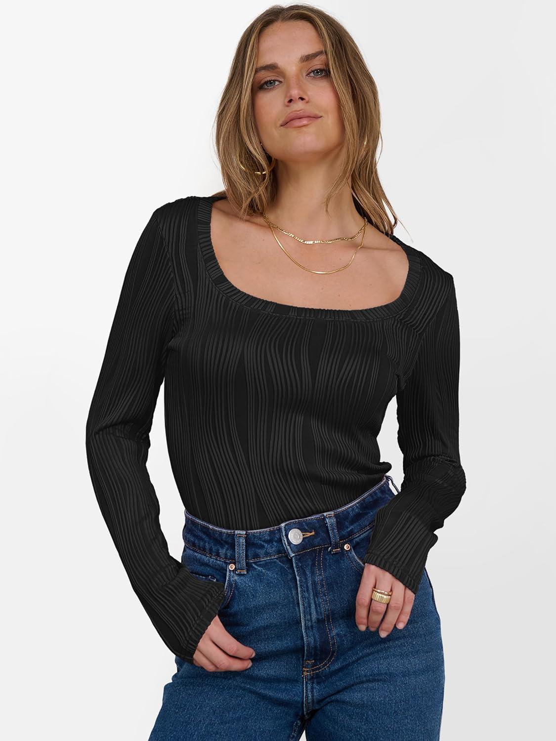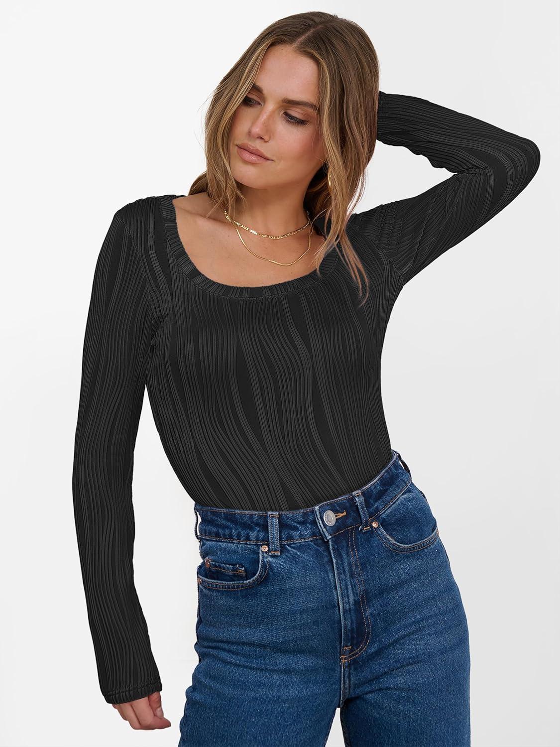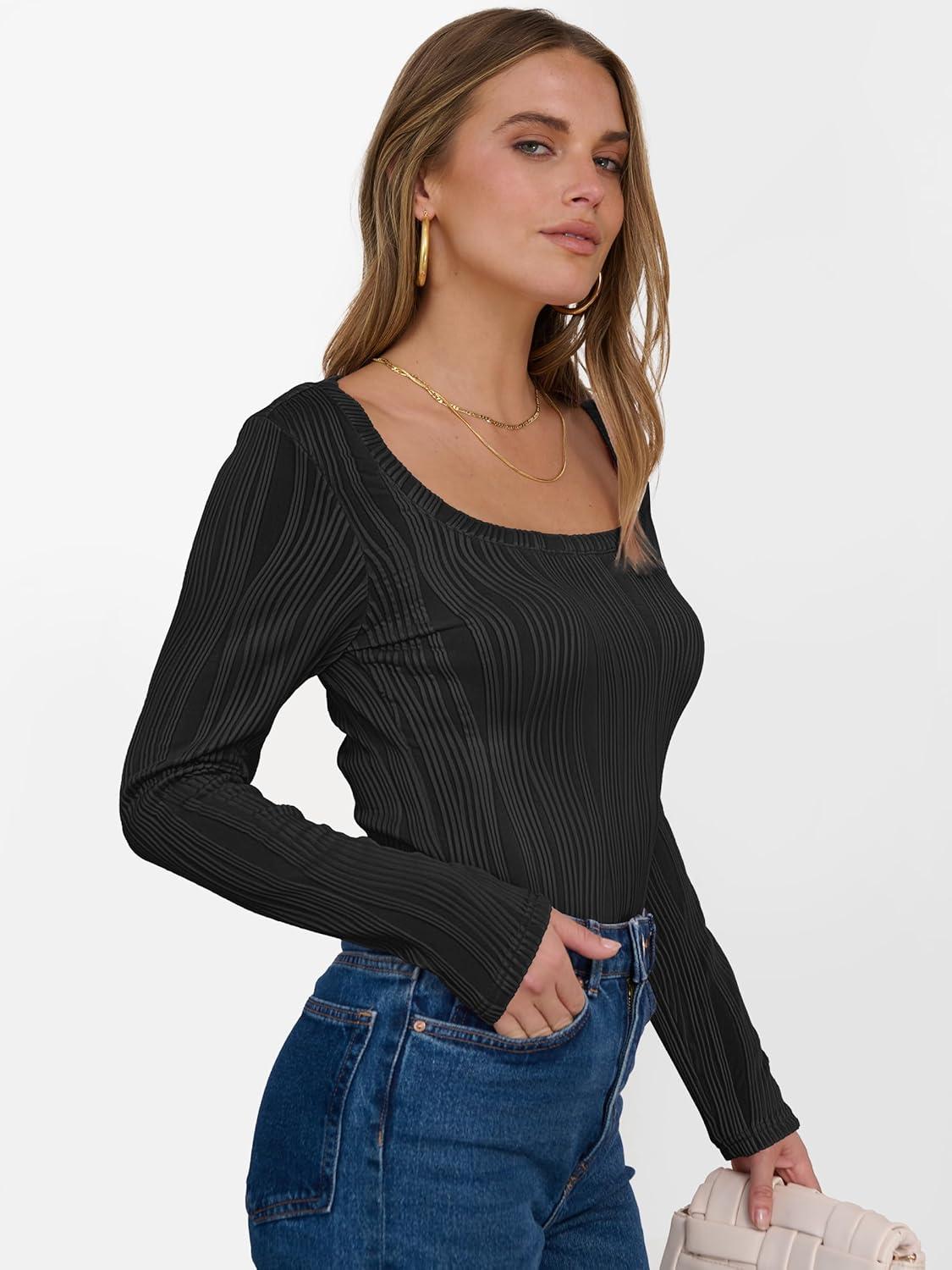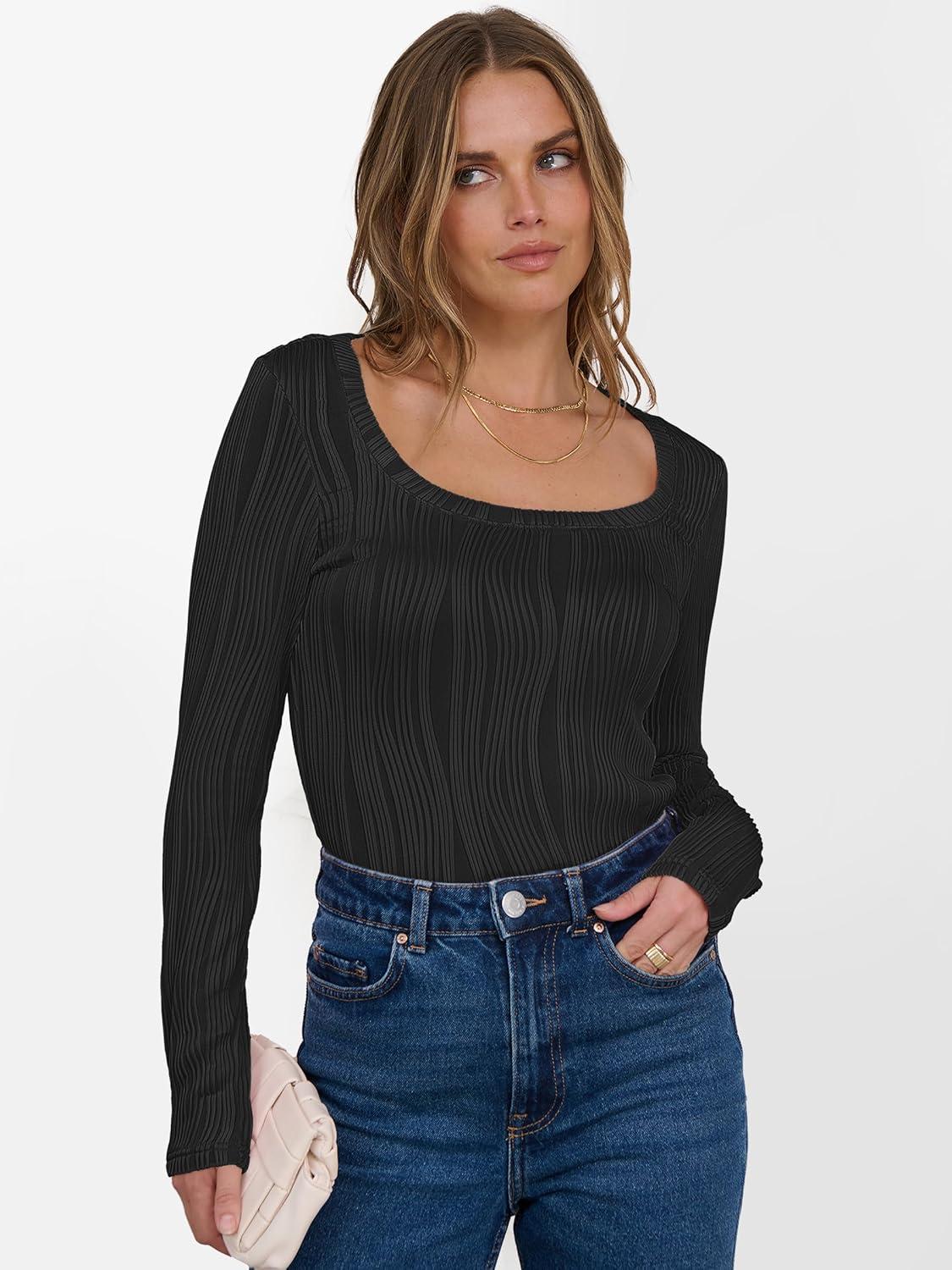 ANRABESS Long Sleeve Shirts for Women Scoop Neck Tops 2025 Fall Trendy Casual Knit Slim Fit Textured Blouses(Black)