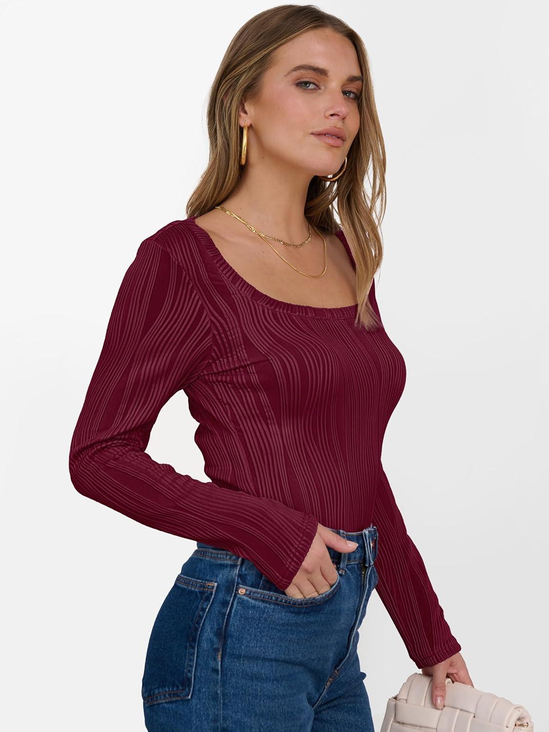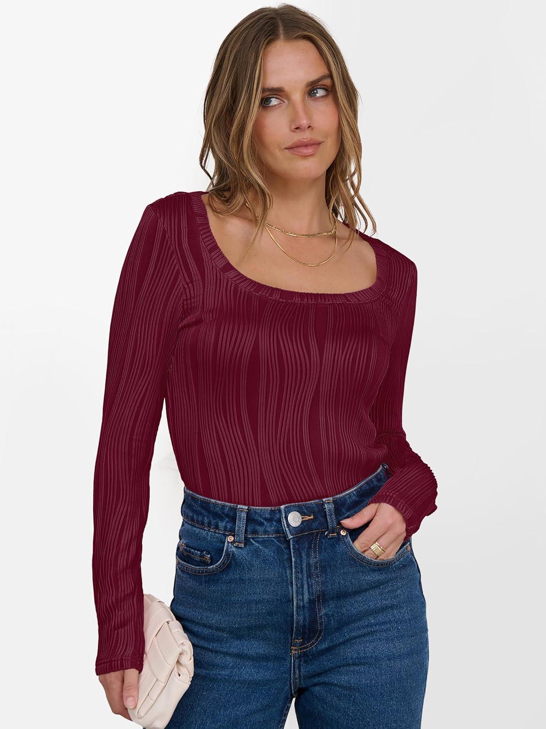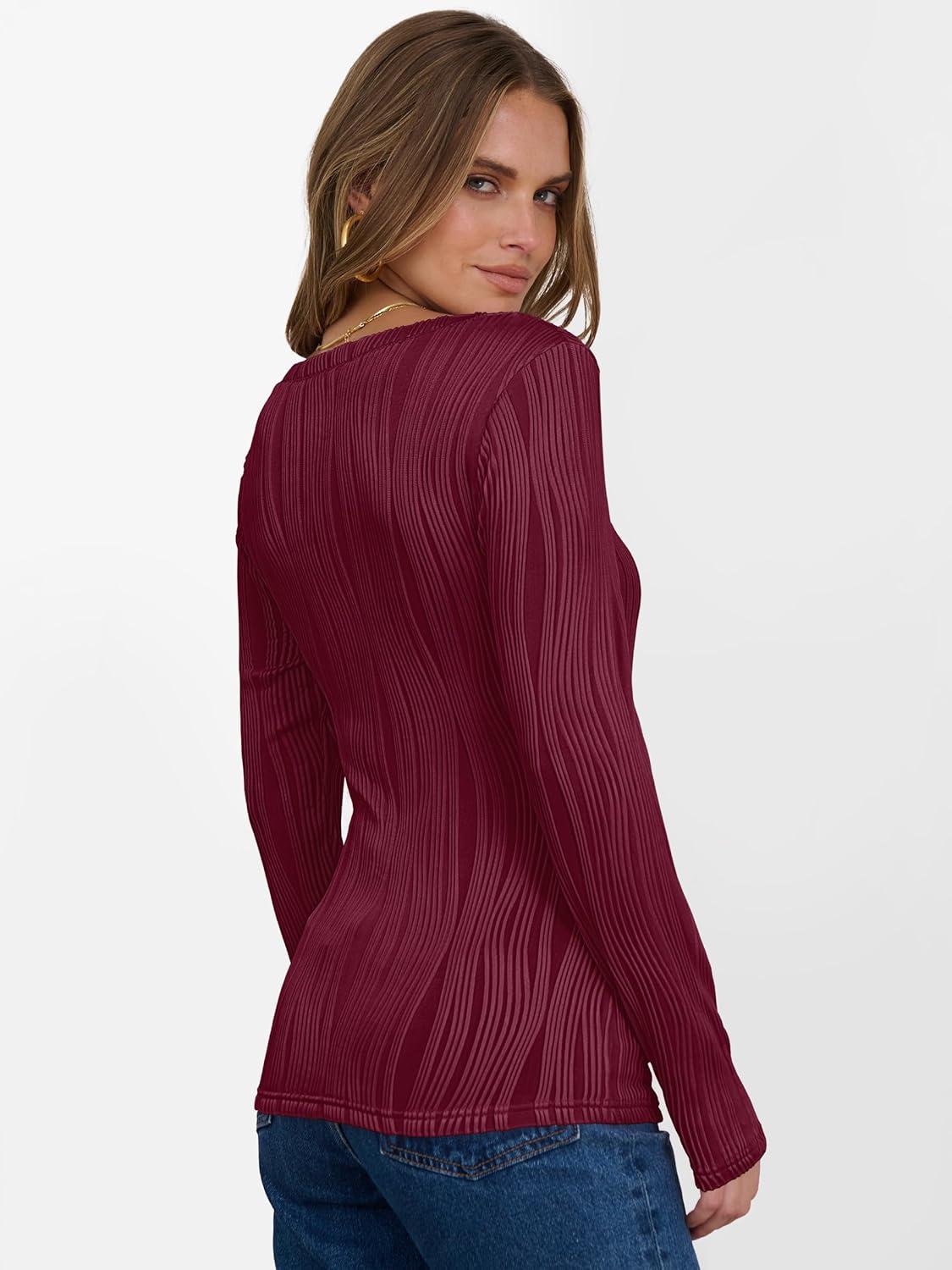 ANRABESS Long Sleeve Shirts for Women Scoop Neck Tops 2025 Fall Trendy Casual Knit Slim Fit Textured Blouses(Burgundy)