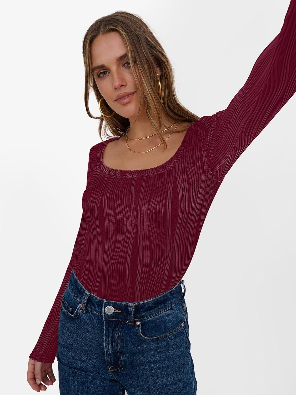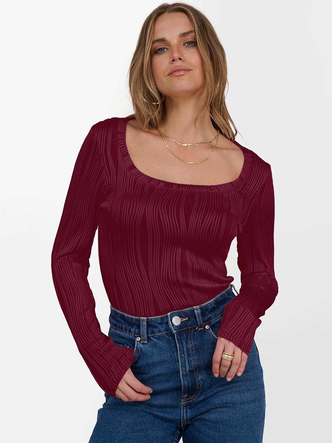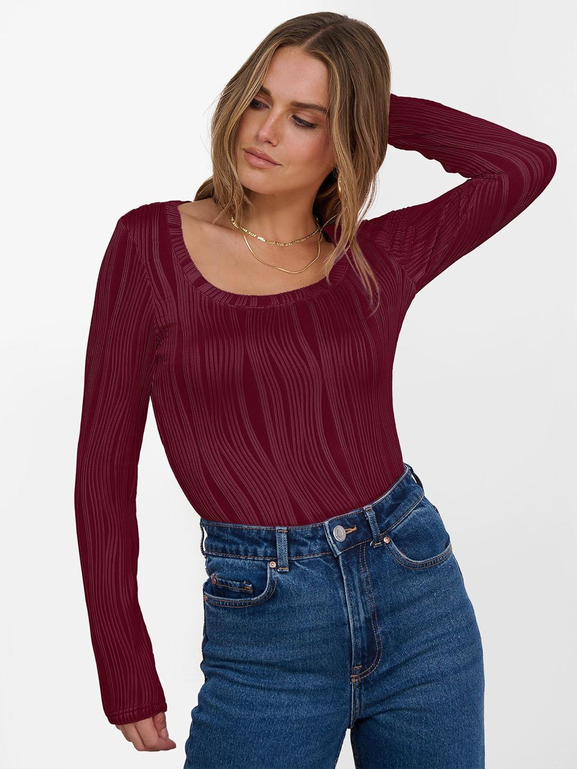 ANRABESS Long Sleeve Shirts for Women Scoop Neck Tops 2025 Fall Trendy Casual Knit Slim Fit Textured Blouses(Burgundy)