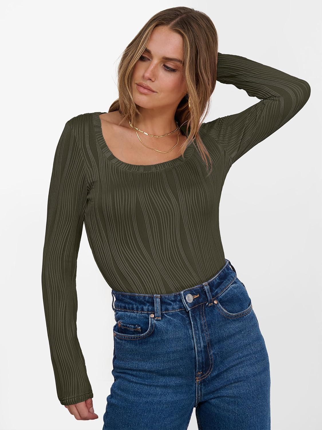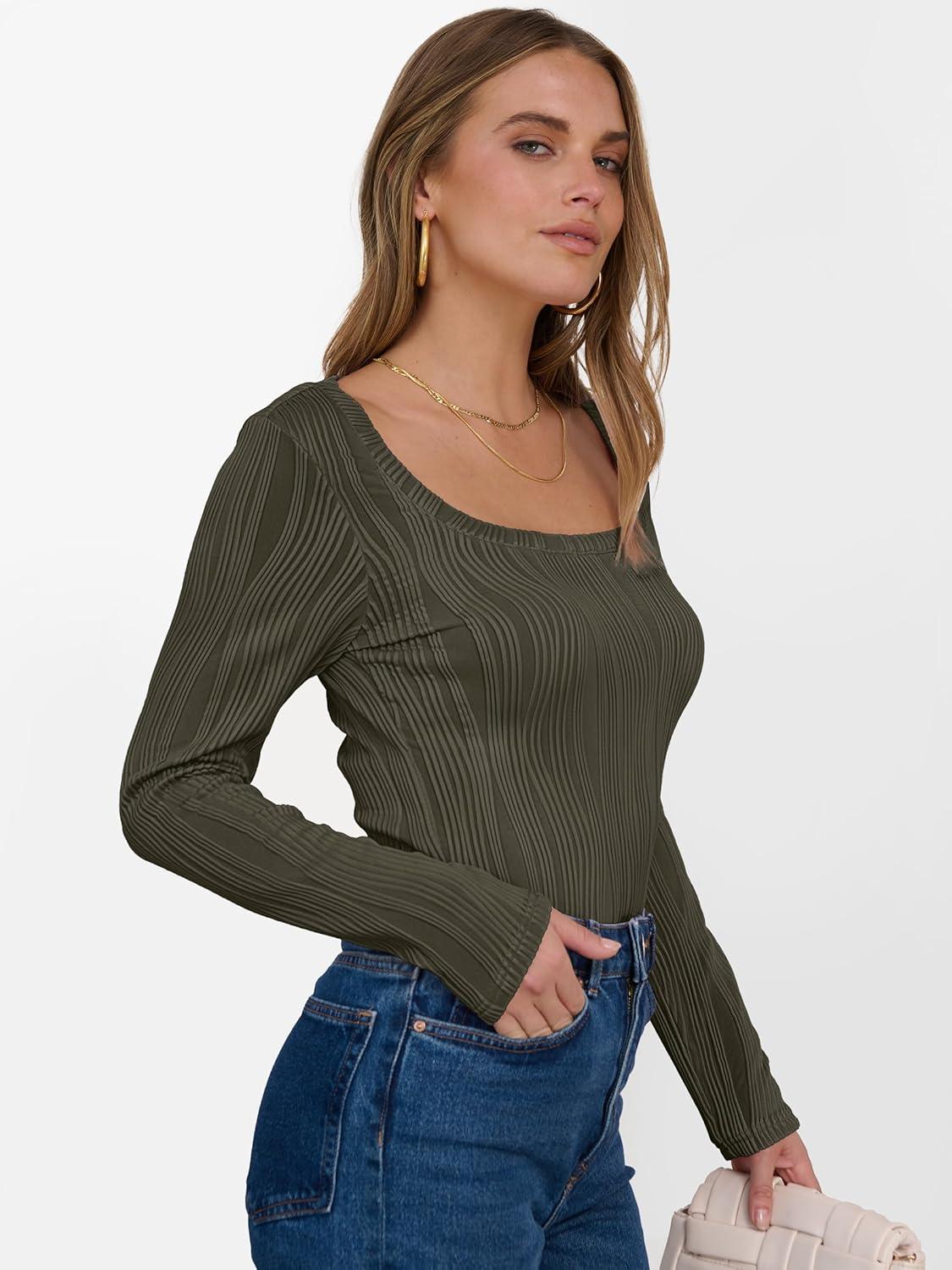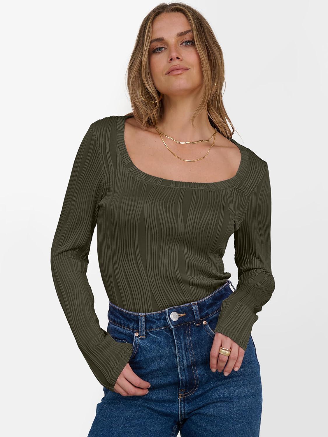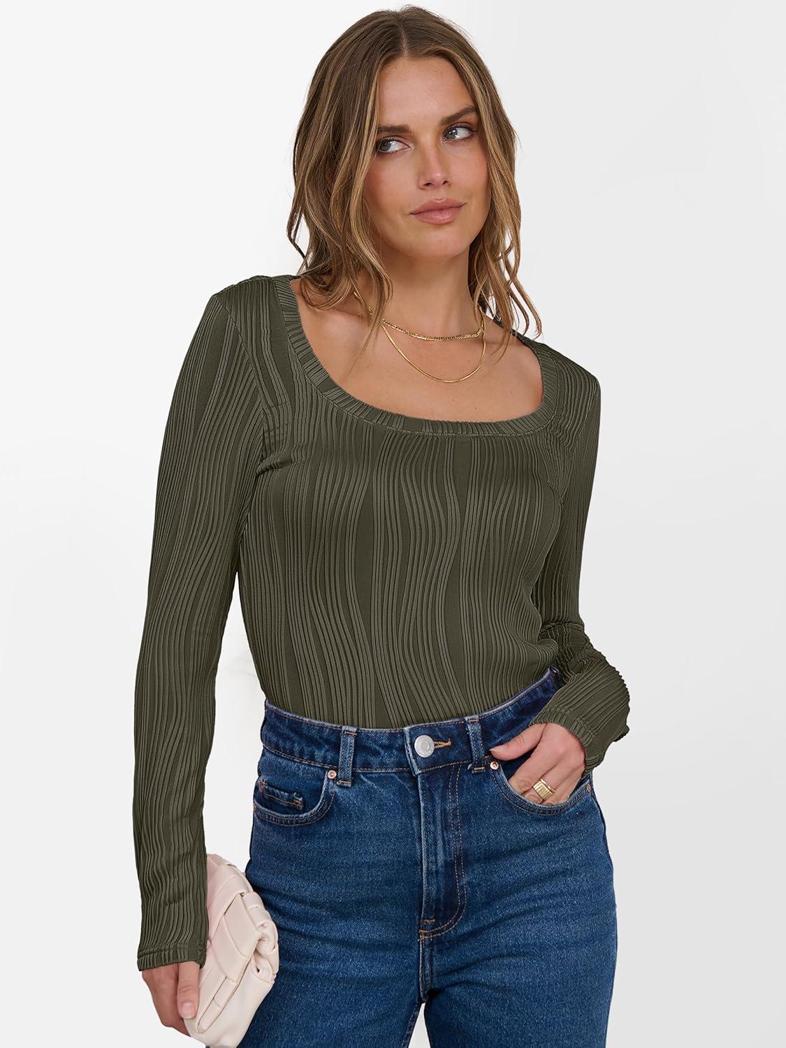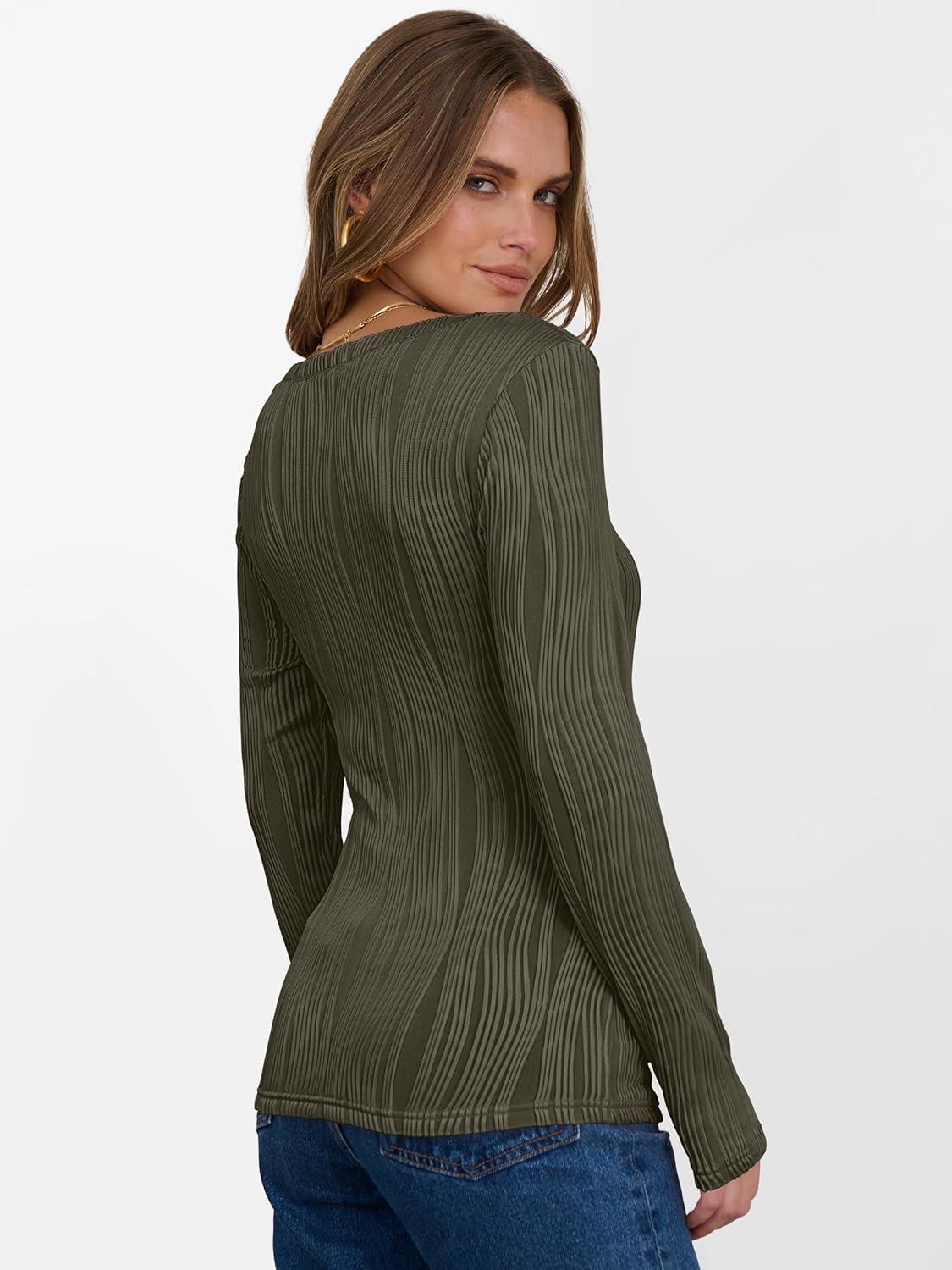 ANRABESS Long Sleeve Shirts for Women Scoop Neck Tops 2025 Fall Trendy Casual Knit Slim Fit Textured Blouses(Olive)