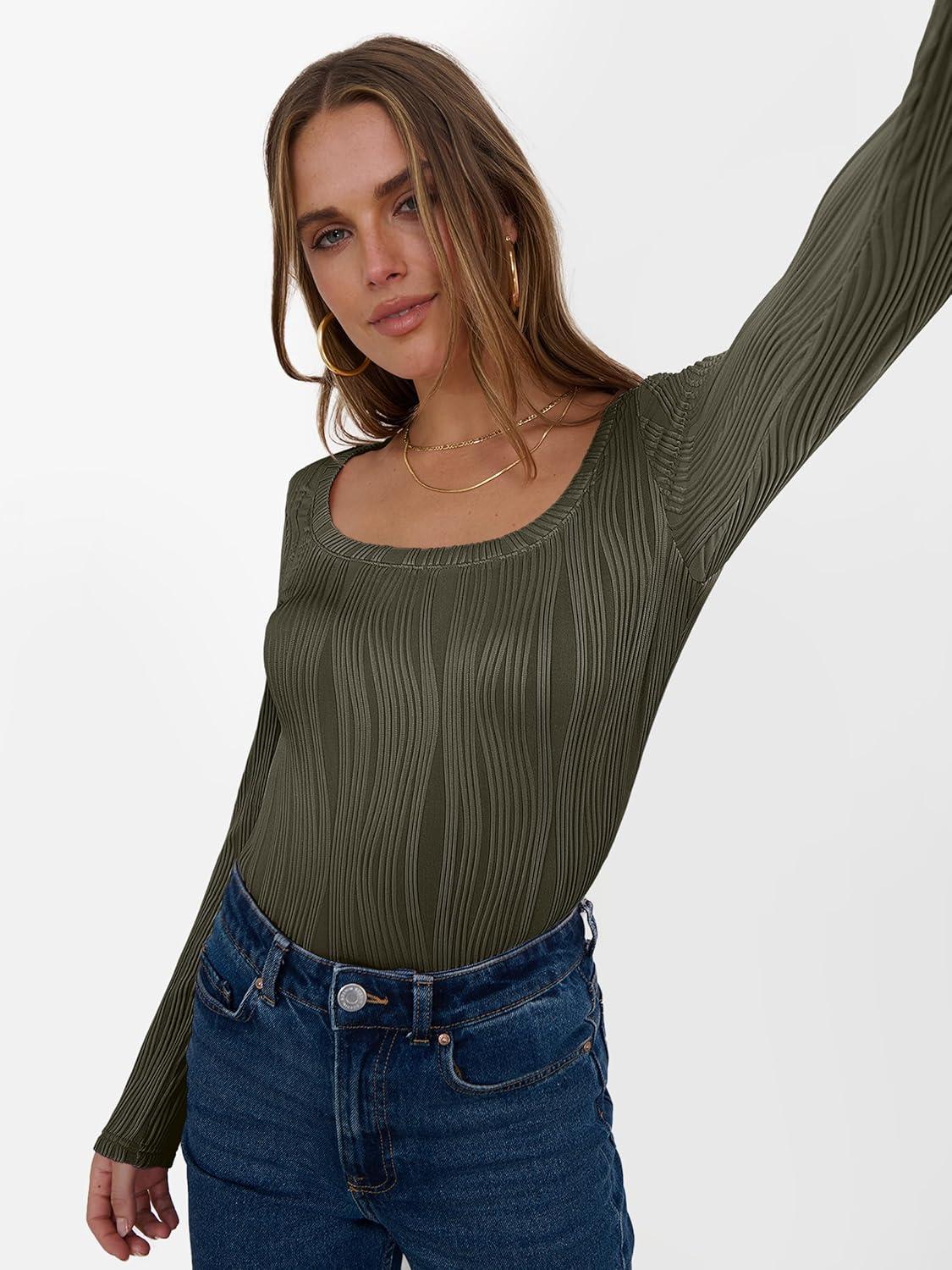 imageANRABESS Long Sleeve Shirts for Women Scoop Neck Tops 2025 Fall Trendy Casual Knit Slim Fit Textured BlousesOlive