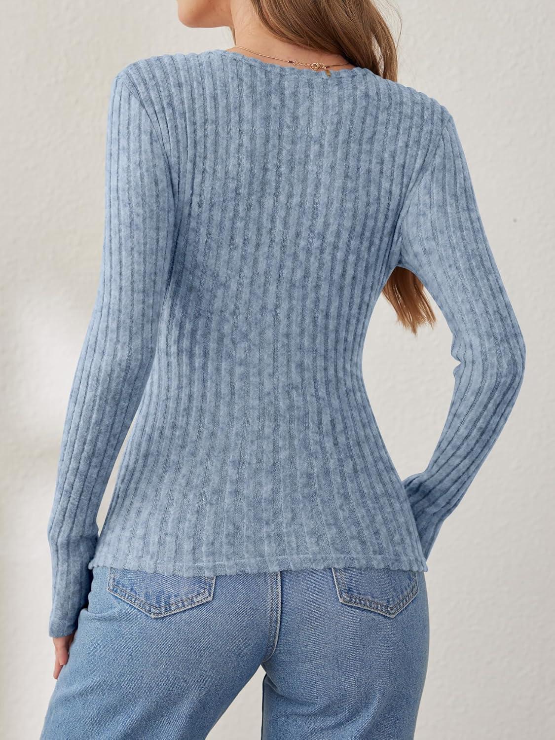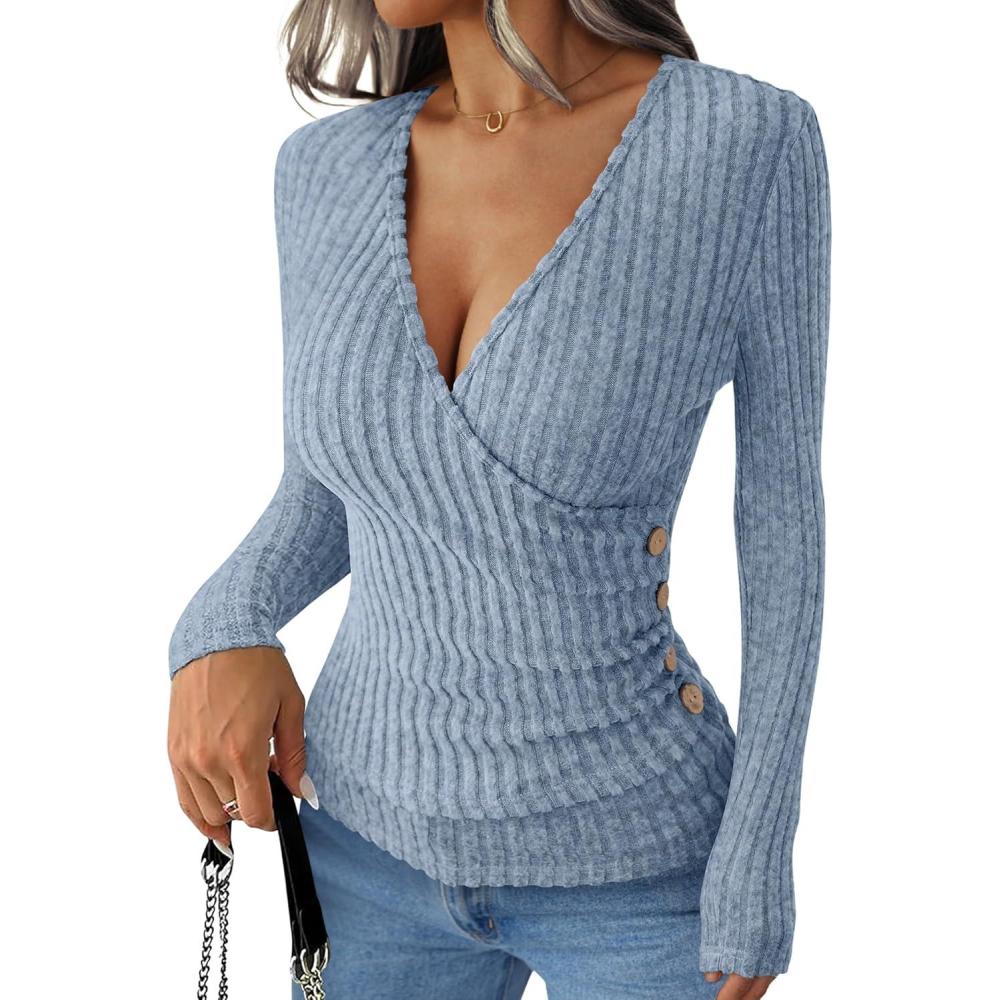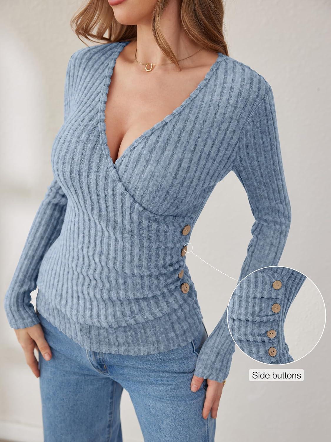 ANRABESS Long Sleeve Shirts for Women Sexy Sweater V Neck Ribbed Knit Slim Fit Wrap Top 2025 Fall Casual Fashion Clothes(Blue)