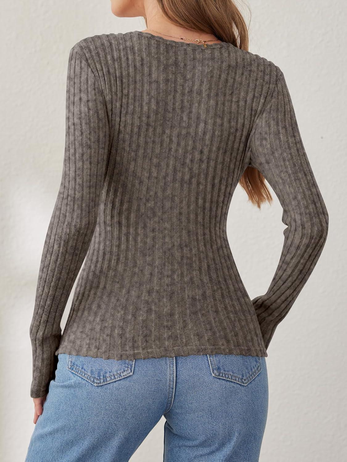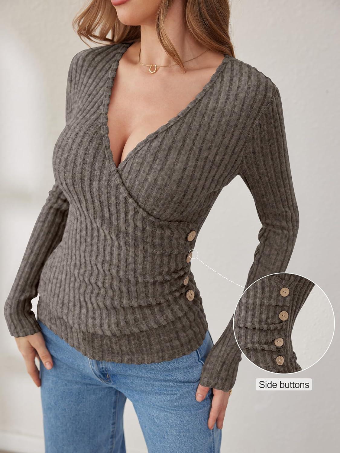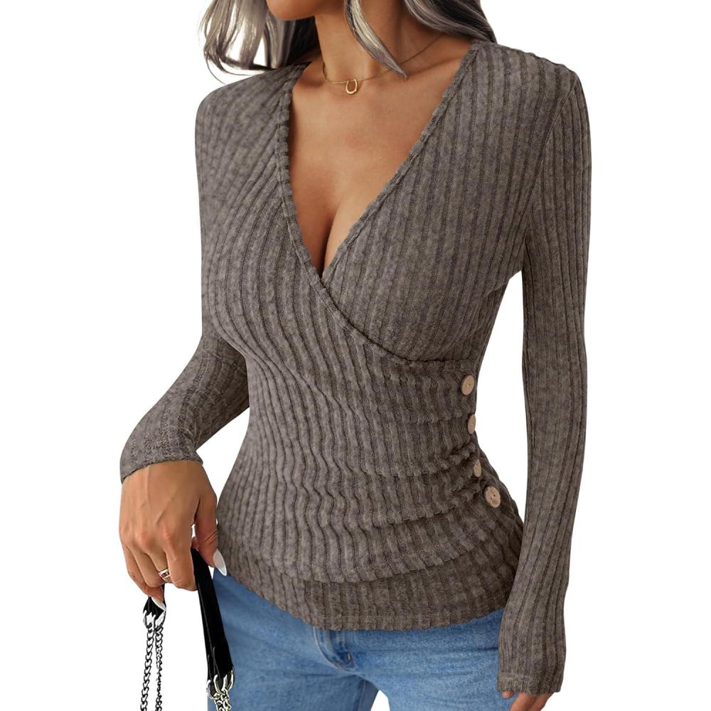 ANRABESS Long Sleeve Shirts for Women Sexy Sweater V Neck Ribbed Knit Slim Fit Wrap Top 2025 Fall Casual Fashion Clothes(Cool Ash Brown)