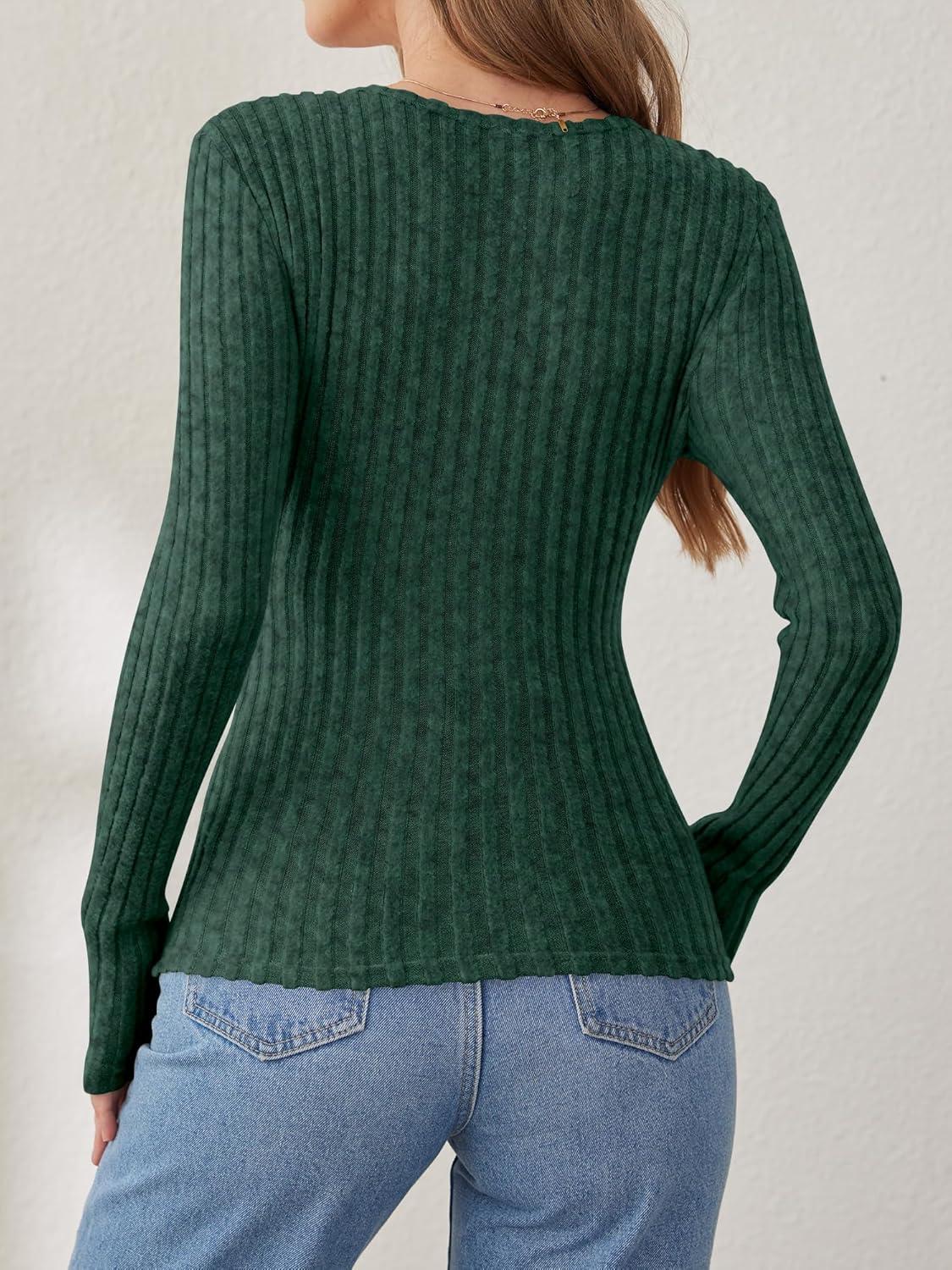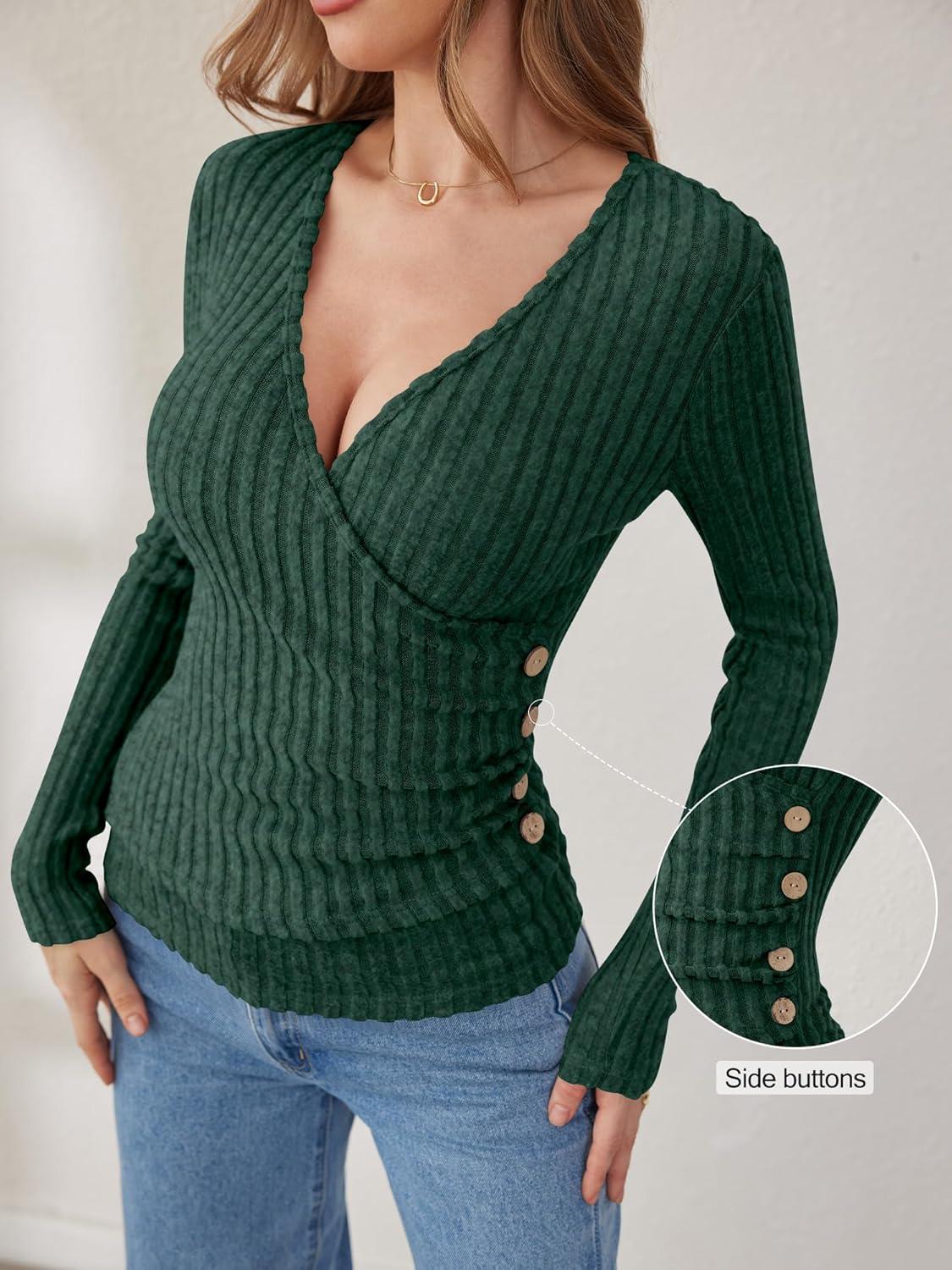 ANRABESS Long Sleeve Shirts for Women Sexy Sweater V Neck Ribbed Knit Slim Fit Wrap Top 2025 Fall Casual Fashion Clothes(Deep Green)