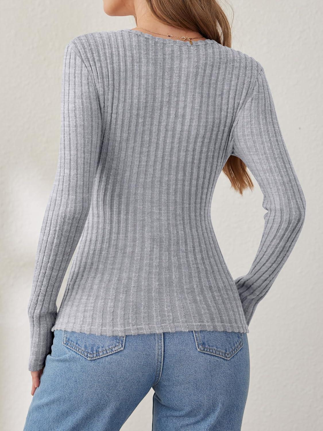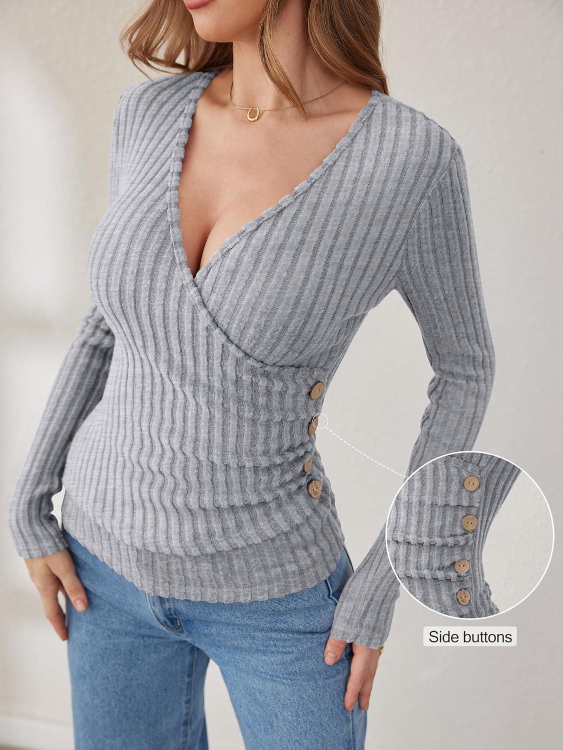 ANRABESS Long Sleeve Shirts for Women Sexy Sweater V Neck Ribbed Knit Slim Fit Wrap Top 2025 Fall Casual Fashion Clothes(Grey)