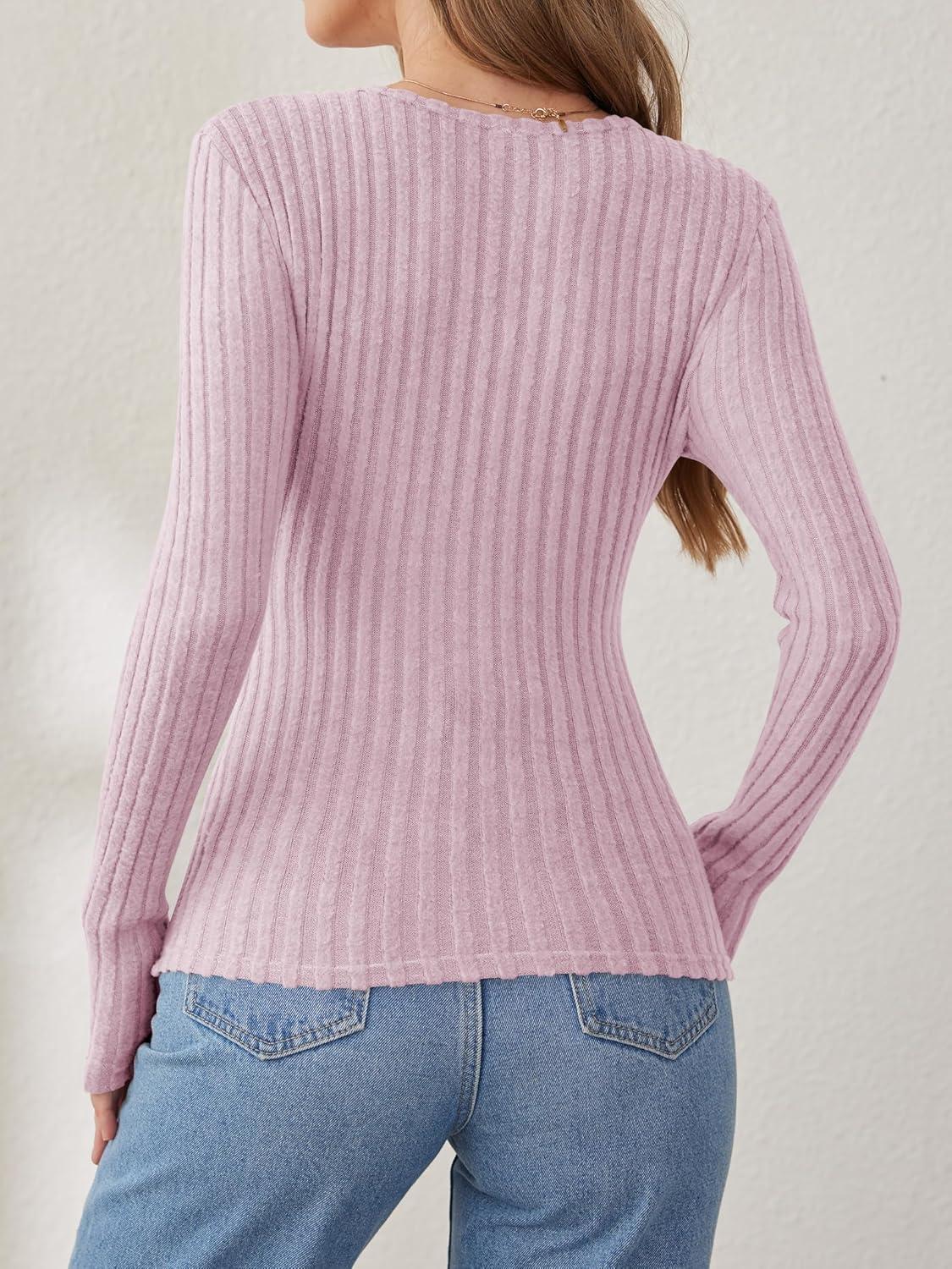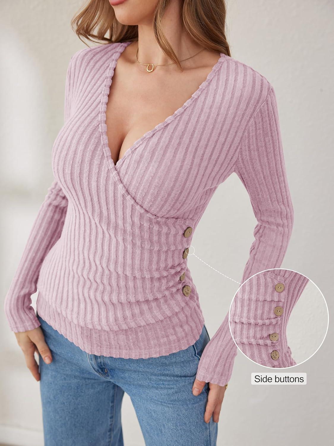ANRABESS Long Sleeve Shirts for Women Sexy Sweater V Neck Ribbed Knit Slim Fit Wrap Top 2025 Fall Casual Fashion Clothes(Pink)