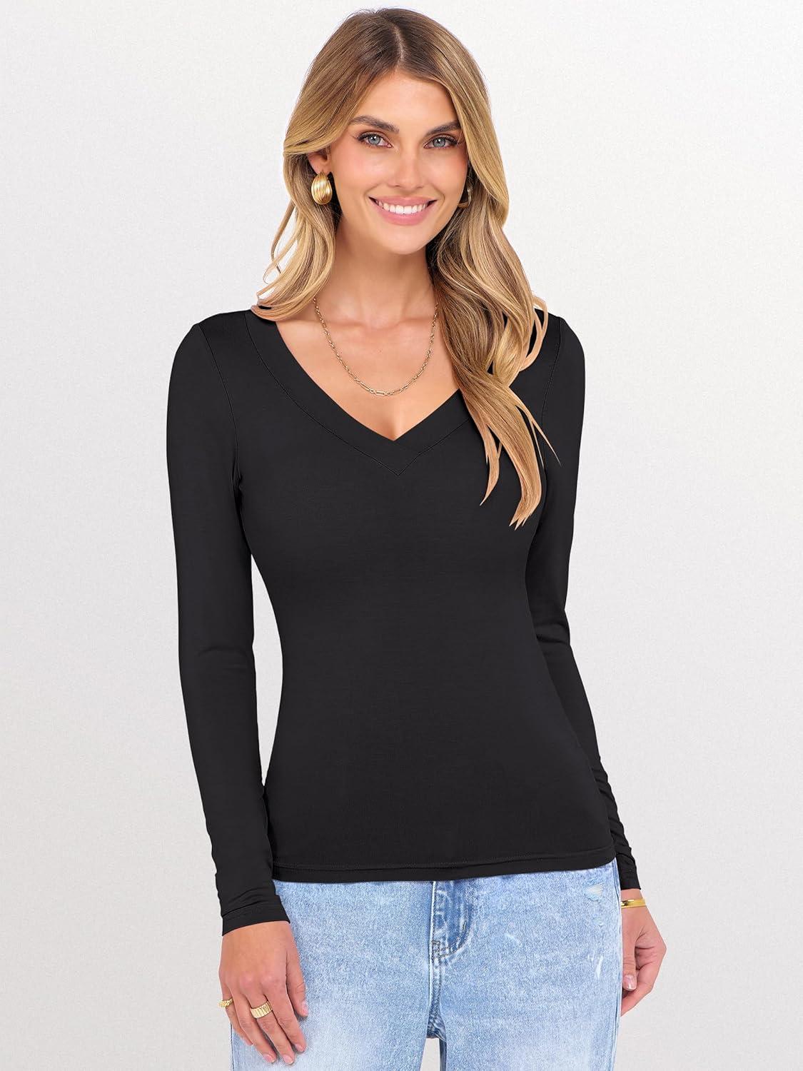 ANRABESS Long Sleeve Shirts for Women V Neck Basic Tees Top Casual Going Out Tshirt Workout Outfits 2025 Fall Fashion Clothes(Black)