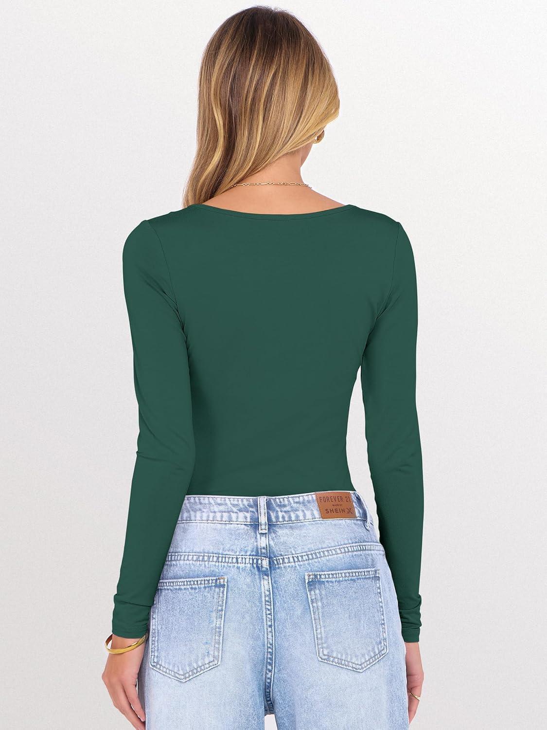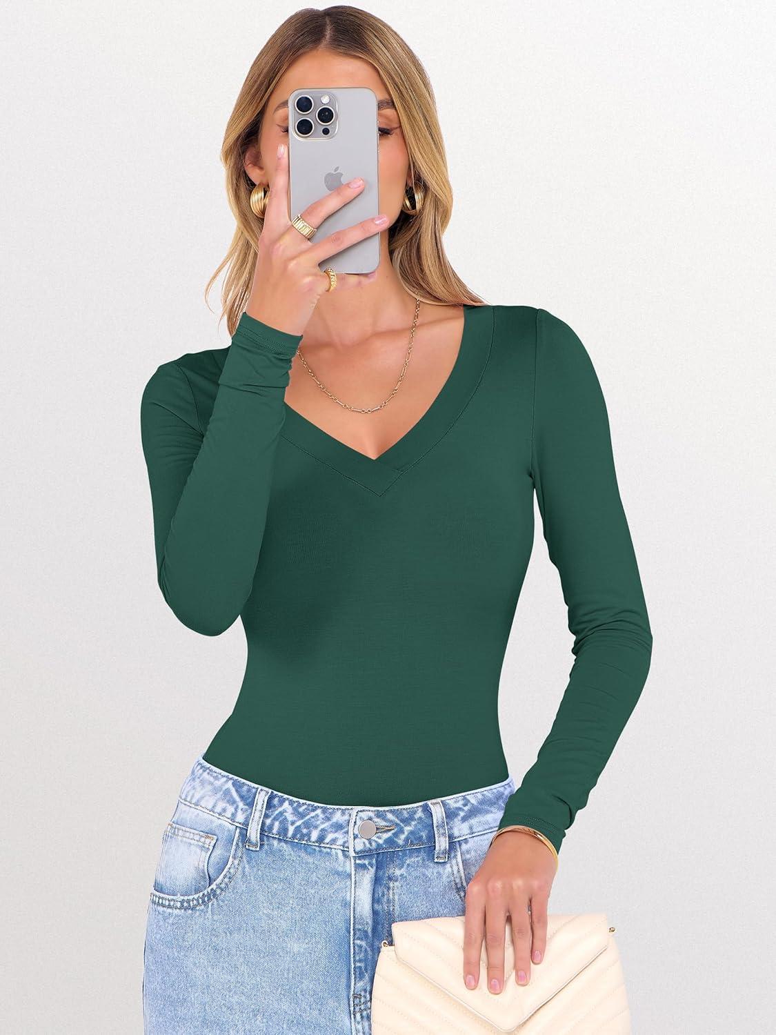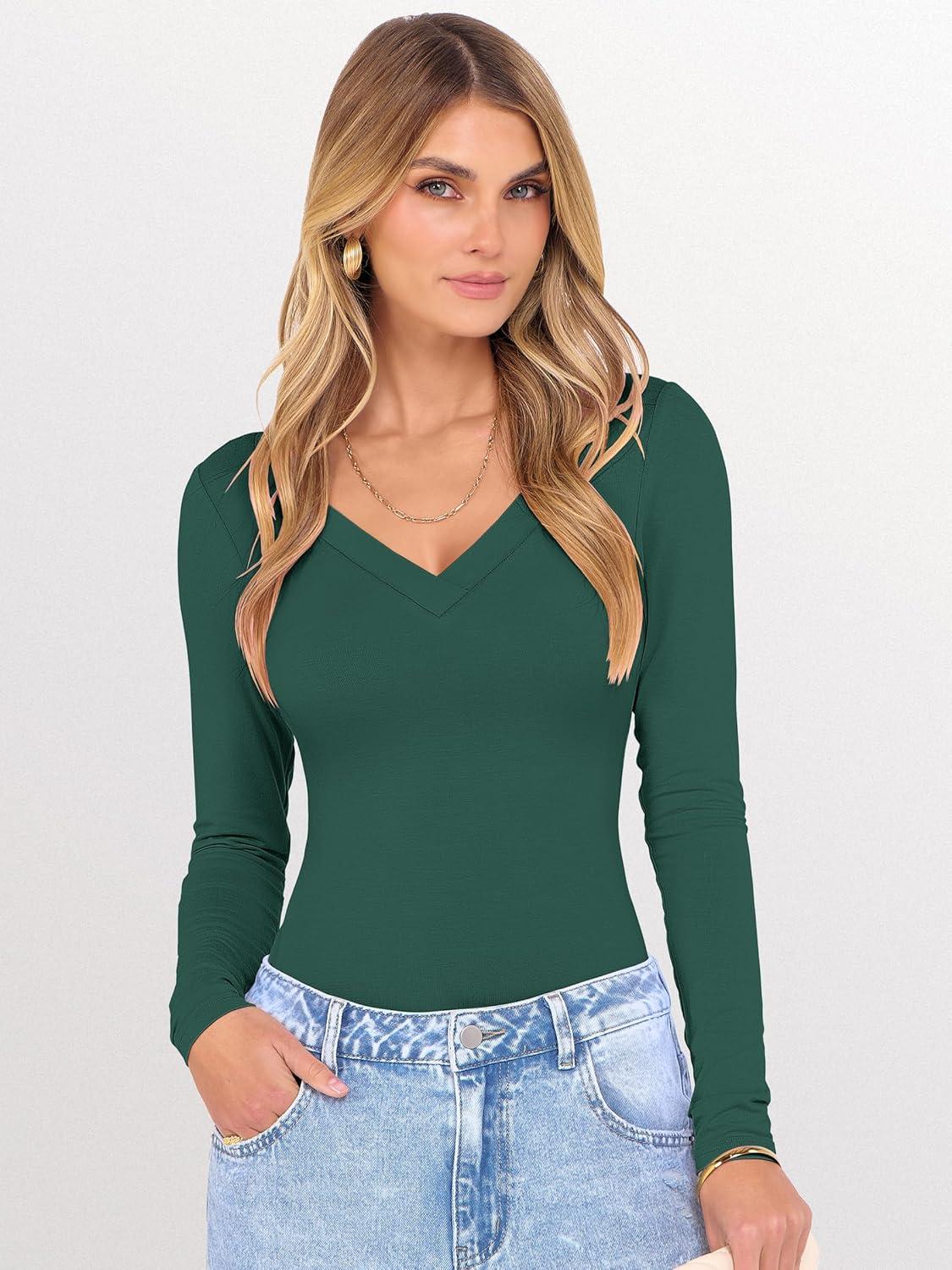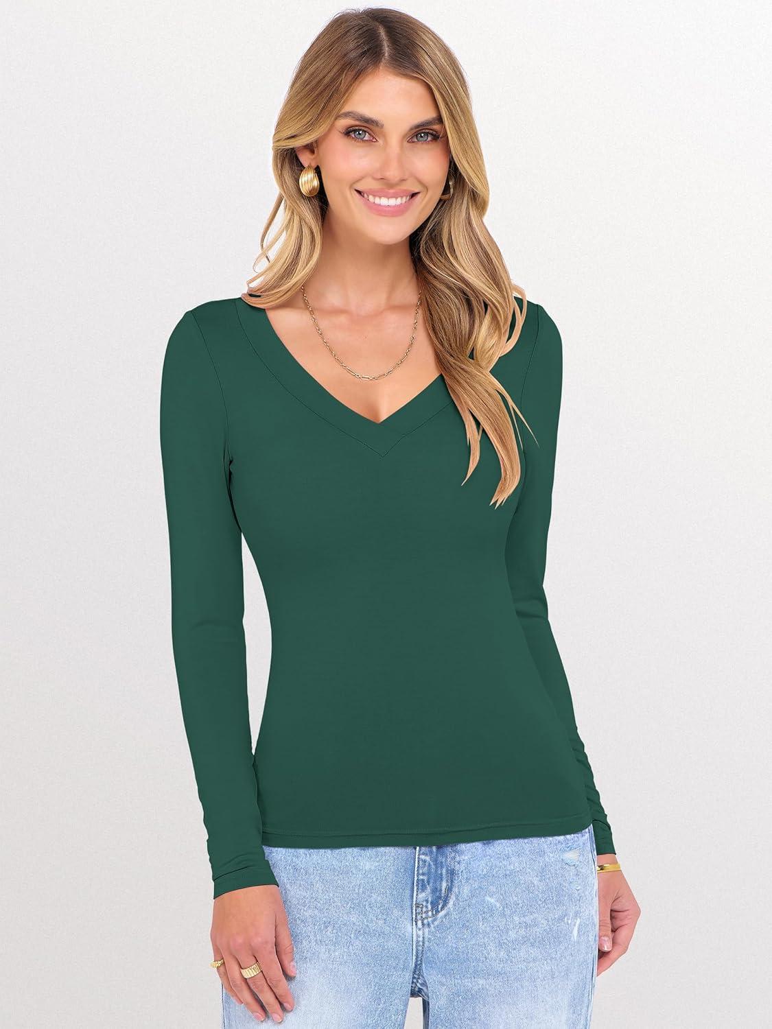 ANRABESS Long Sleeve Shirts for Women V Neck Basic Tees Top Casual Going Out Tshirt Workout Outfits 2025 Fall Fashion Clothes(Deep Green)