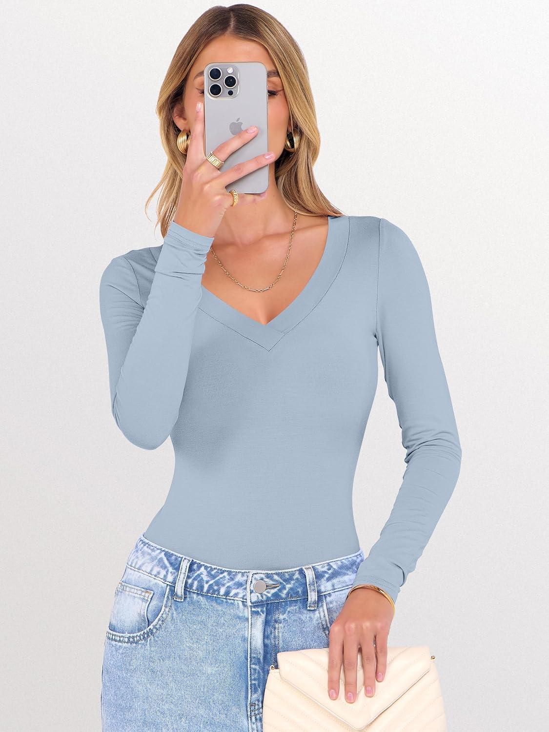 ANRABESS Long Sleeve Shirts for Women V Neck Basic Tees Top Casual Going Out Tshirt Workout Outfits 2025 Fall Fashion Clothes(Light Blue)
