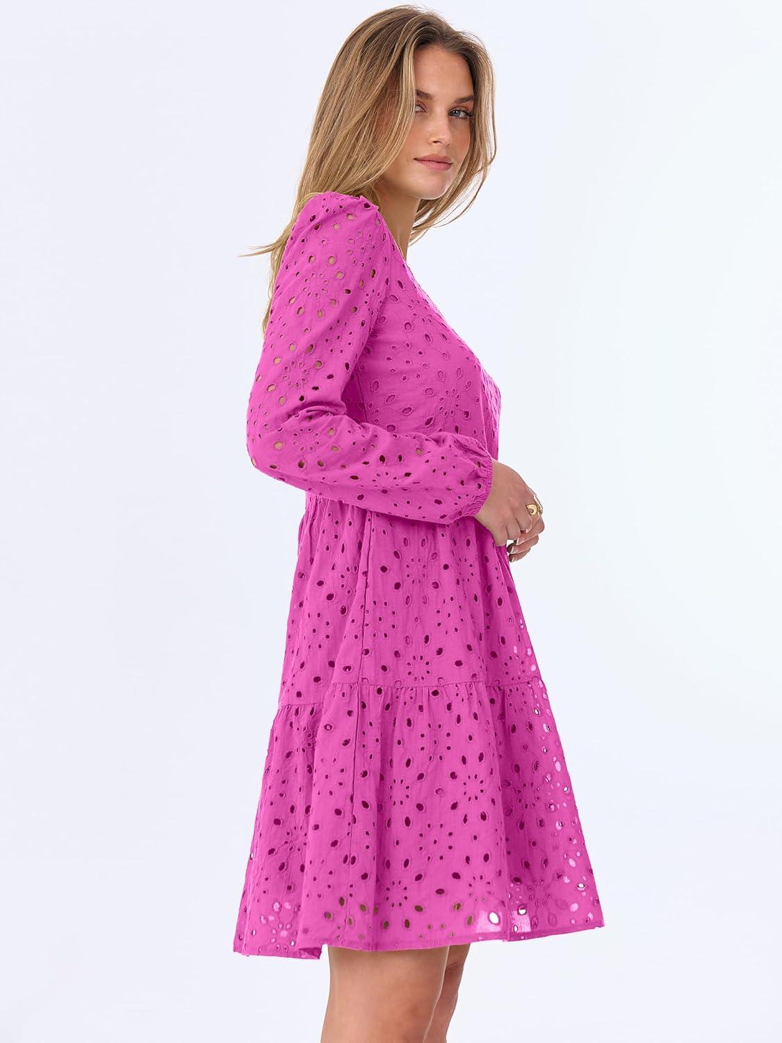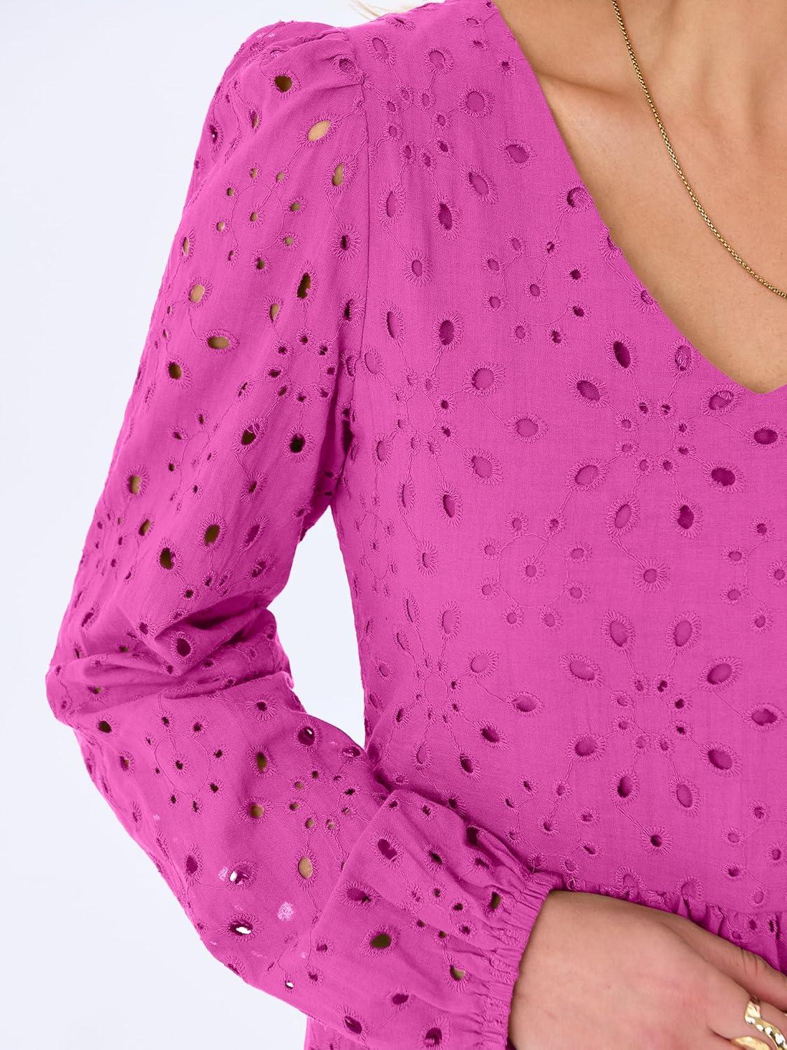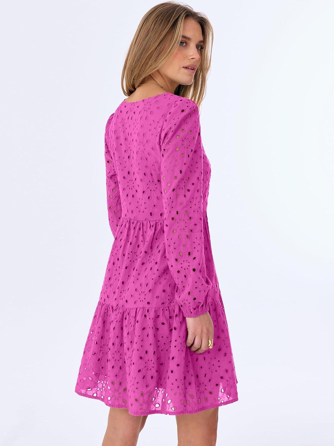 imageANRABESS Long Sleeve V Neck Dresses for Women Eyelet Hollow Out Business Casual Tiered 2025 Fall Mini Dress with PocketsHot Pink