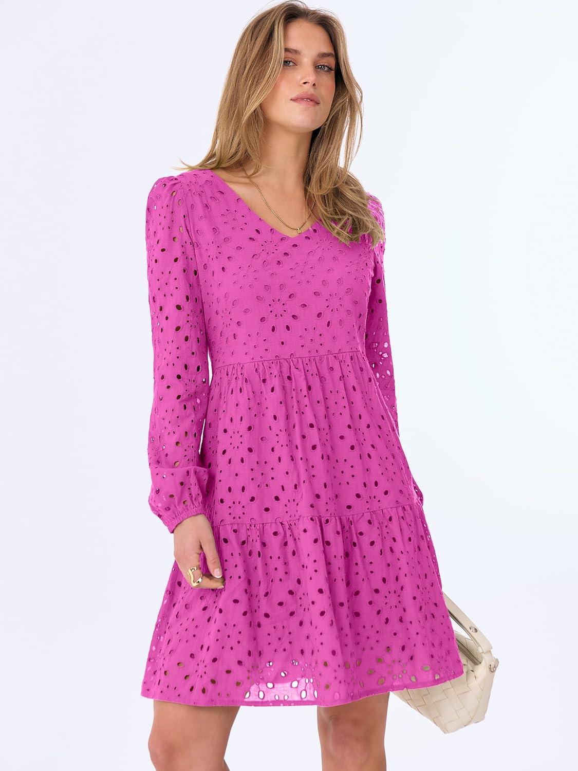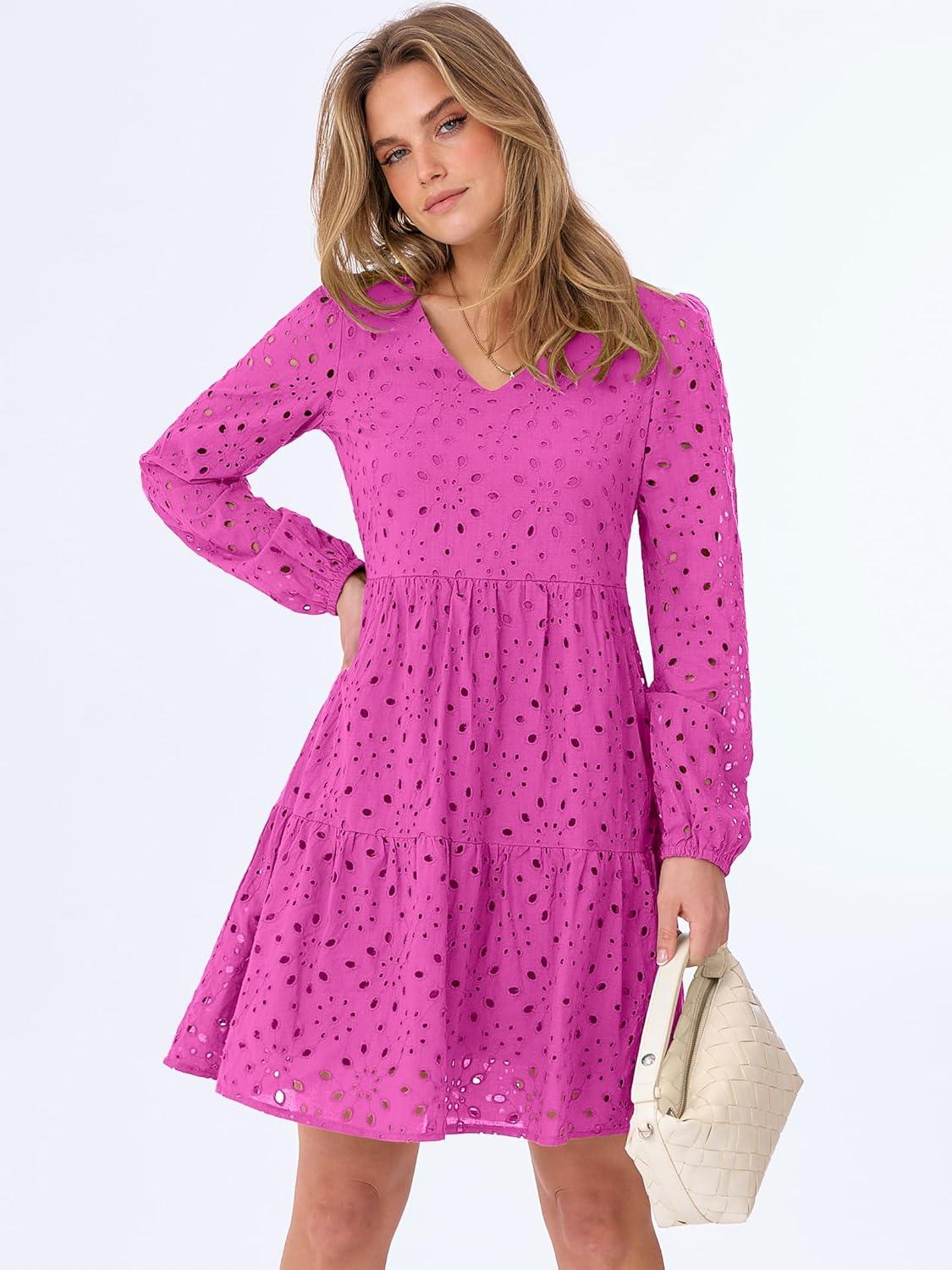 ANRABESS Long Sleeve V Neck Dresses for Women Eyelet Hollow Out Business Casual Tiered 2025 Fall Mini Dress with Pockets(Hot Pink)