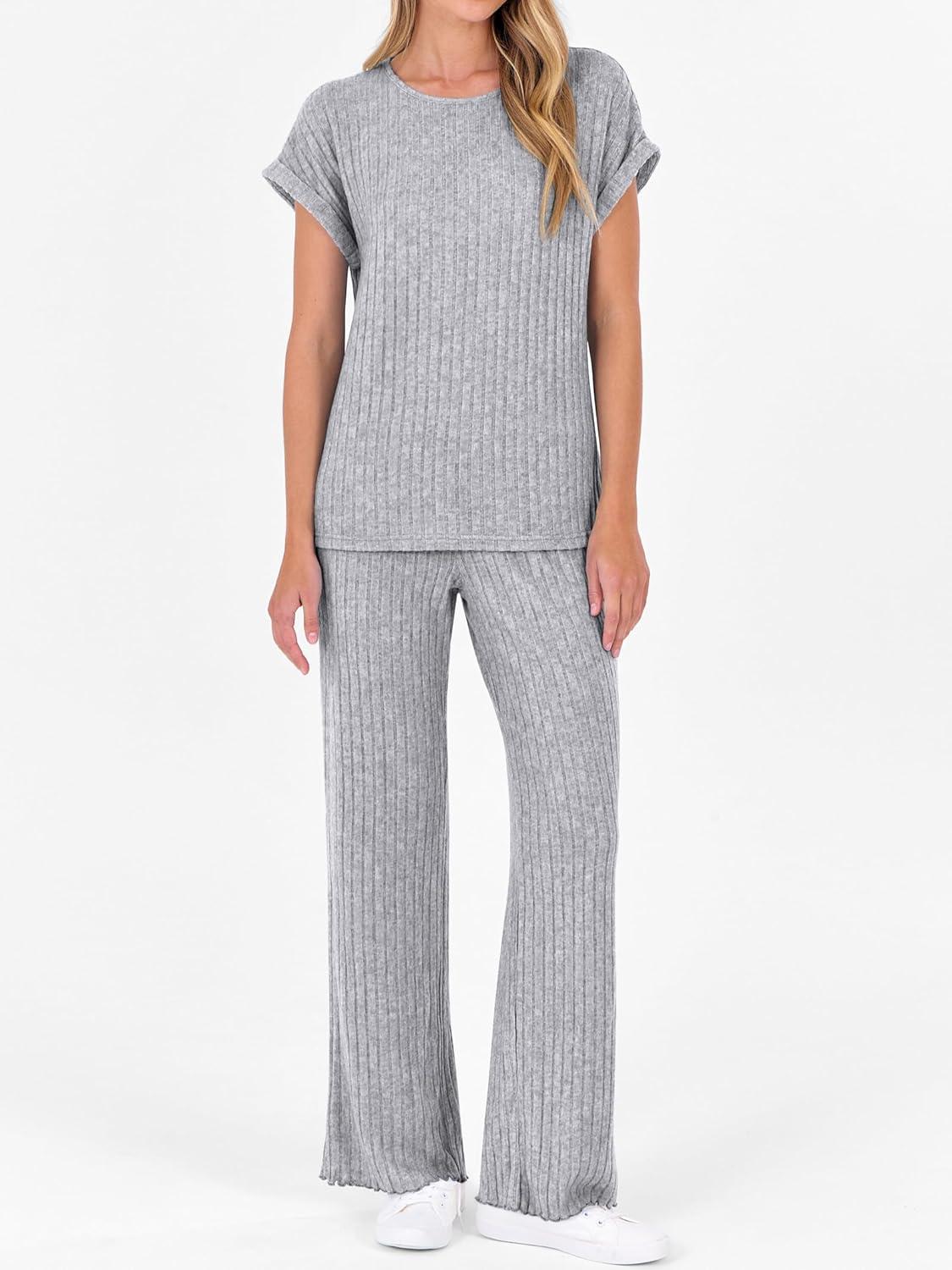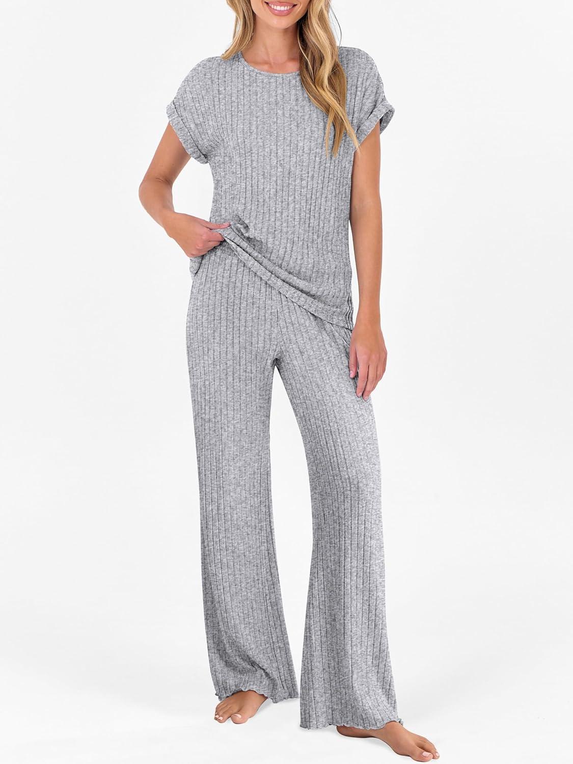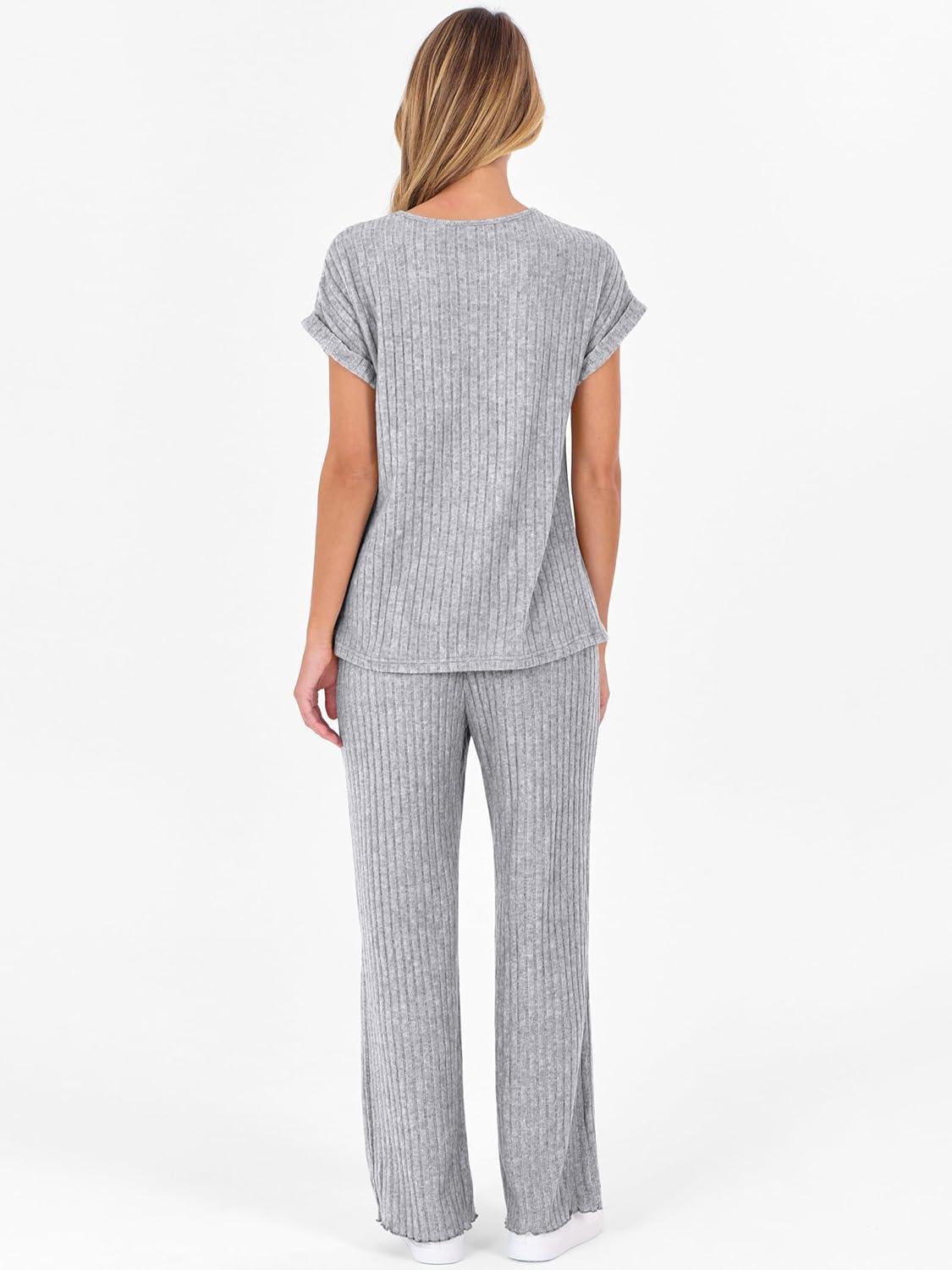 ANRABESS Lounge Sets For Women Fall Ribbed Knit 2 Piece Pajama Sets Casual Short Sleeve Top and Long Pants Matching Outfits(Grey)