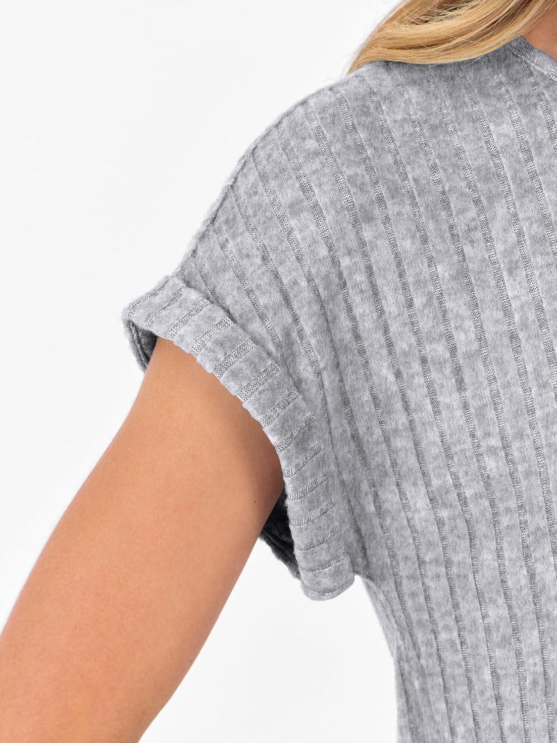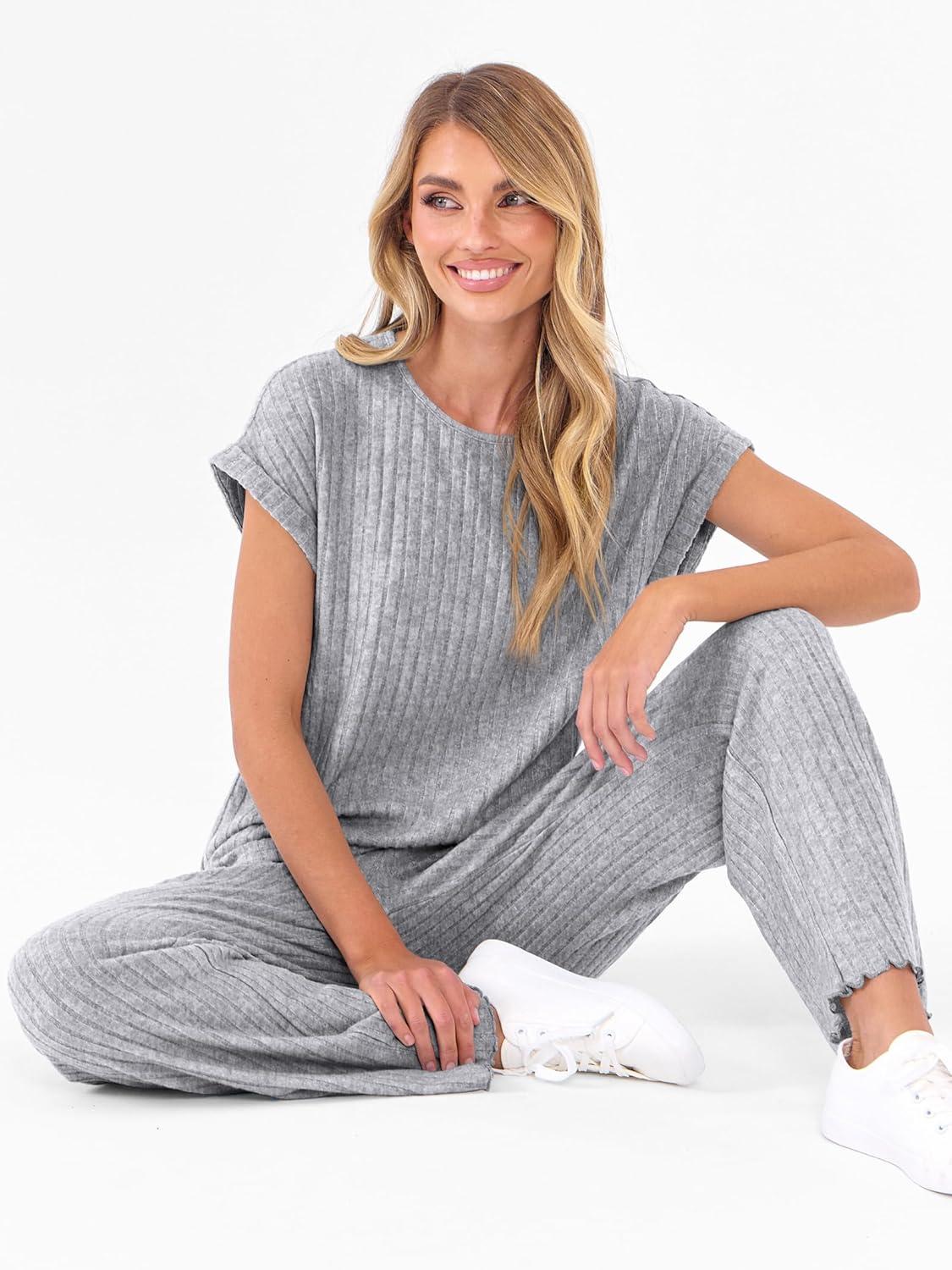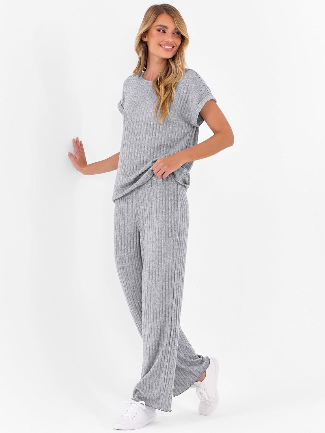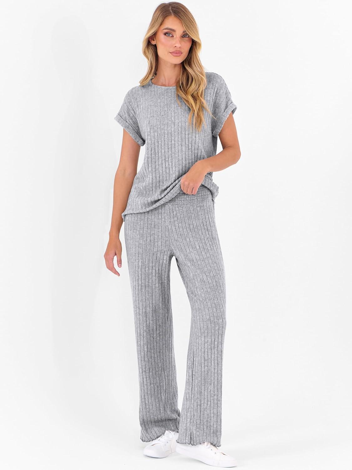 ANRABESS Lounge Sets For Women Fall Ribbed Knit 2 Piece Pajama Sets Casual Short Sleeve Top and Long Pants Matching Outfits(Grey)