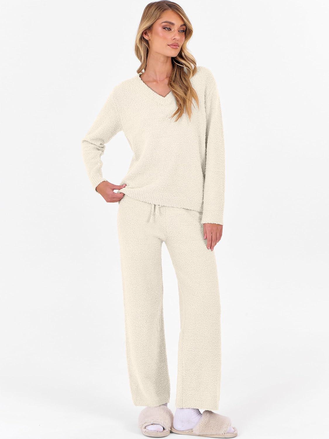 ANRABESS Lounge Sets for Women Fuzzy Fleece Pajama Sets 2 Piece Outfits Cozy Sweater Matching Set 2025 Fall Winter Loungewear(Beige)
