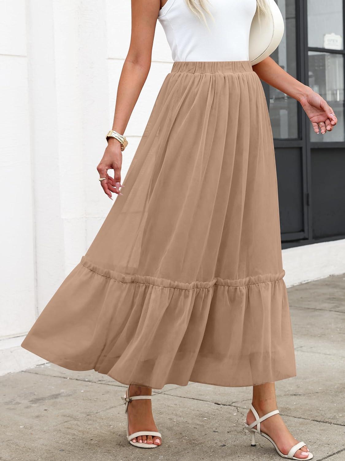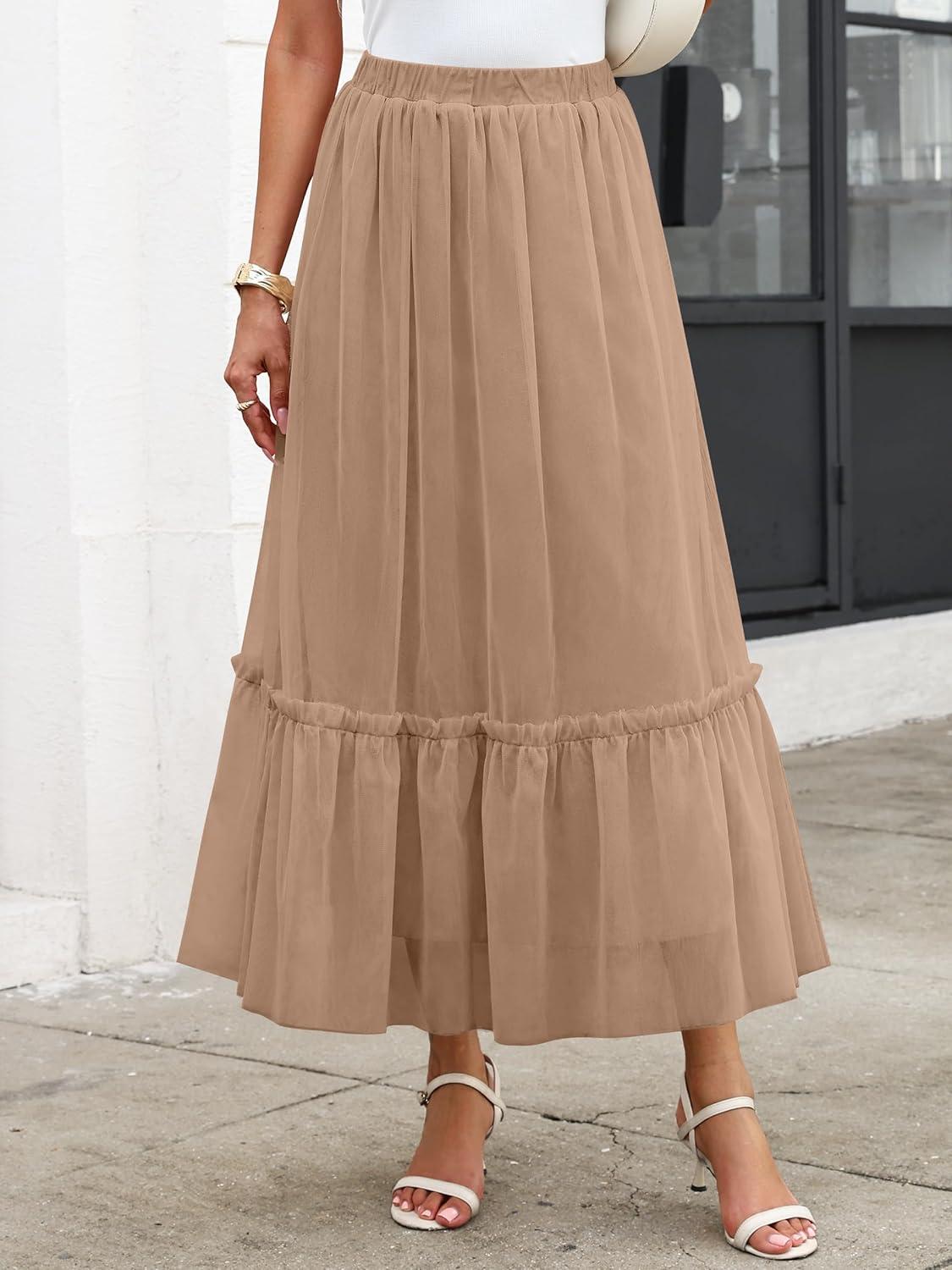 ANRABESS Maxi Skirts for Women Tulle Long Tiered Elastic High Waisted A Line Flowy Dressy Casual Skirt 2025 Fall Trendy(Nutmeg)