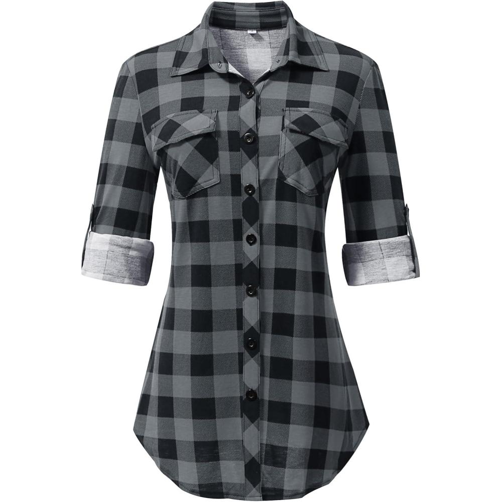 imageANRABESS Plaid Button Down Shirts for Women Long Sleeve Roll Up Checkered Blouse Tops 2025 Fall OutfitsBlack Plaid